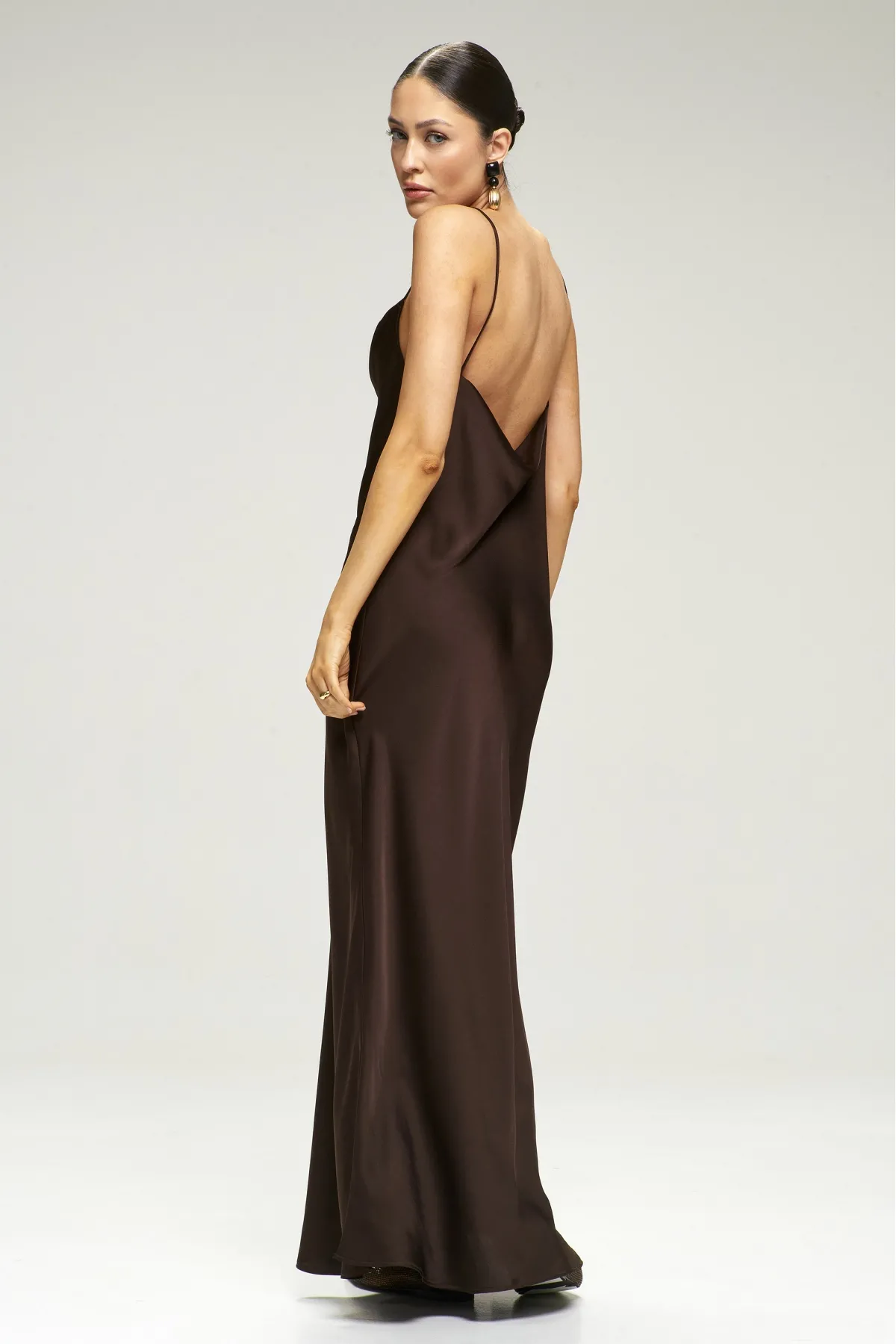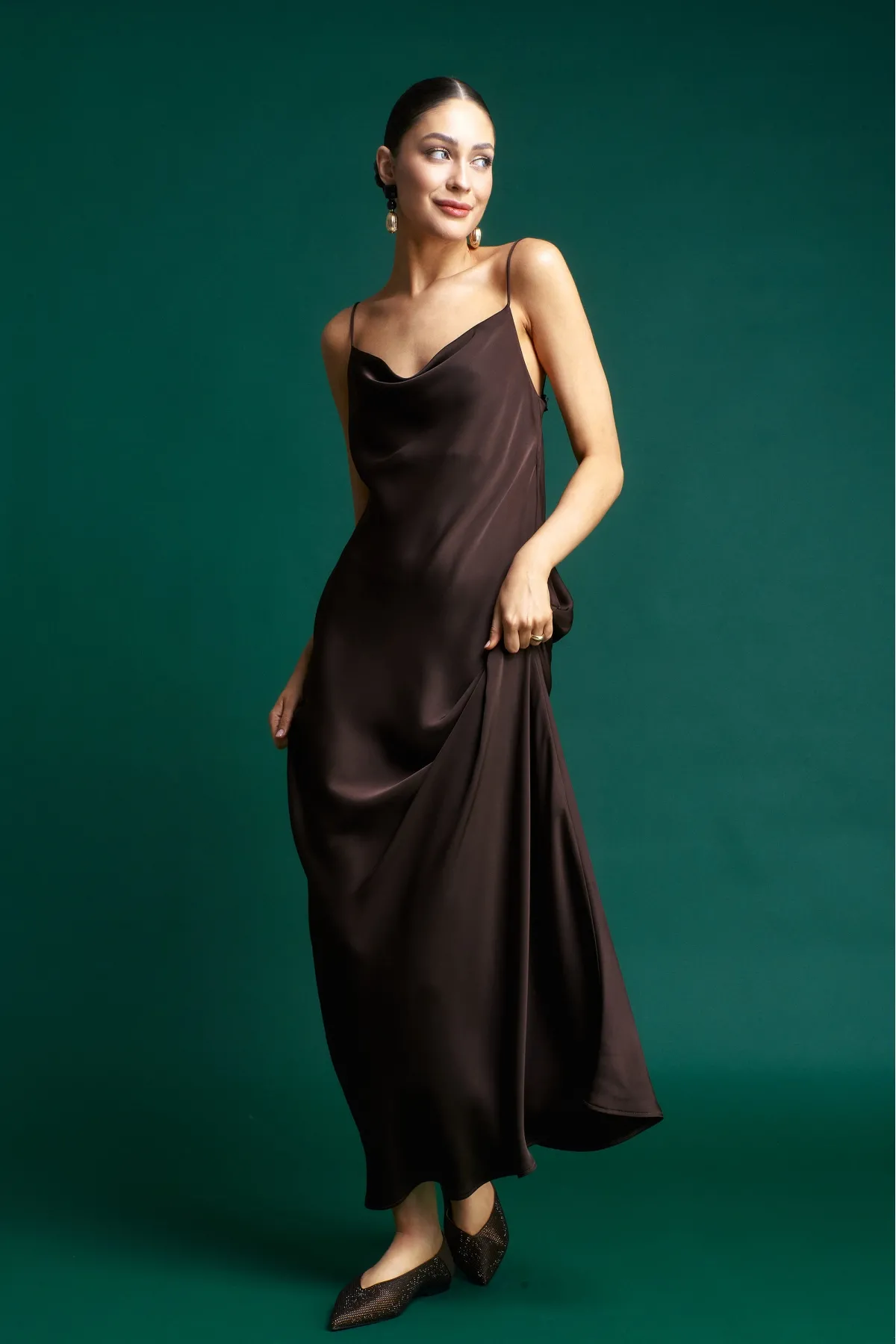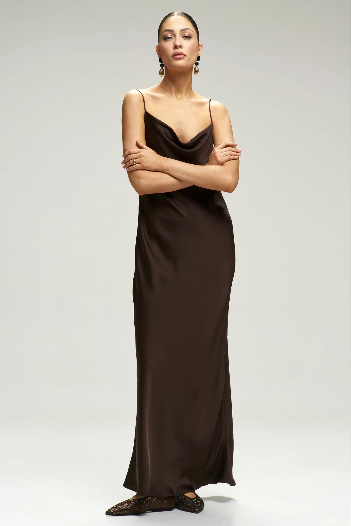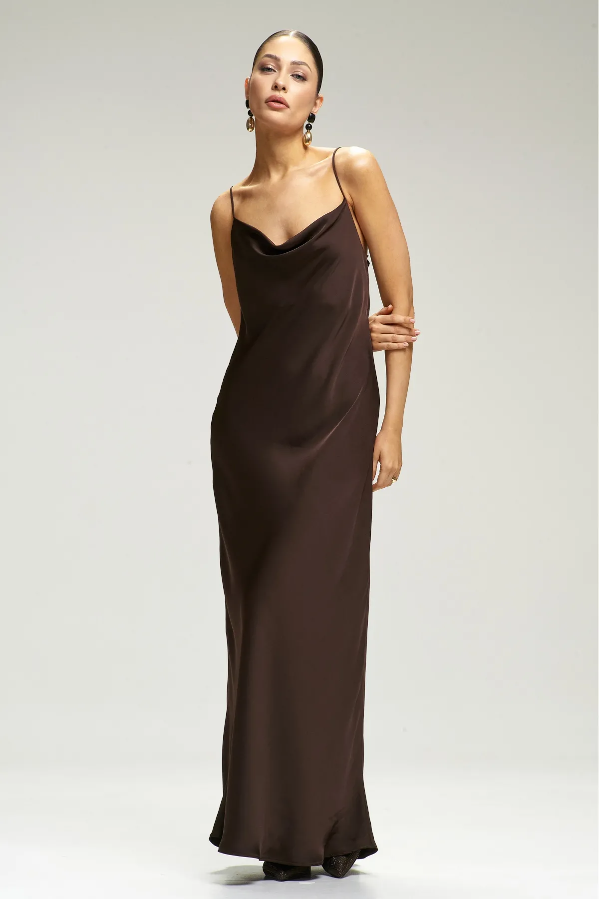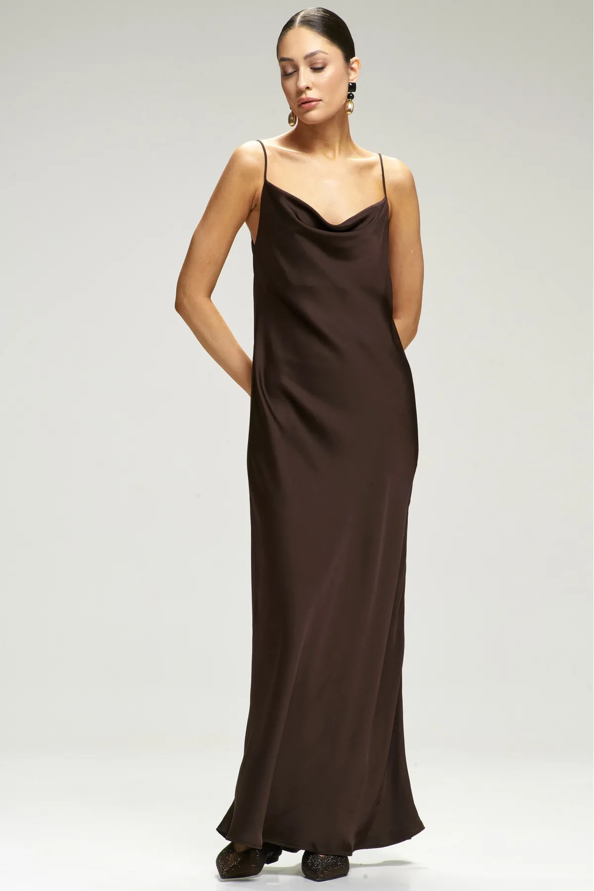 Платье‑комбинация на тонких бретелях из новогодней коллекции — атласное, струящееся, в пол, с открытой спиной и деликатными бретелями, создаёт невероятно эффектный и элегантный образ. Лёгкая ткань плавно облегает силуэт при движении, придавая образу лёгкость и вечернюю торжественность.