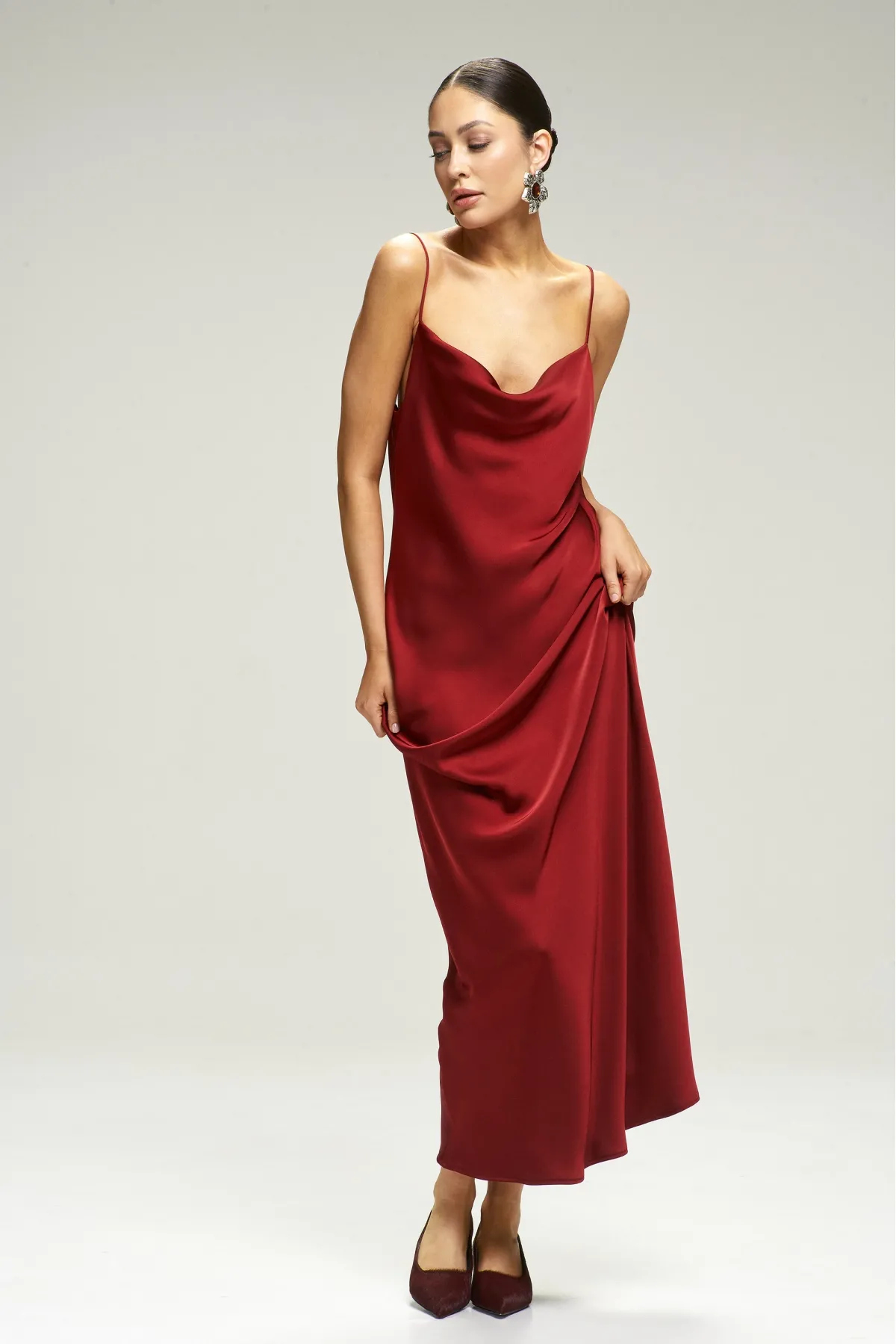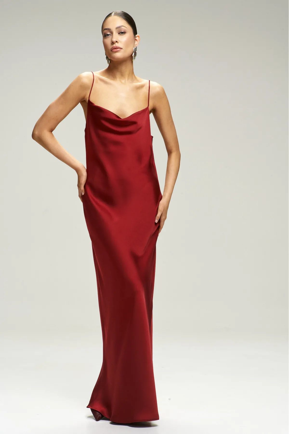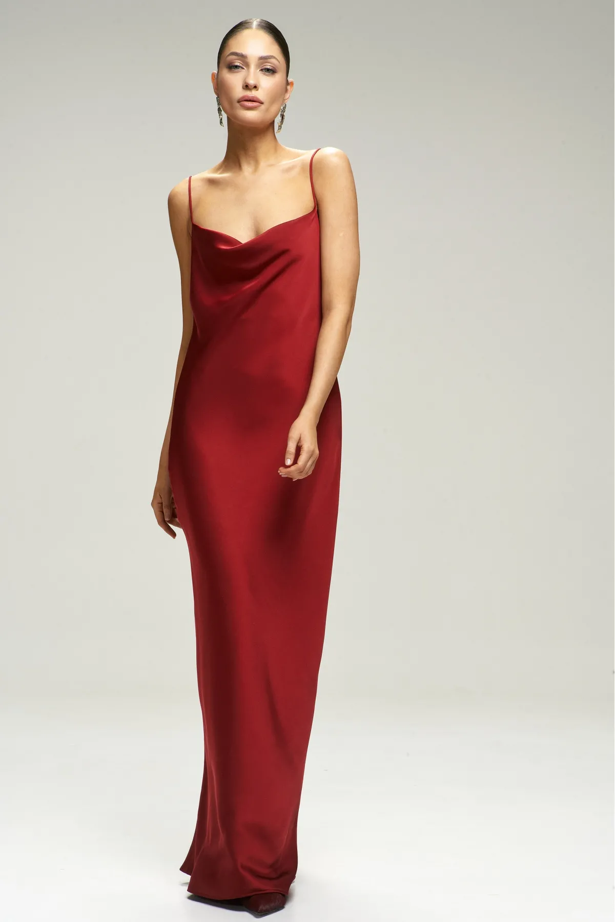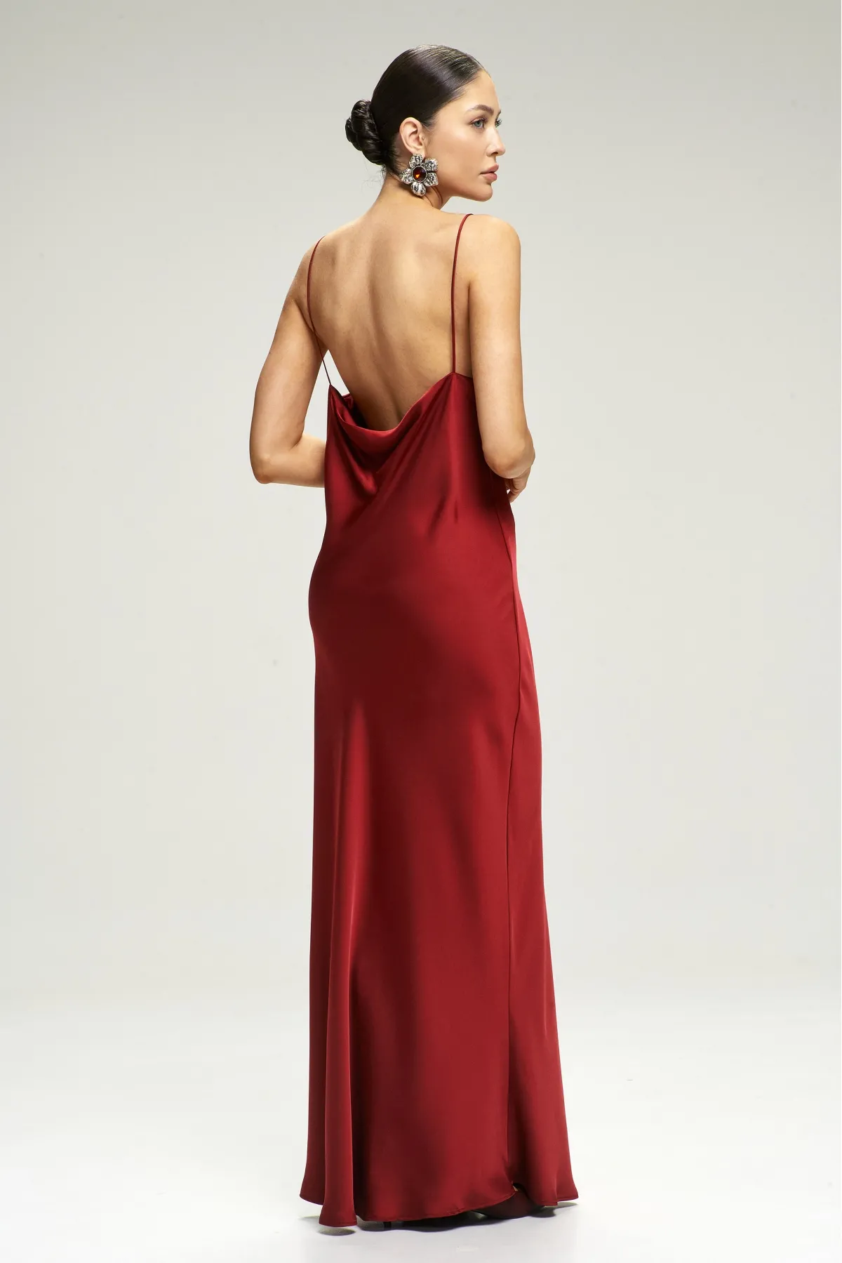 Платье‑комбинация на тонких бретелях из новогодней коллекции — атласное, струящееся, в пол, с открытой спиной и деликатными бретелями, создаёт невероятно эффектный и элегантный образ. Лёгкая ткань плавно облегает силуэт при движении, придавая образу лёгкость и вечернюю торжественность.