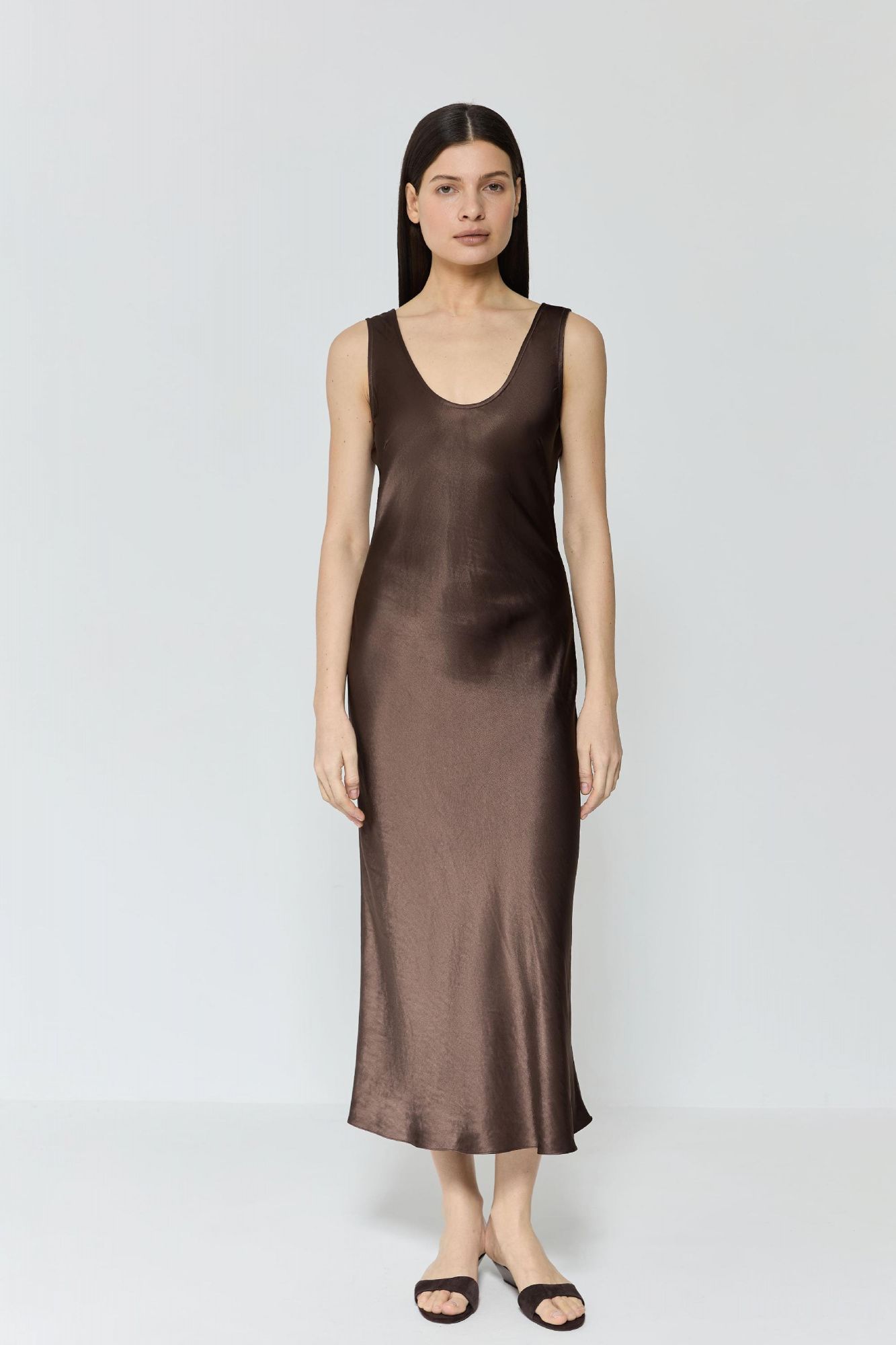 Платье-комбинация длины миди сшито из смесовой атласной вискозы.