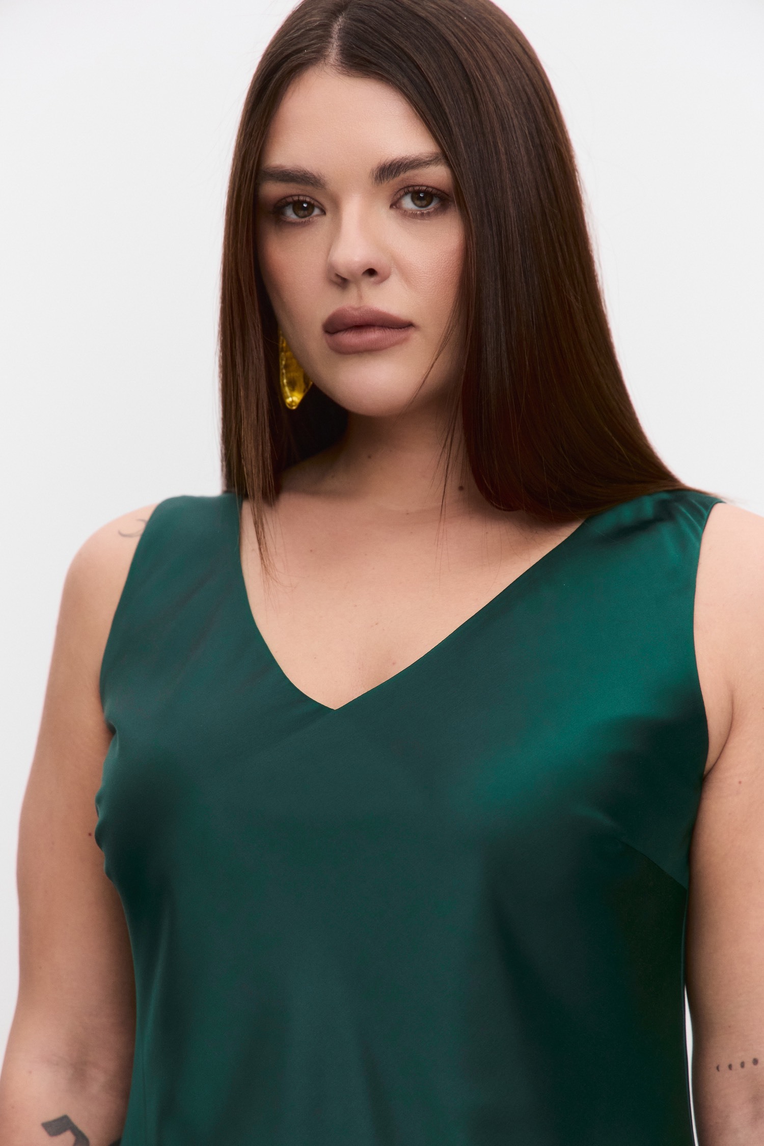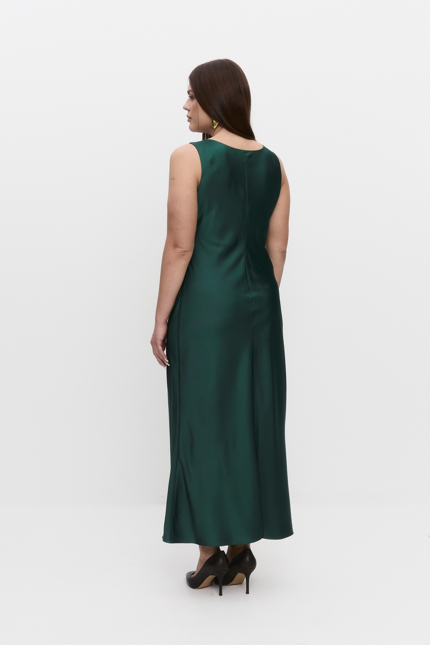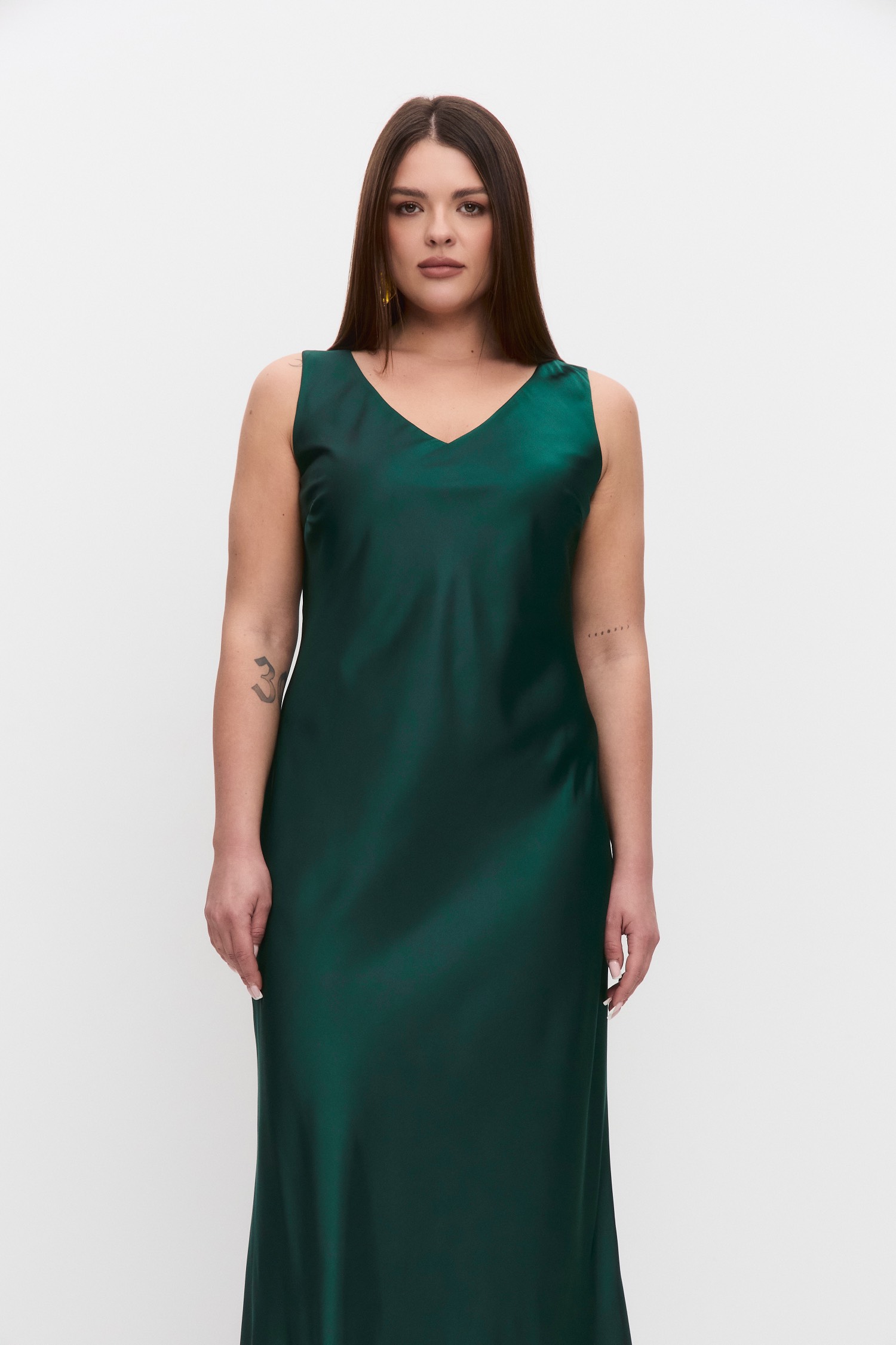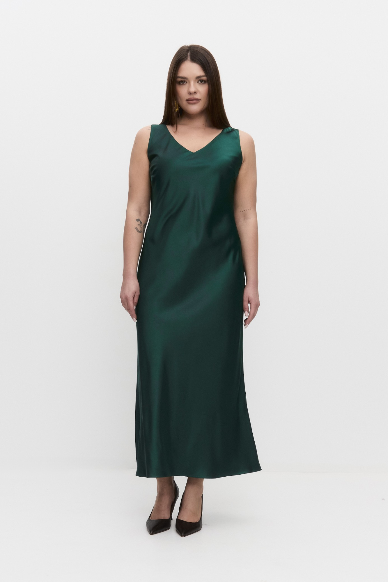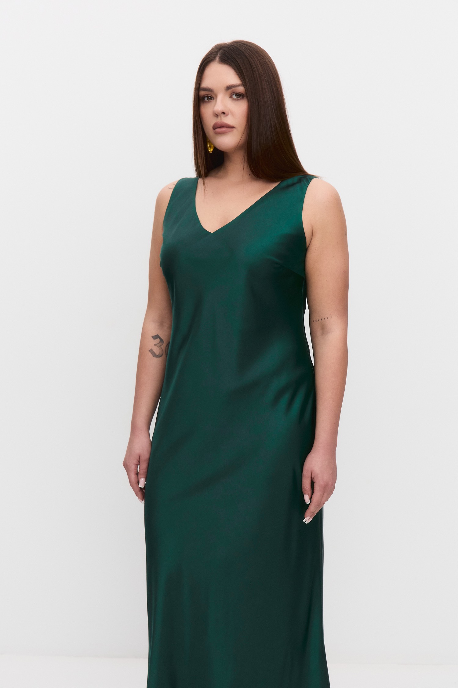 Женское платье выполнено из гладкой струящейся ткани с легким блеском. Ткань мягко облегает фигуру, создавая элегантный и утонченный образ. Классический крой и длина платья делают его универсальным для различных мероприятий — от вечерних выходов до торжеств. V-образный вырез визуально удлиняет шею. Лаконичный дизайн делает платье стильным и актуальным вне времени.