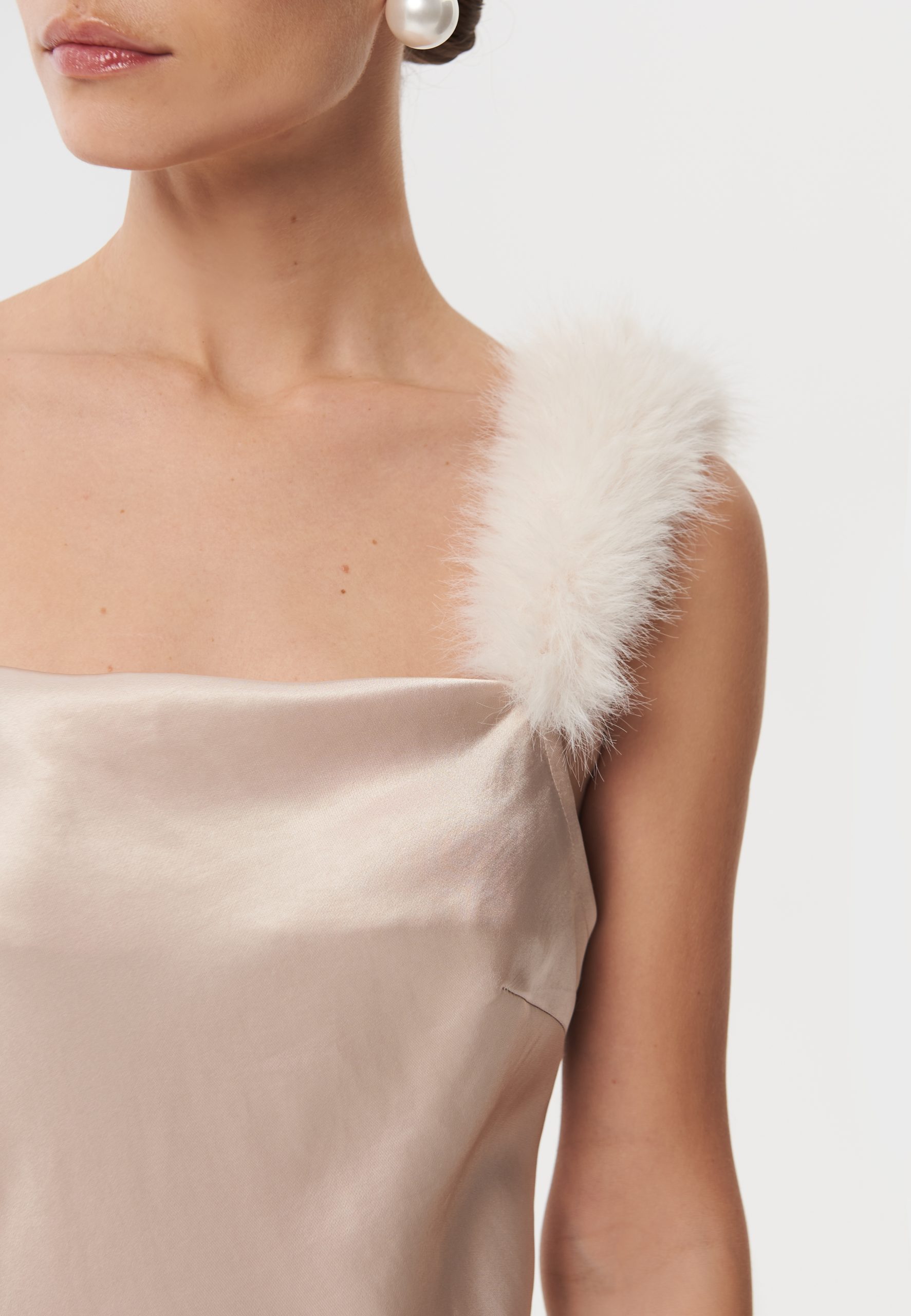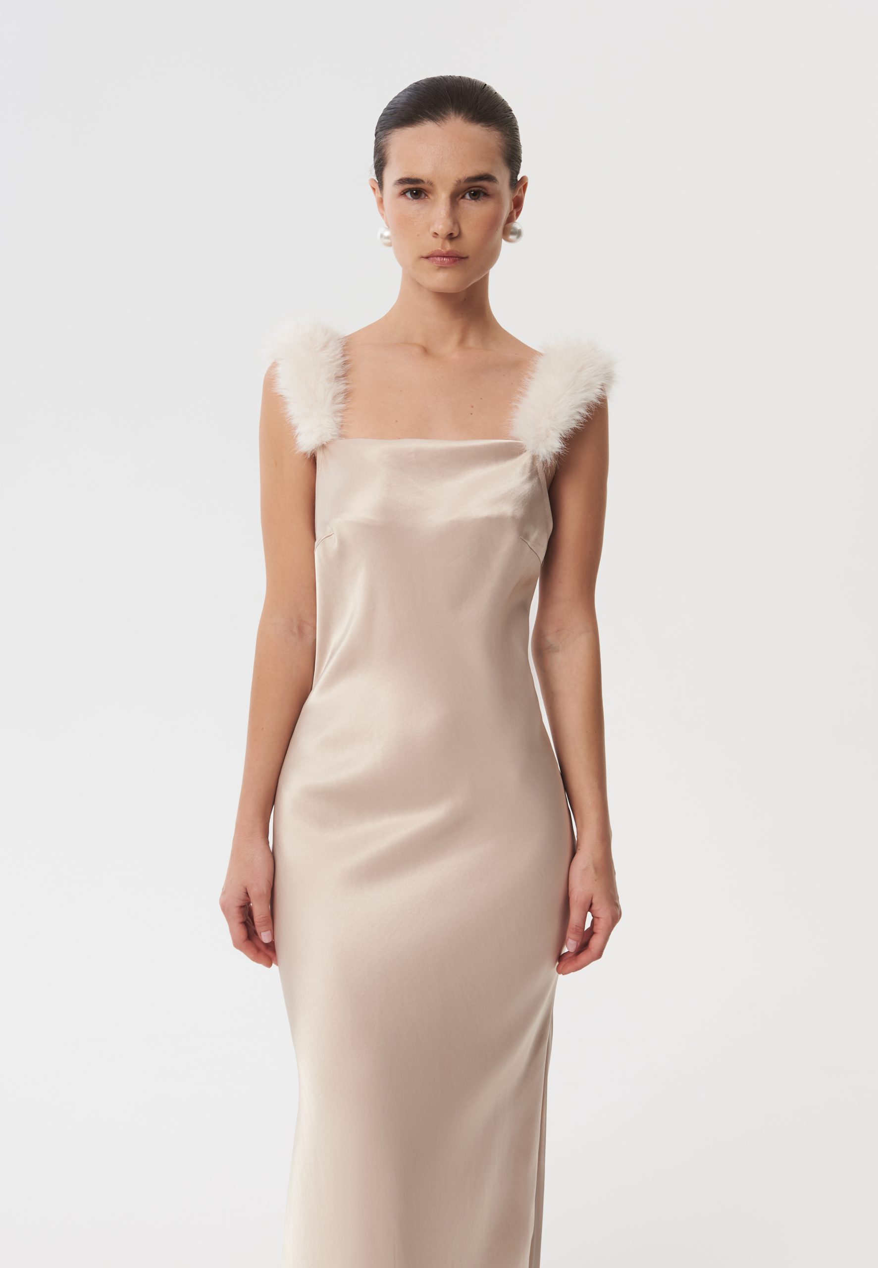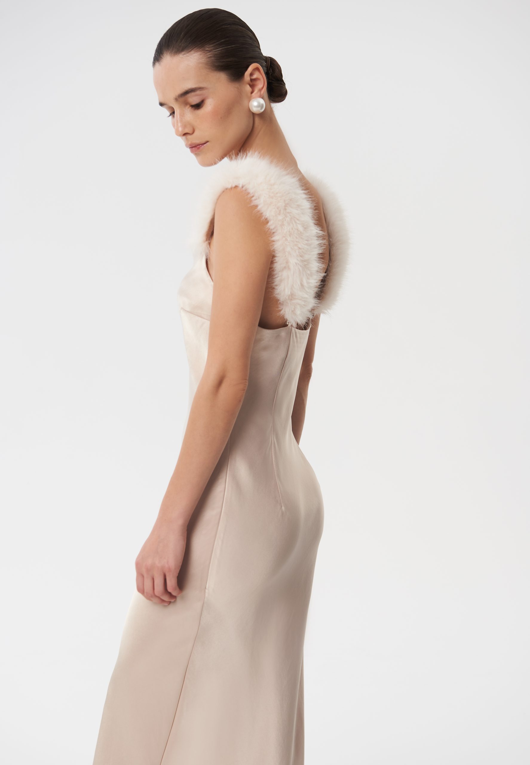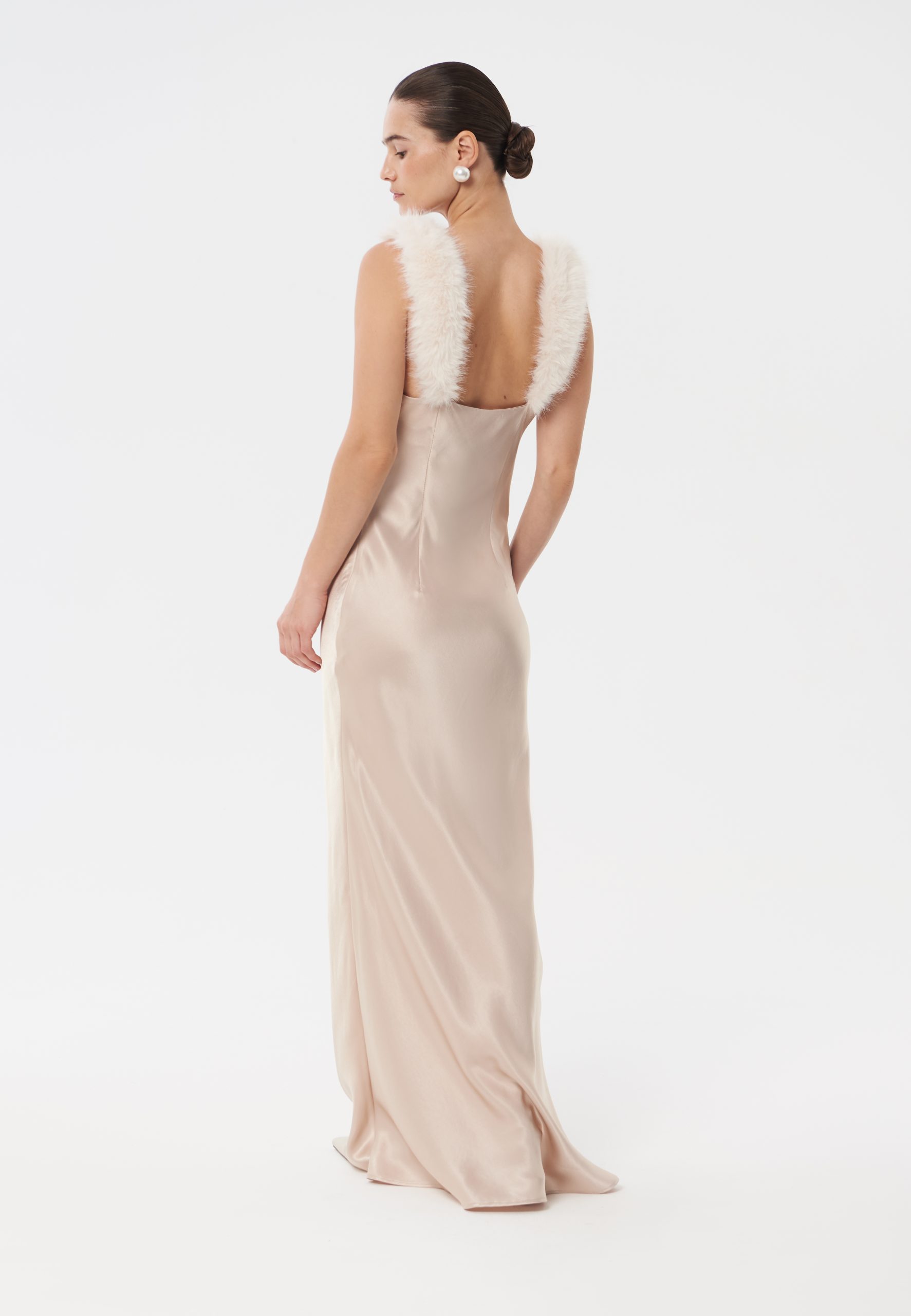 Платье макси Sphinx — это утонченное и изысканное изделие, выполненное из гладкой вискозы в красивом телесном оттенке. Прилегающий силуэт платья и бретели из искусственного меха добавляет нотки роскоши, делая это платье идеальным выбором для особых случаев. Застегивается на потайную молнию сбоку.