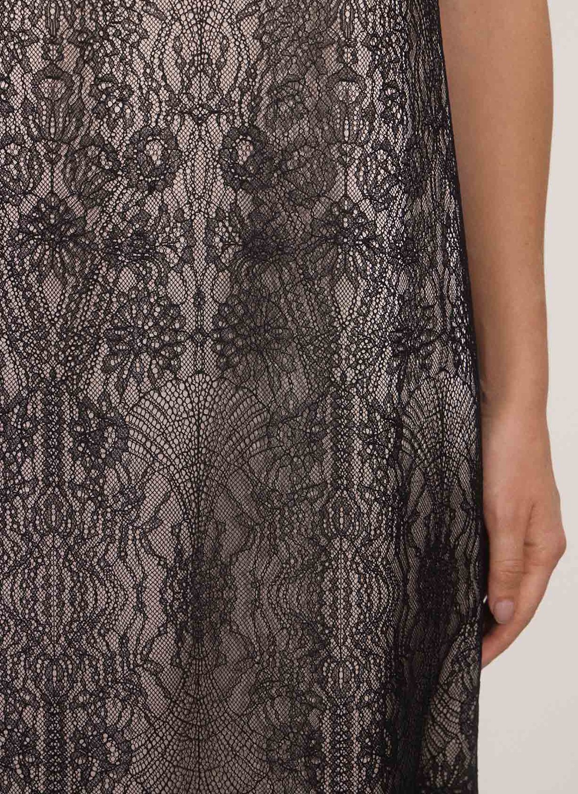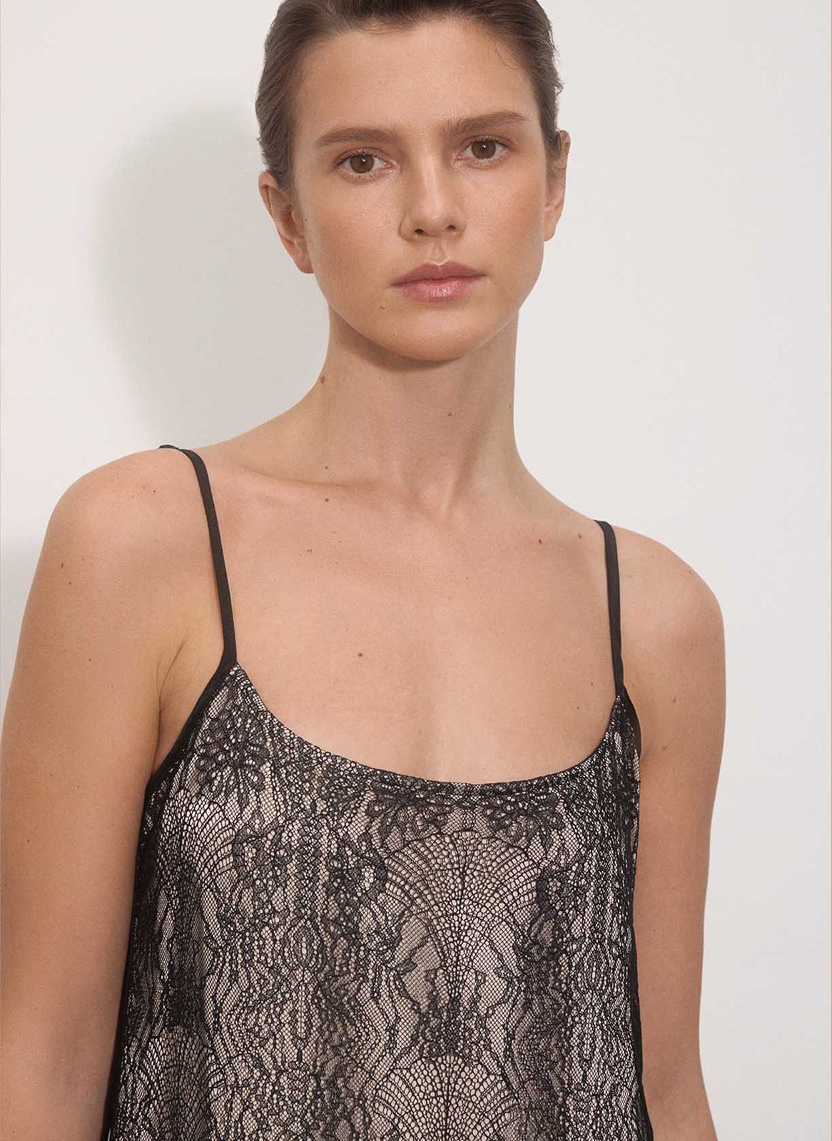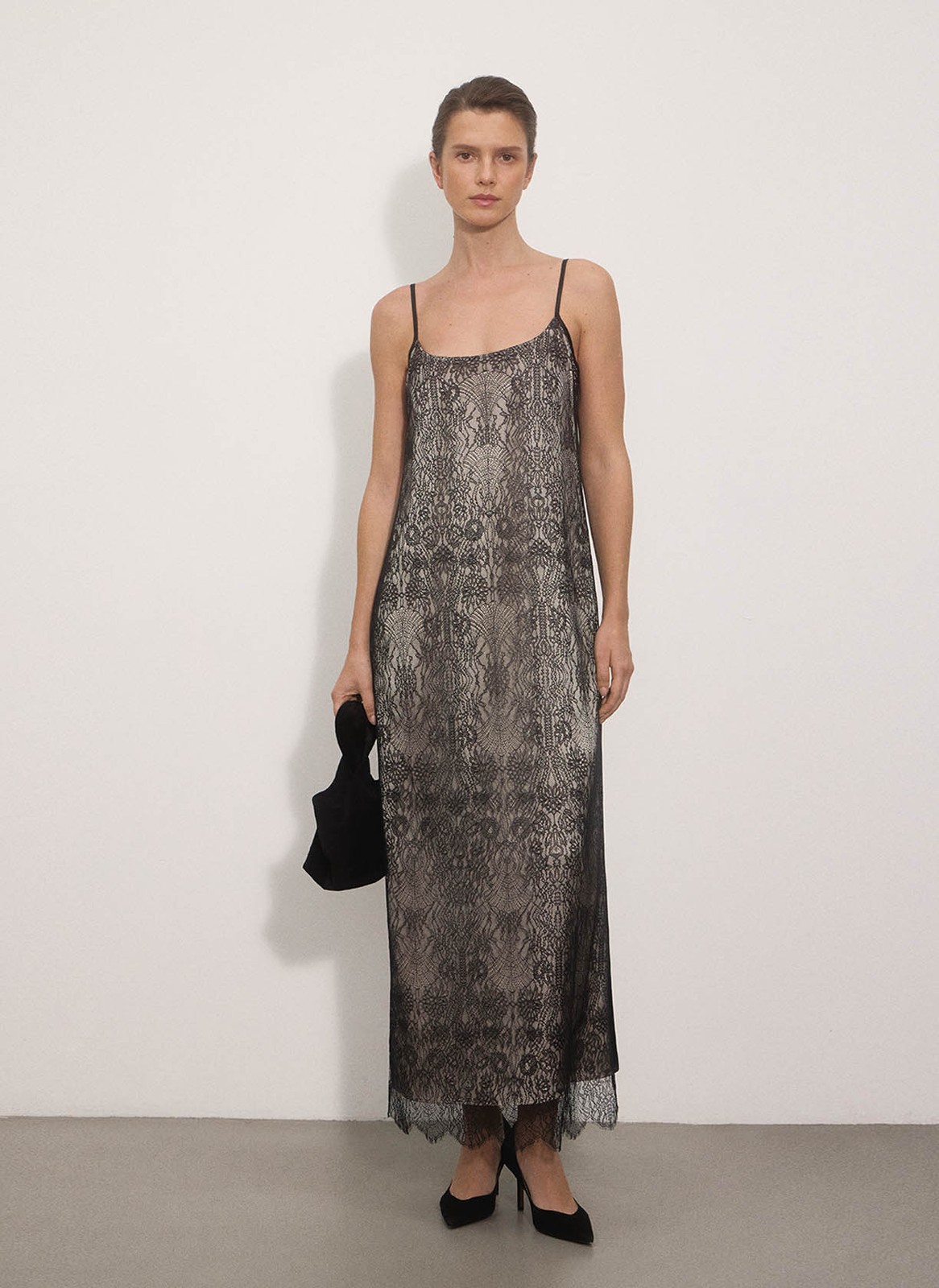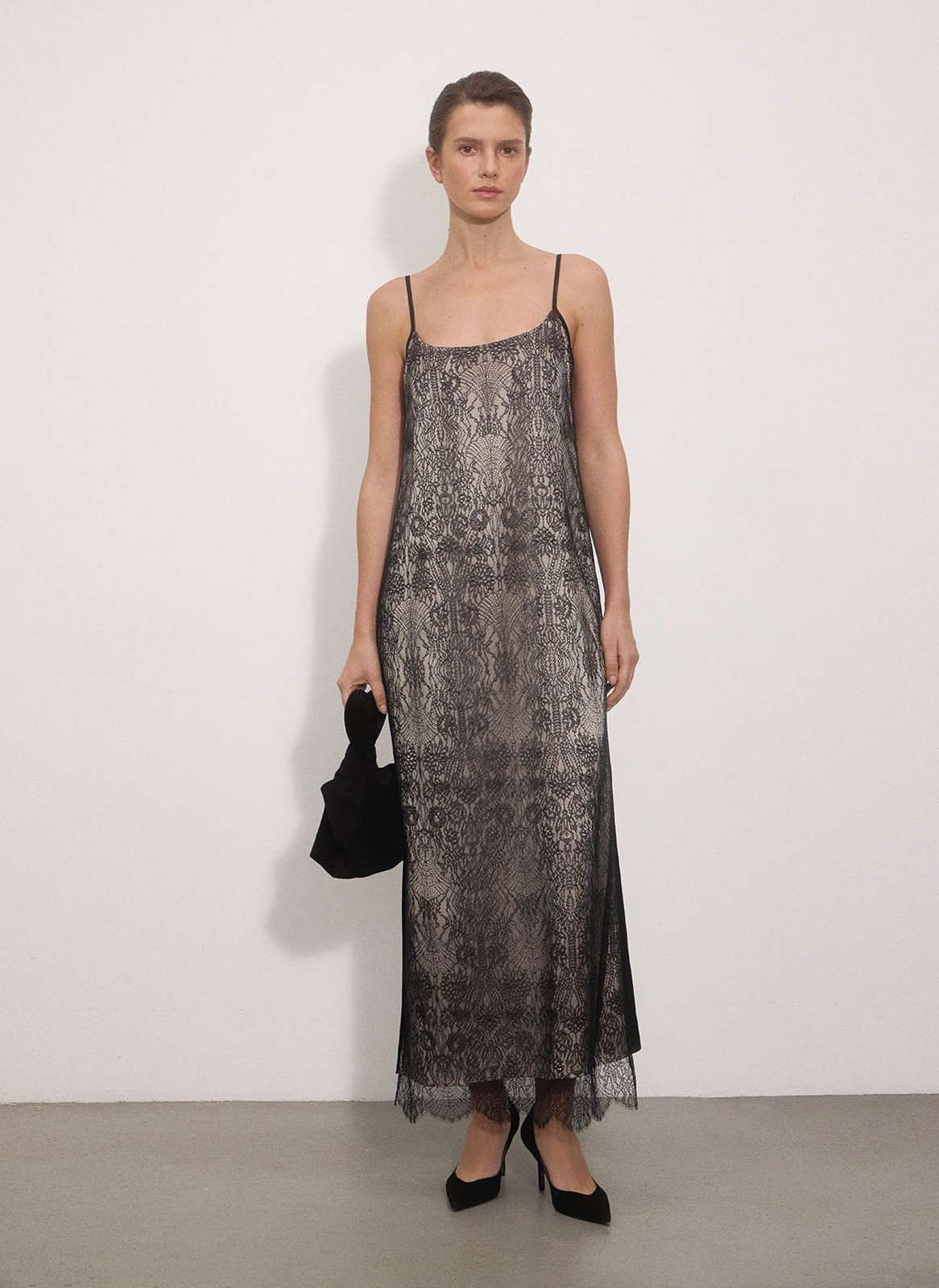 Модель на тонких бретелях приковывает взгляд благодаря контрастной светлой подкладке спереди. Изящное кружево создаёт неповторимый узор, который мягко перекликается с атласной тканью. Спинка выполнена из гладкого темного атласа в тон кружева, создавая изысканный контраст и подчёркивая линии фигуры. Длина миди и элегантный разрез по левому боковому шву добавляют образу нотку смелости и женственности.