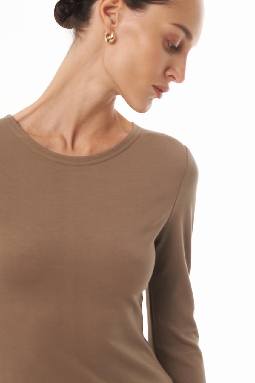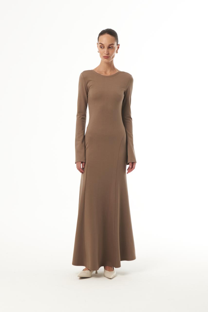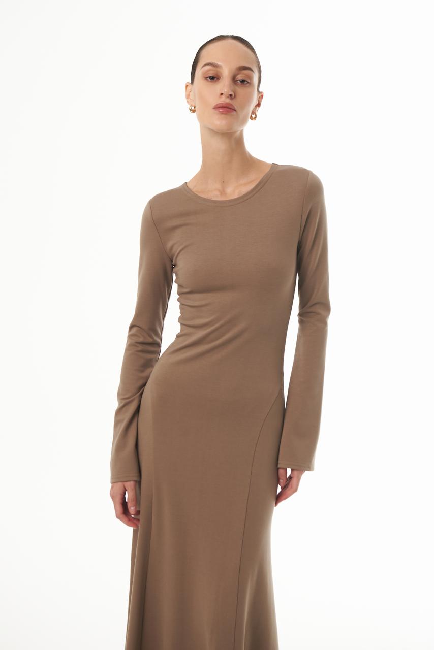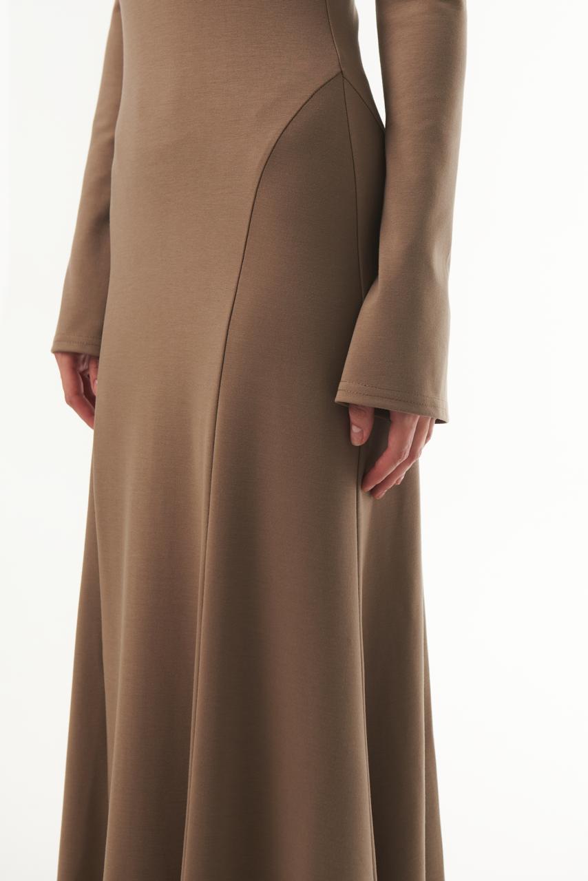 Трикотажное платье малого объёма, приталенного силуэта, расширенное к низу, c клиньями по бокам, длиной до щиколотки. Рукав втачной, одношовный, расклешенный к низу, длиной ниже линии запястья.