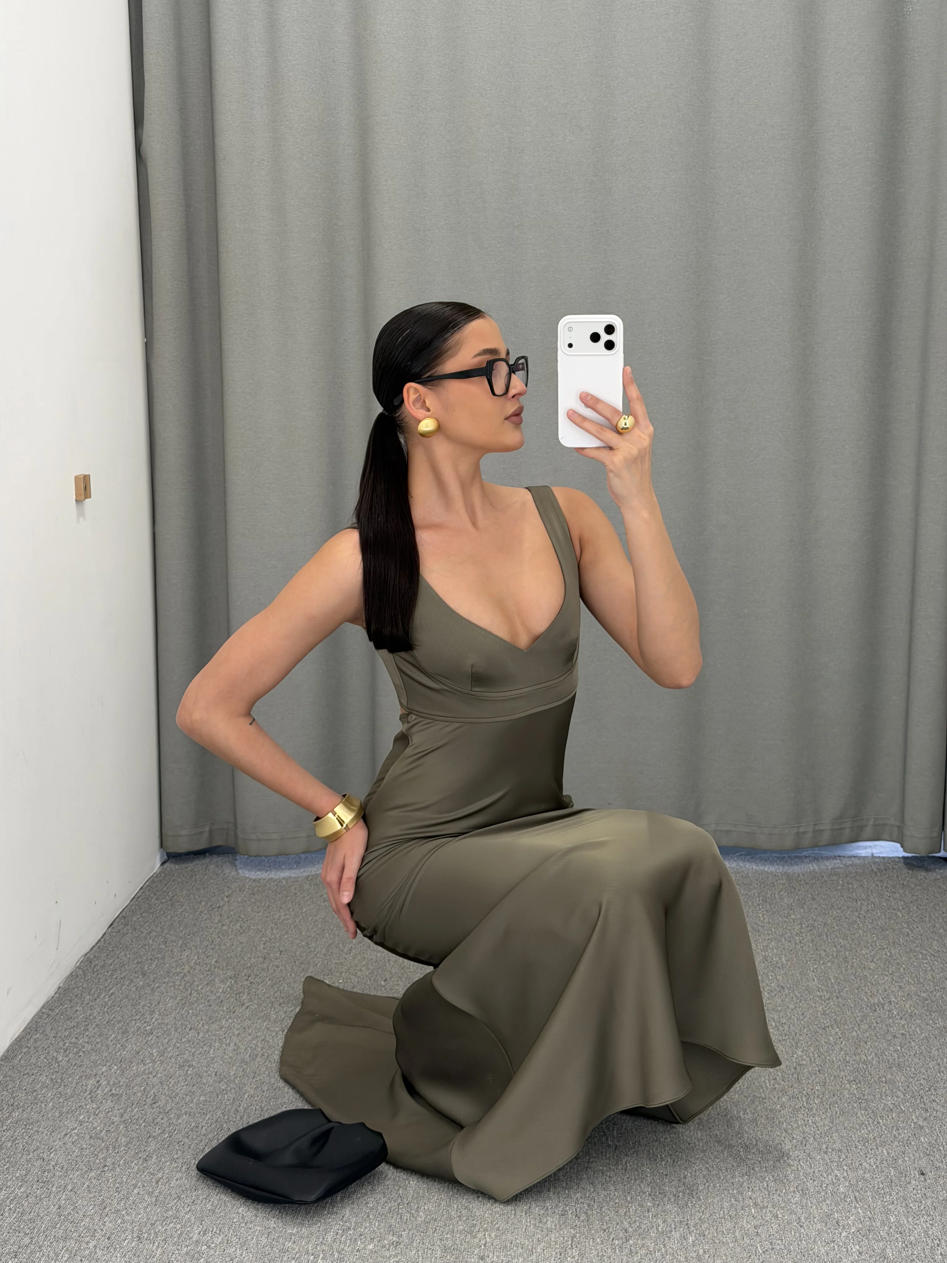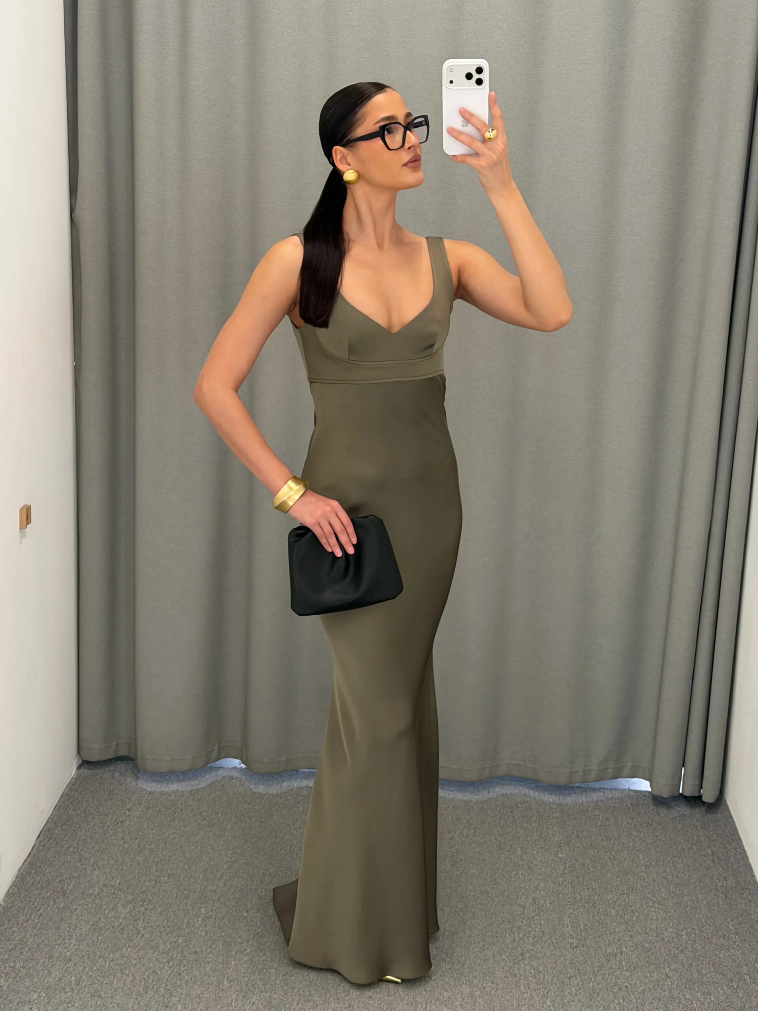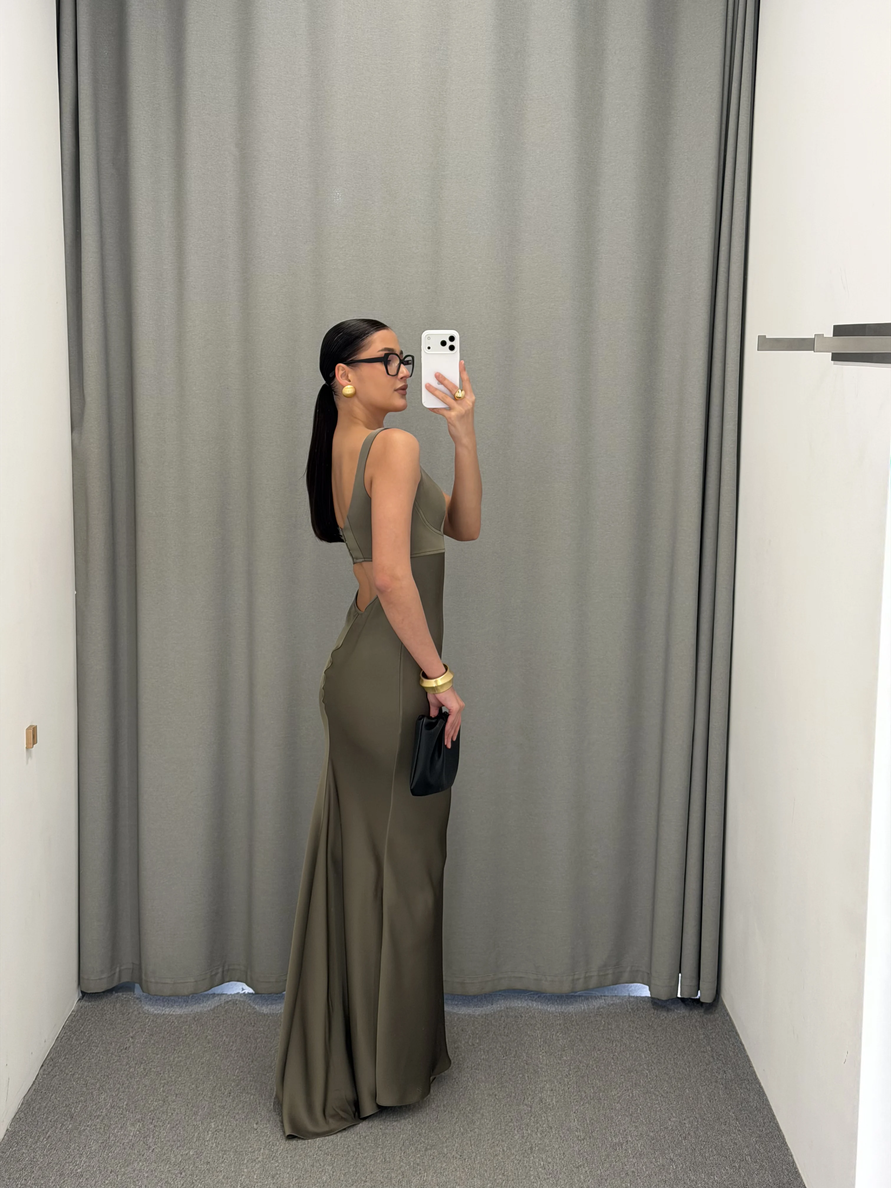 Глубокий вырез, облегающий крой и плавный шлейф создают образ, где женственность встречается с дерзостью. Открытая спина и бретели добавляют игривости, а насыщенный оливковый оттенок — утончённости. Идеально для вечеринок, свиданий или просто чтобы почувствовать себя королевой любого вечера.
