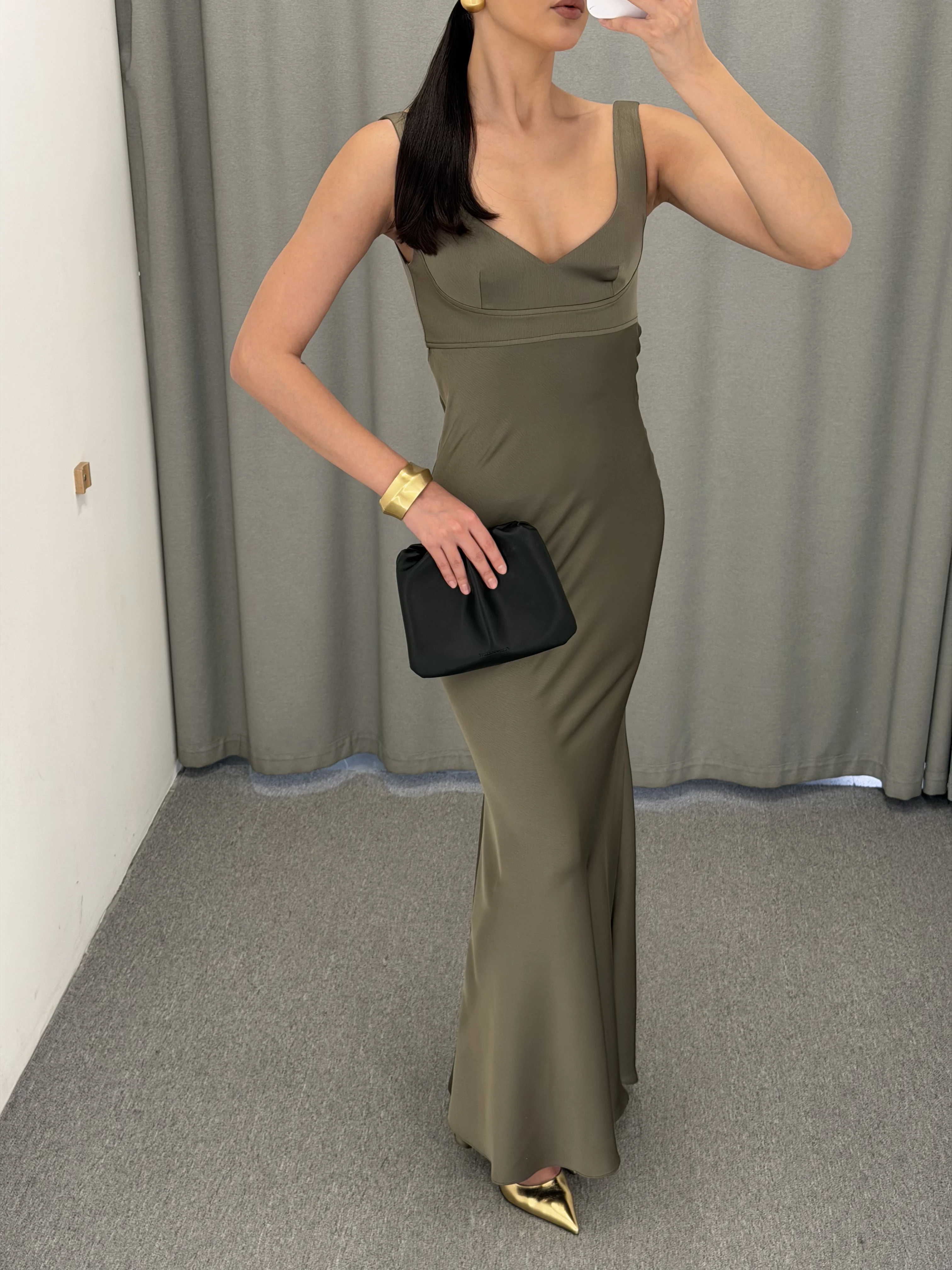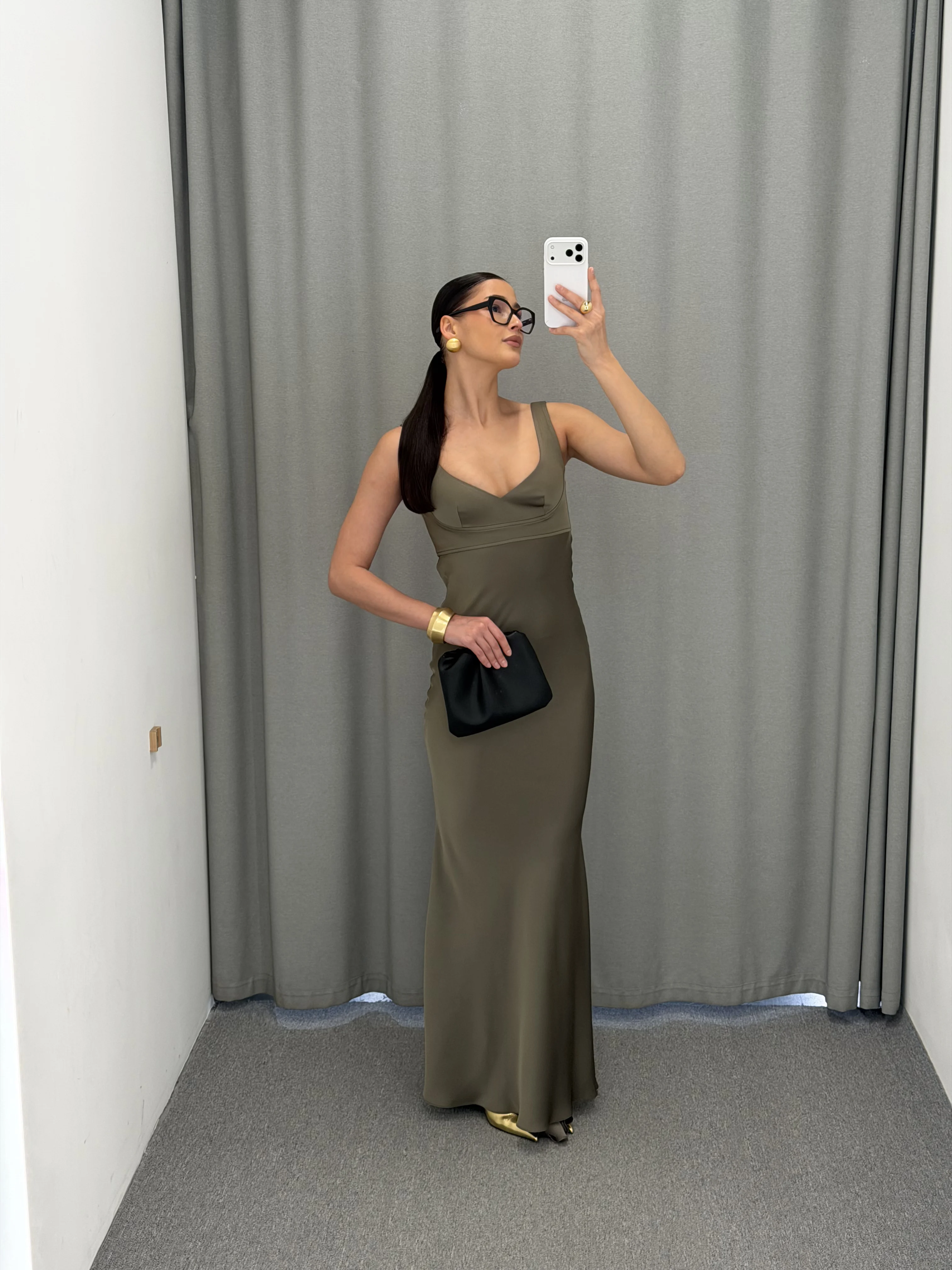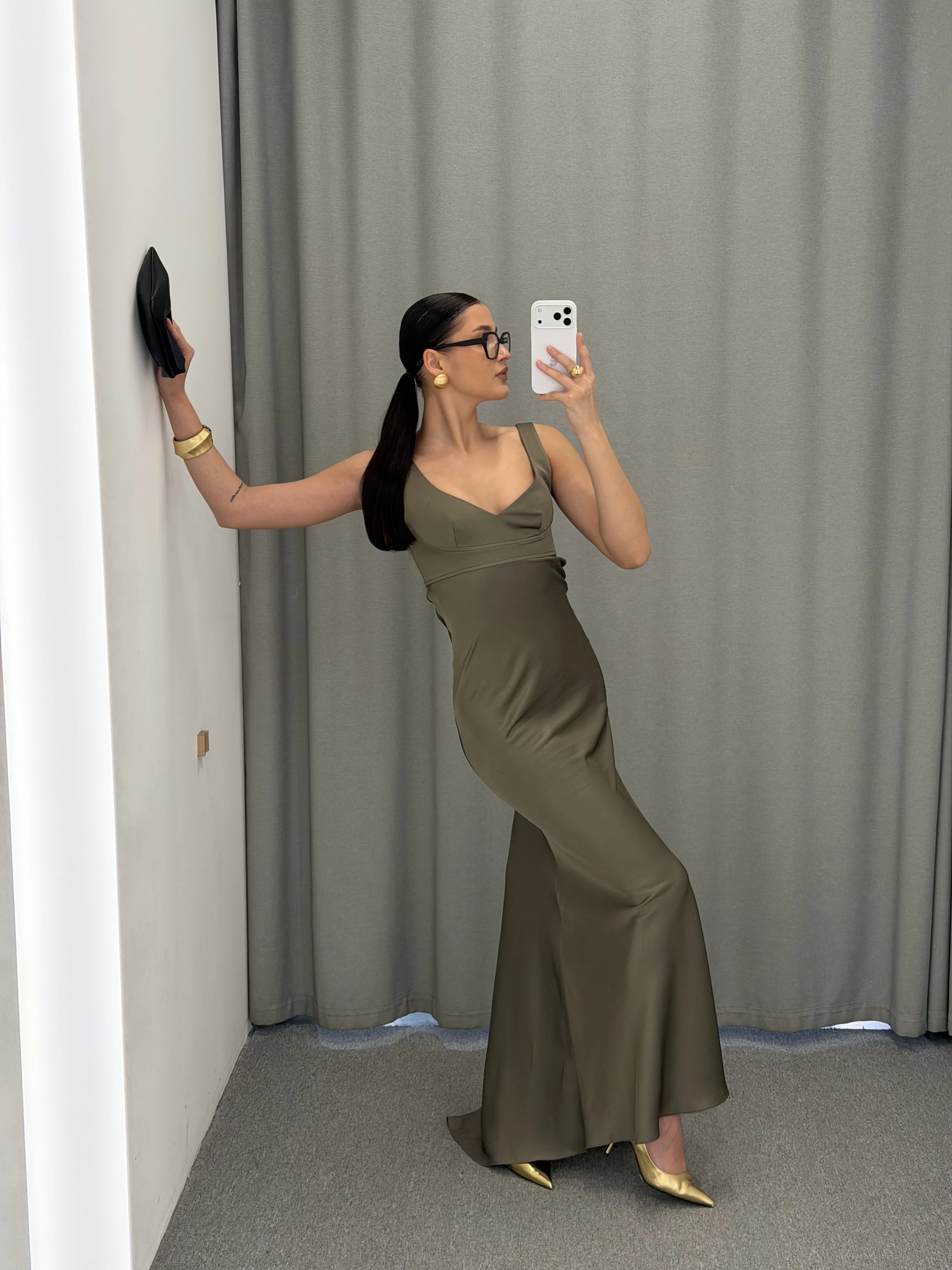 Глубокий вырез, облегающий крой и плавный шлейф создают образ, где женственность встречается с дерзостью. Открытая спина и бретели добавляют игривости, а насыщенный оливковый оттенок — утончённости. Идеально для вечеринок, свиданий или просто чтобы почувствовать себя королевой любого вечера.