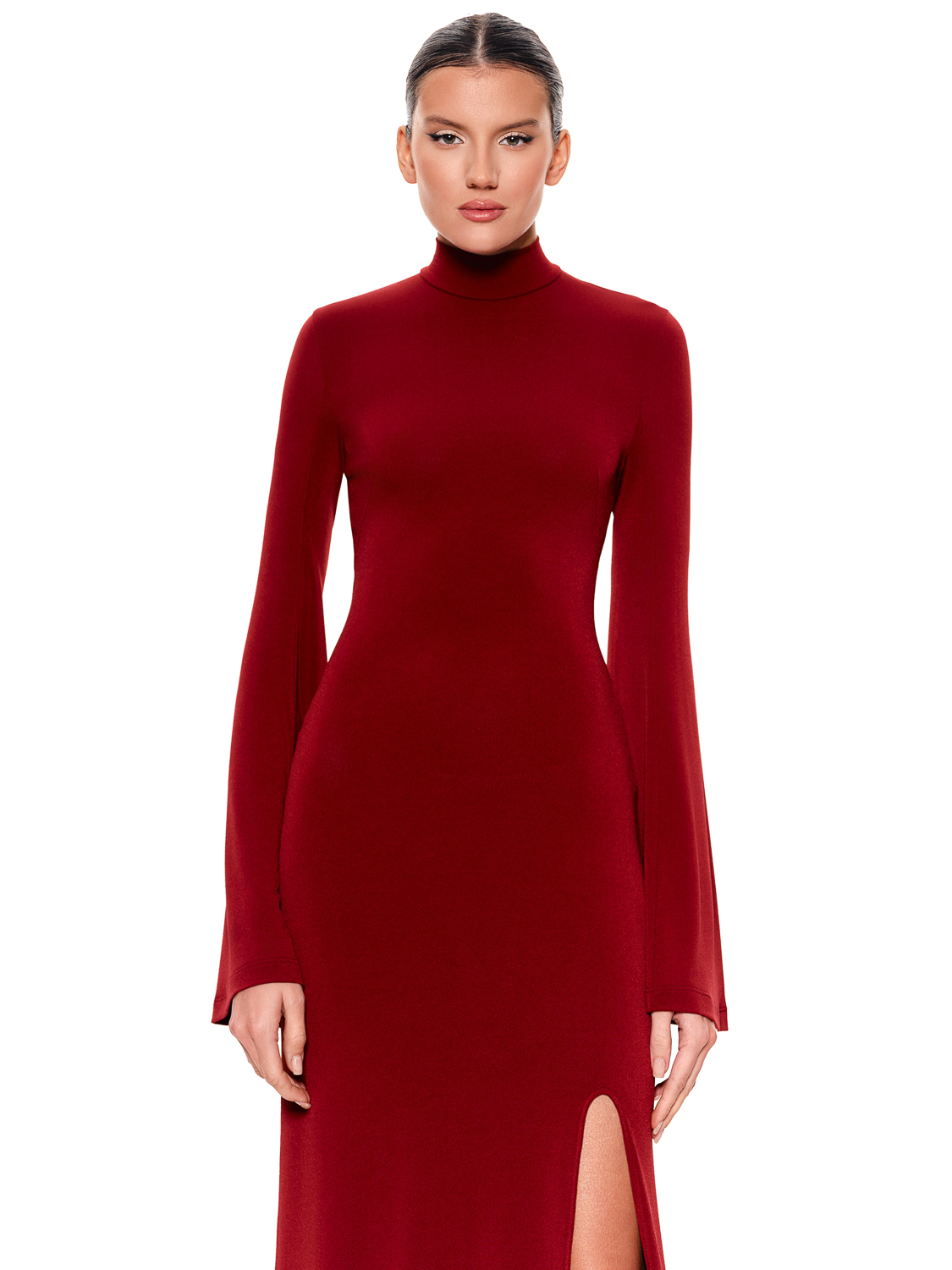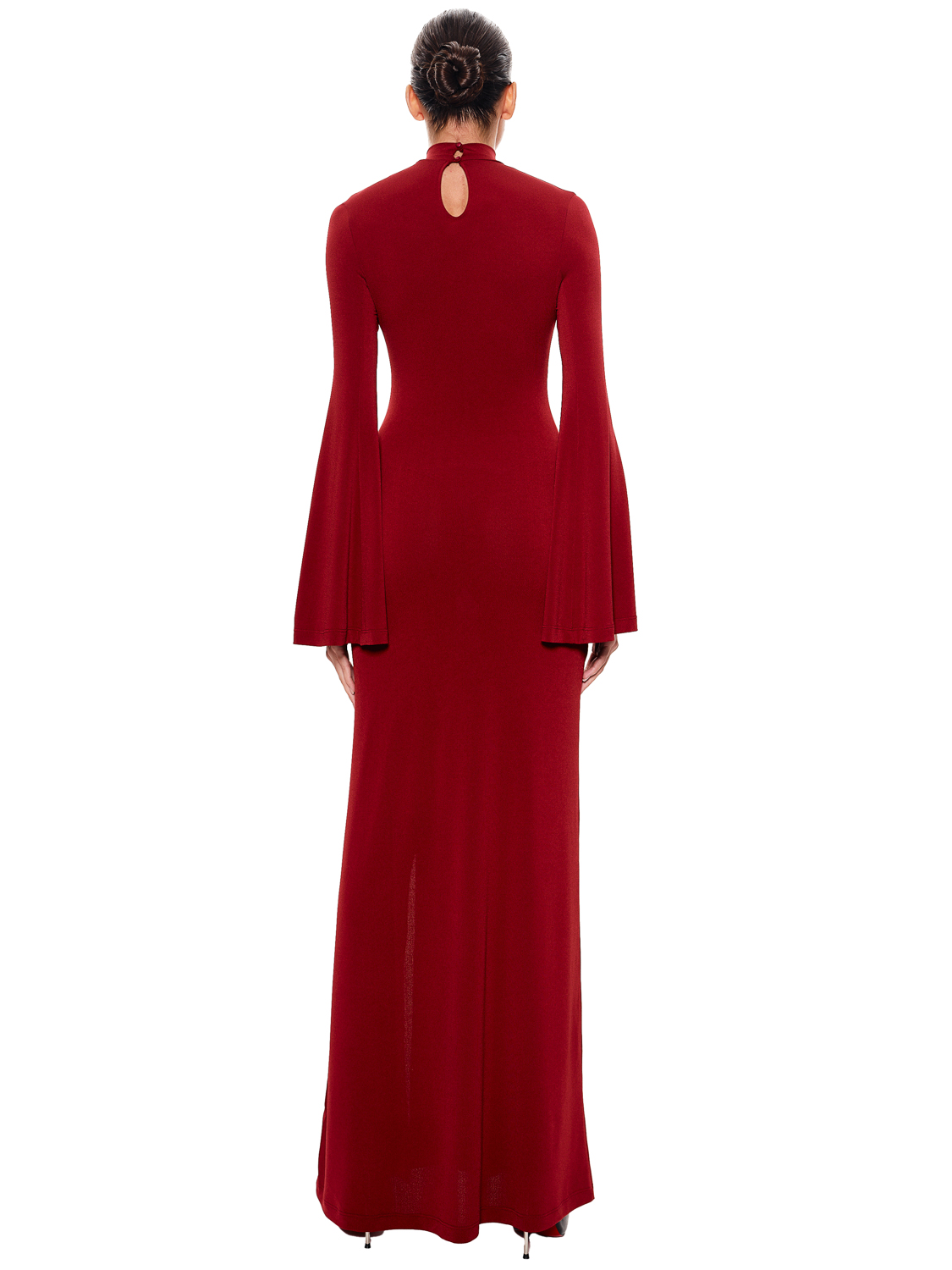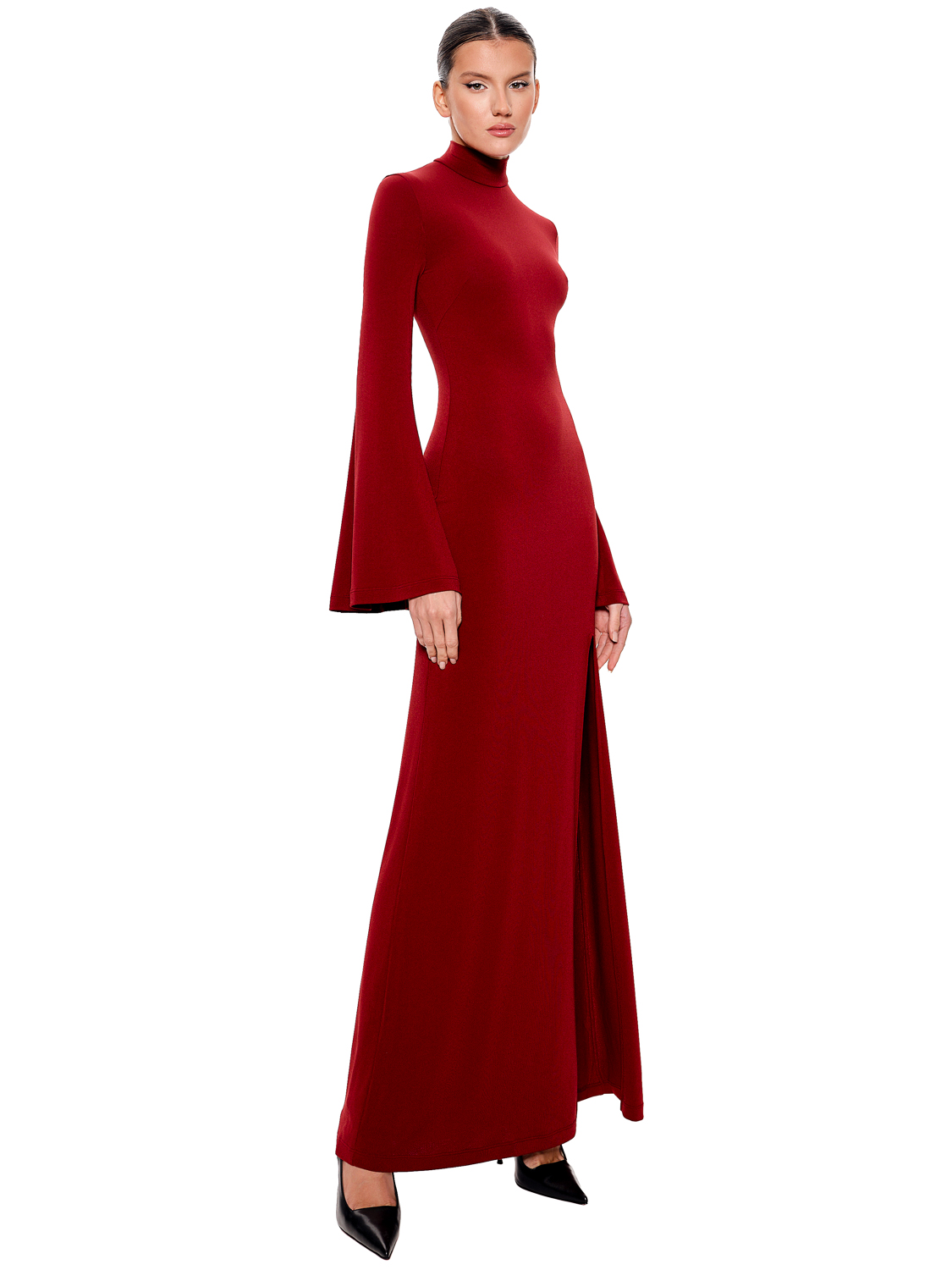 Платье в длине макси облегающего кроя выполнено из нежной, приятной к телу ткани. Материал сохраняет свойства, не пилингуется и не растягивается. Расклешённые рукава, низ также оформлен в лёгком клёш, высокая горловина, по линии ноги высокий разрез, сзади фиксация на пуговицу с прорезью-капелькой. Идеальное контурирование фигуры, благородный образ, стиль минимализм с характерной ему лаконичностью. Платье идеально стилизуется с активными аксессуарами: серьгами, колье, акцентными кольцами. Твой безупречный образ для самых эффектных выходов!