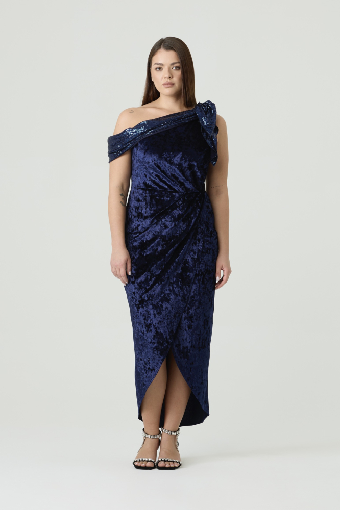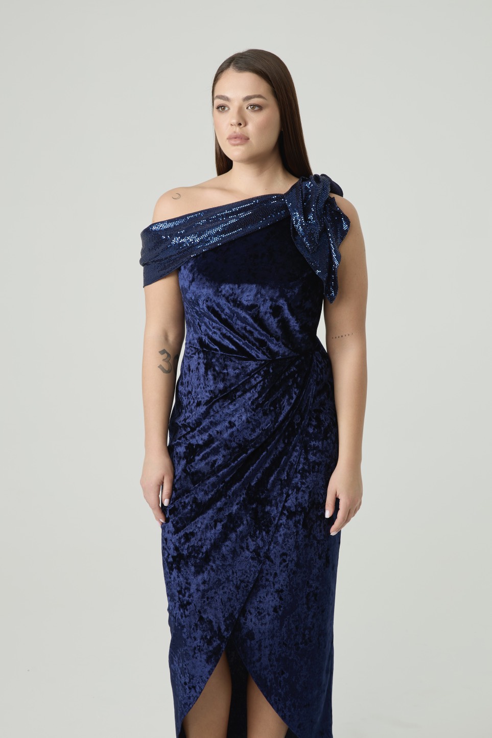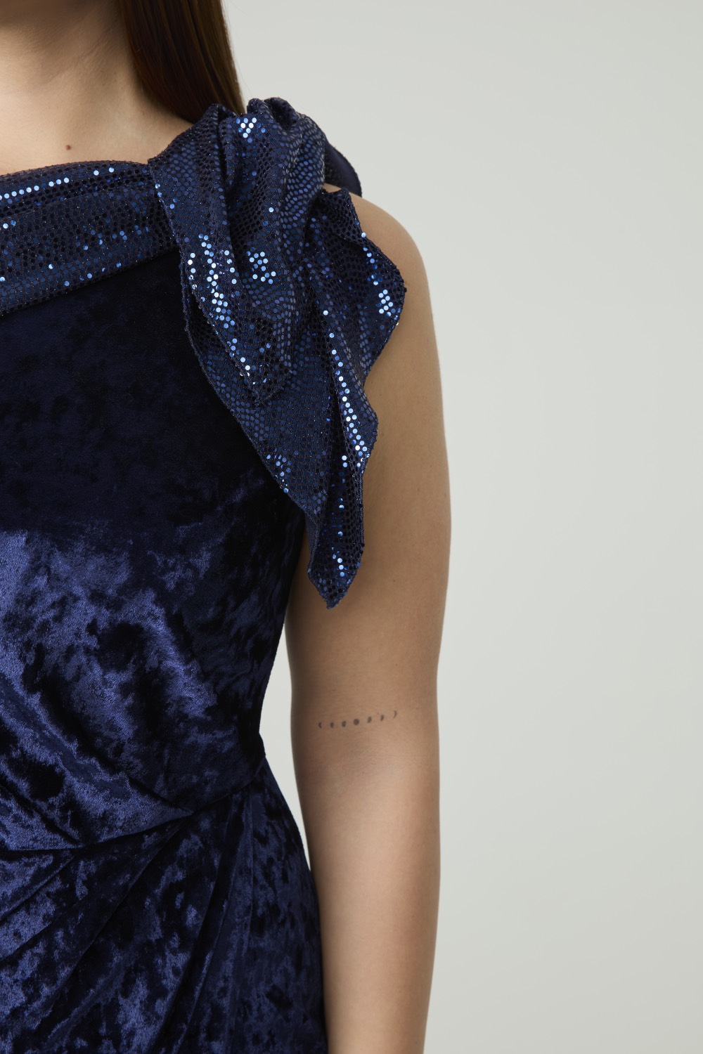 Платье для вечерних и коктейльных образов. Выполнено в приталенном крое с драпировкой на бедрах. Длина - миди, с асимметричным подолом и легким разрезом сбоку для удобства и визуального удлинения ног. Съемный платок, в качестве акцентной детали, добавляет изюминку платью.