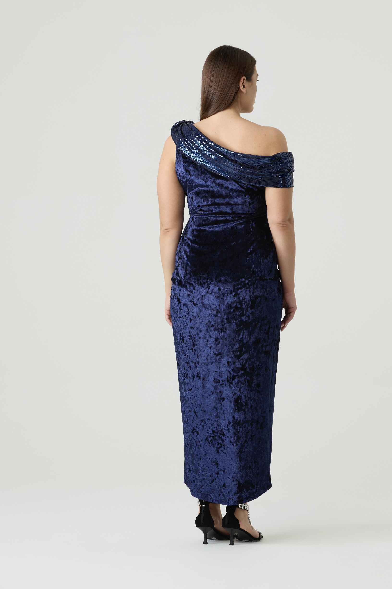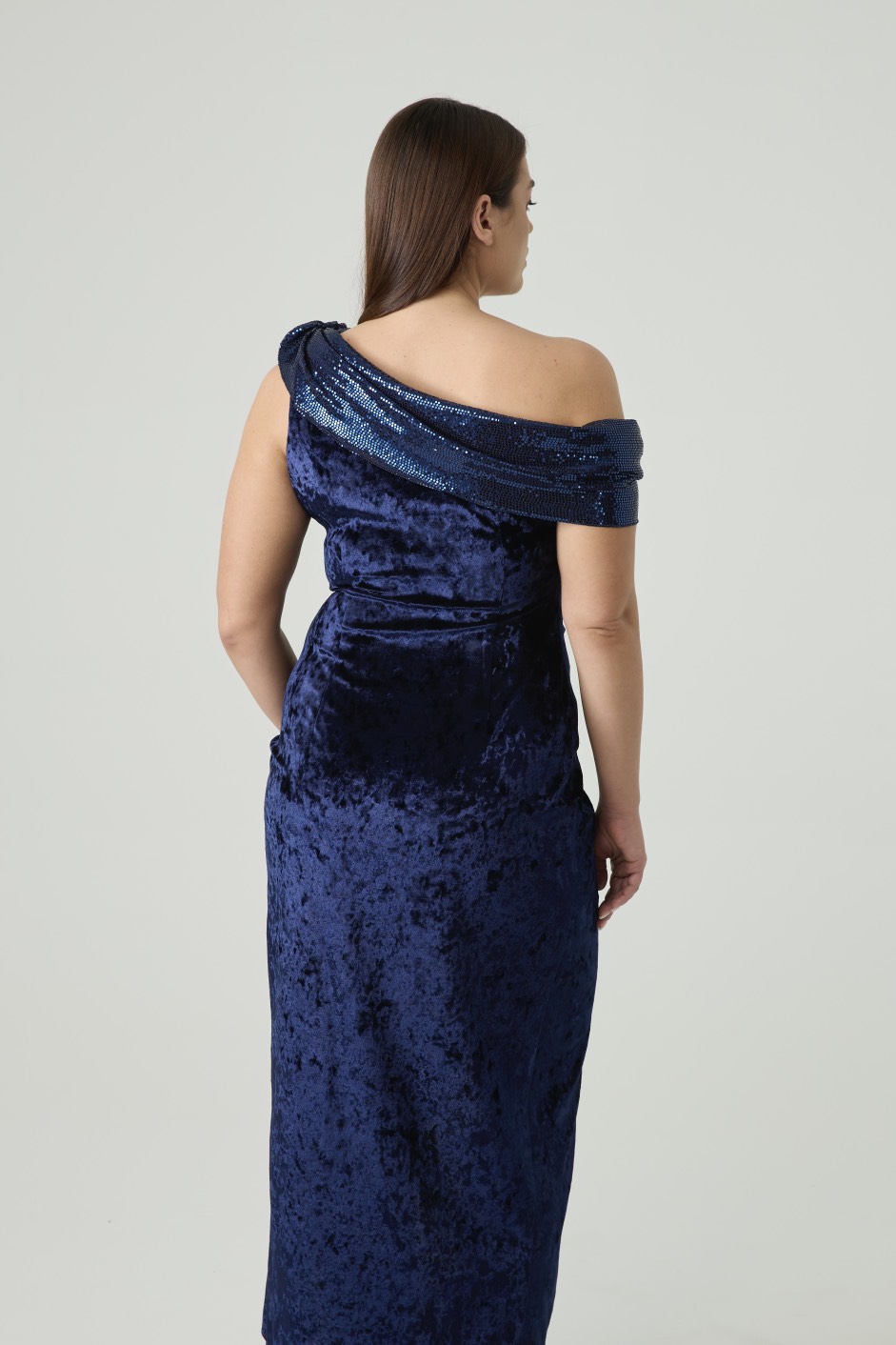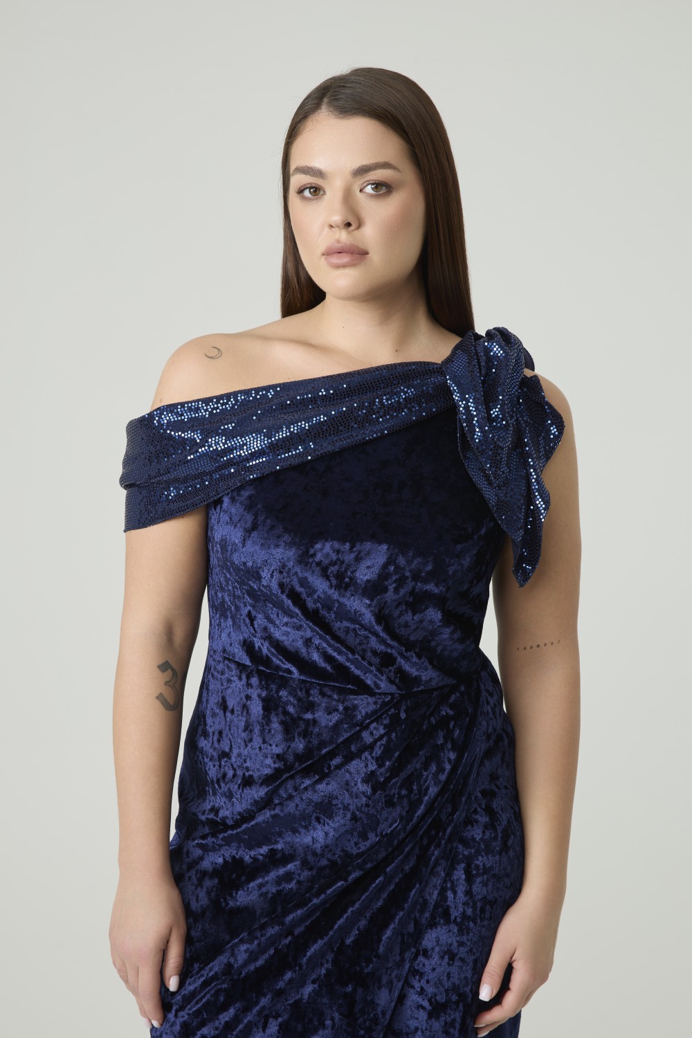 Платье для вечерних и коктейльных образов. Выполнено в приталенном крое с драпировкой на бедрах. Длина - миди, с асимметричным подолом и легким разрезом сбоку для удобства и визуального удлинения ног. Съемный платок, в качестве акцентной детали, добавляет изюминку платью.