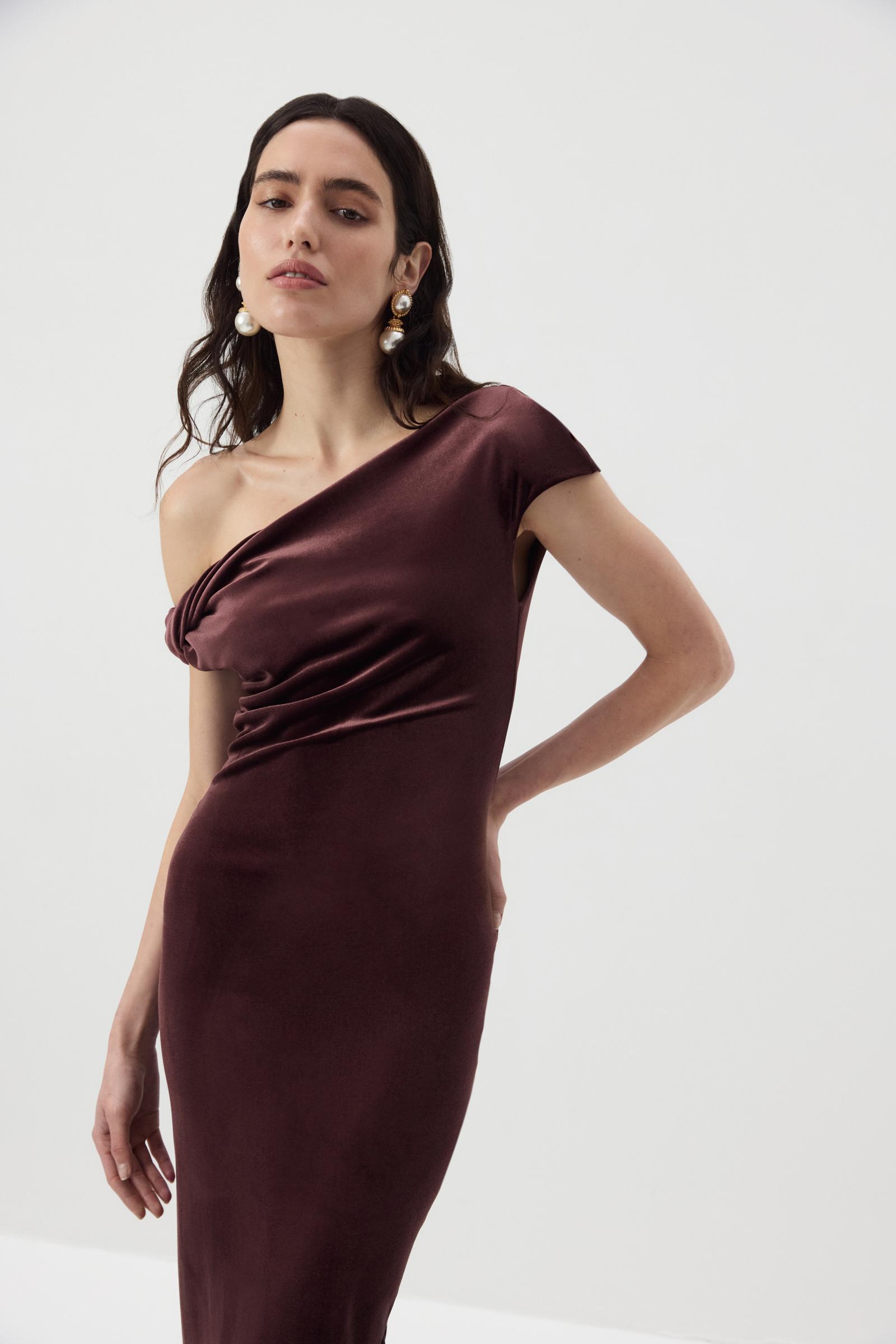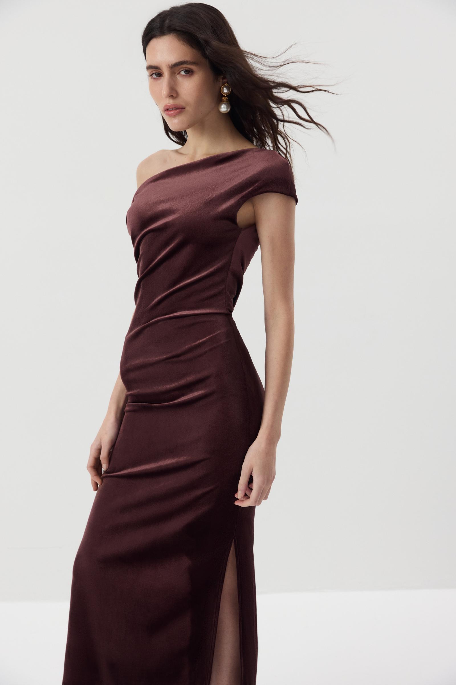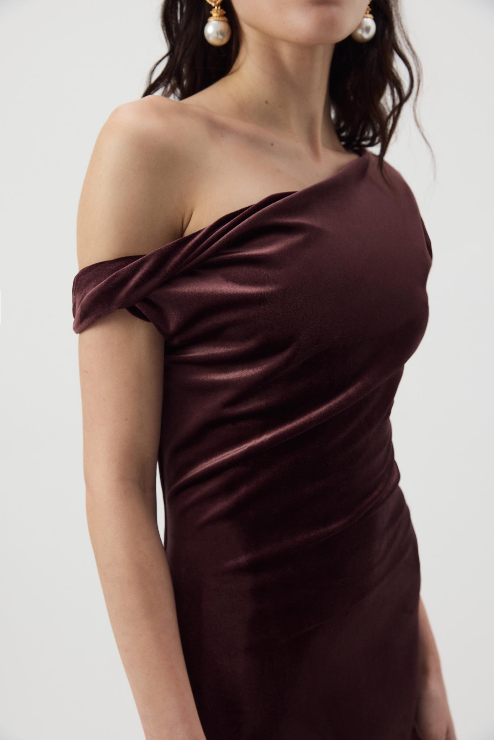 Бархатное платье длины макси с ассиметричной линией плеча, которая эффектно подчеркивает линию ключицы. Особенно мягкий силуэт спускается по линии талии и бедер. Мы выбрали для модели бархат на трикотажной основе, который деликатно блестит и обнимает фигуру.