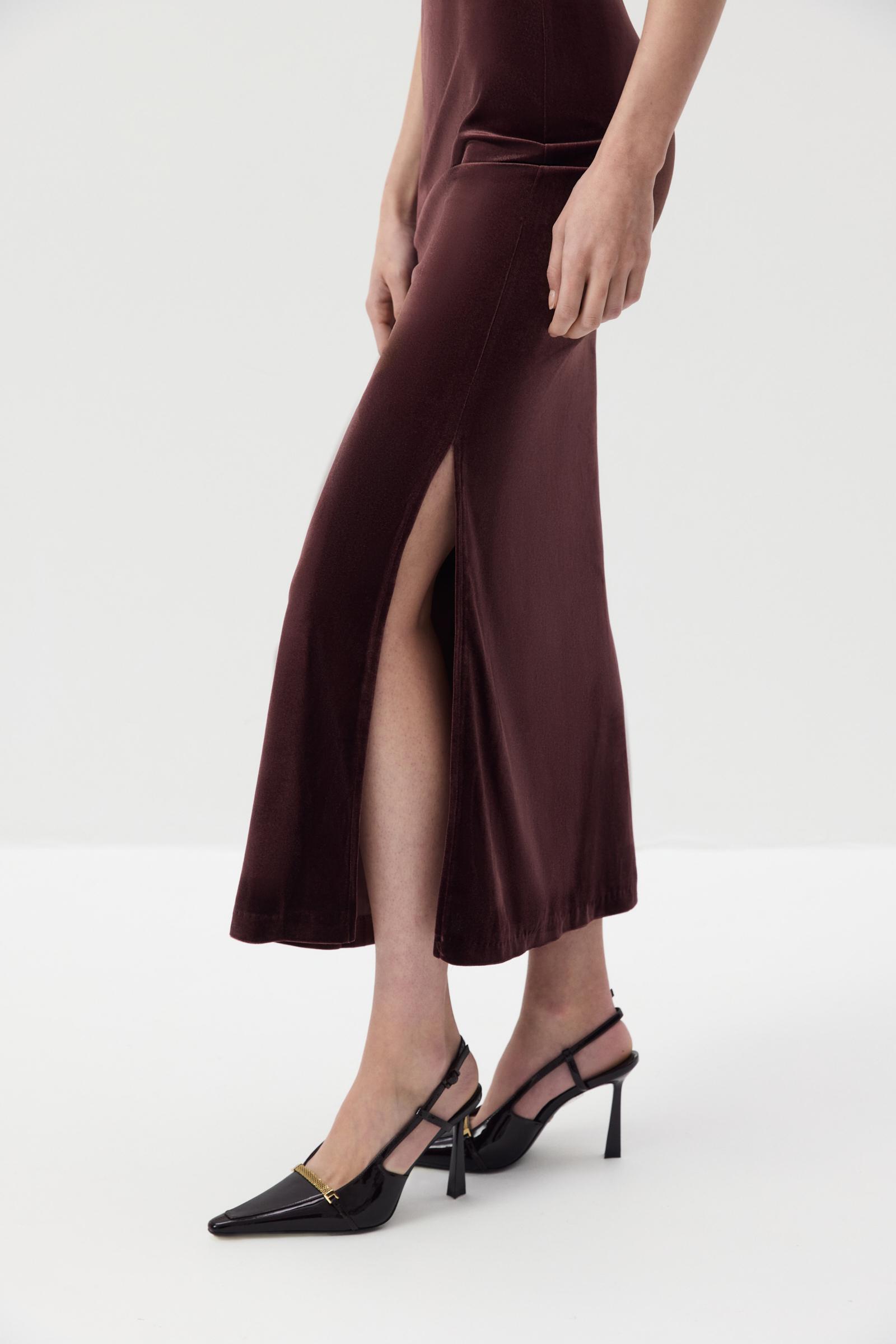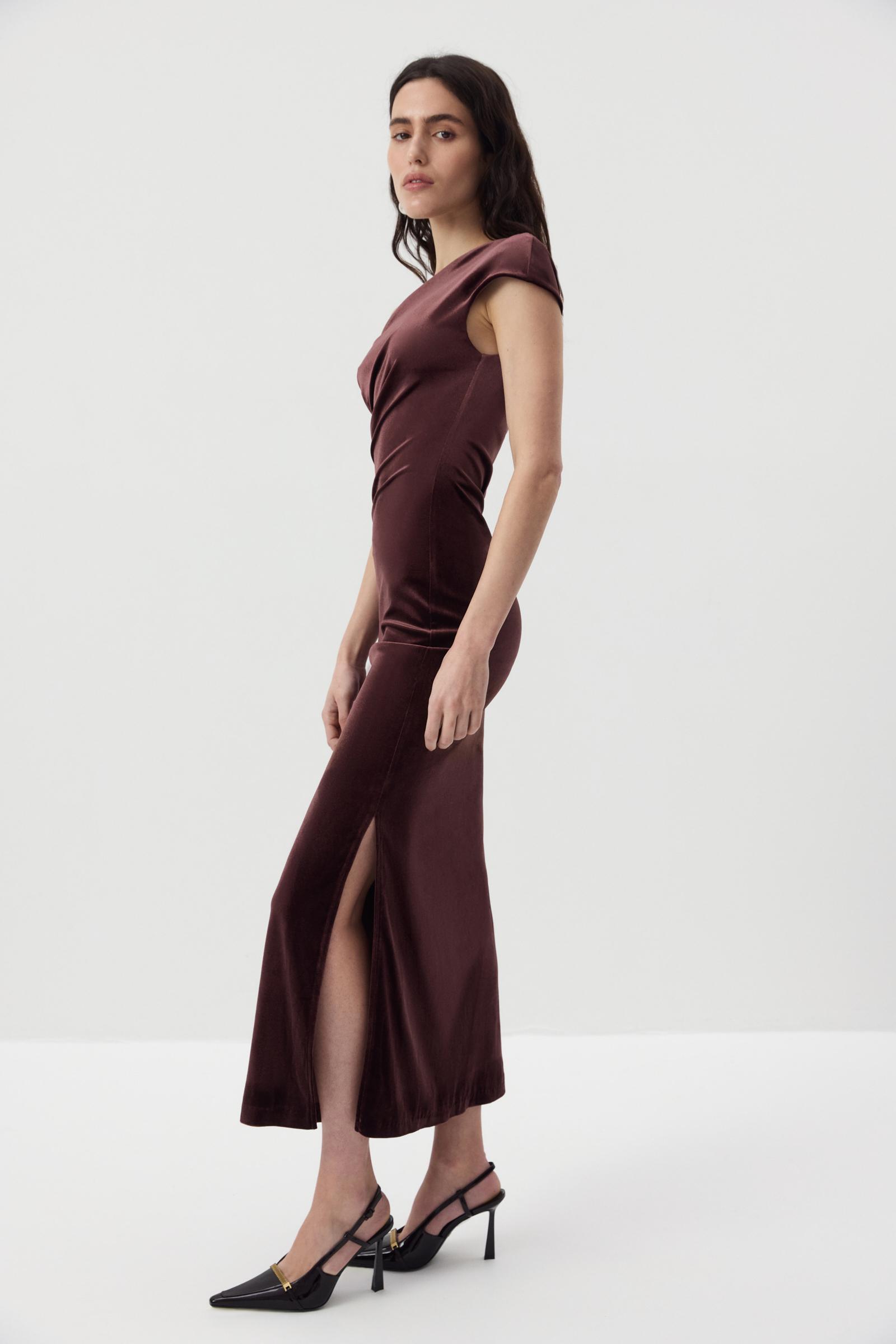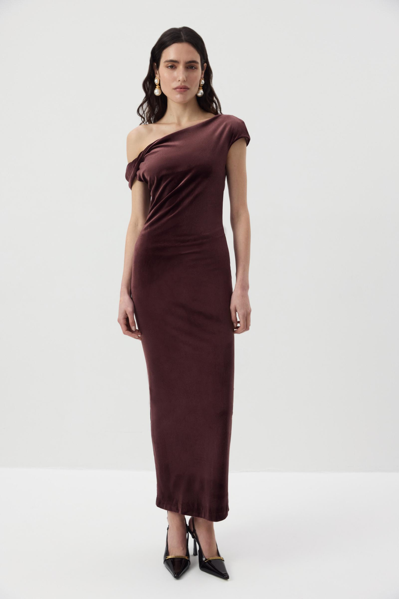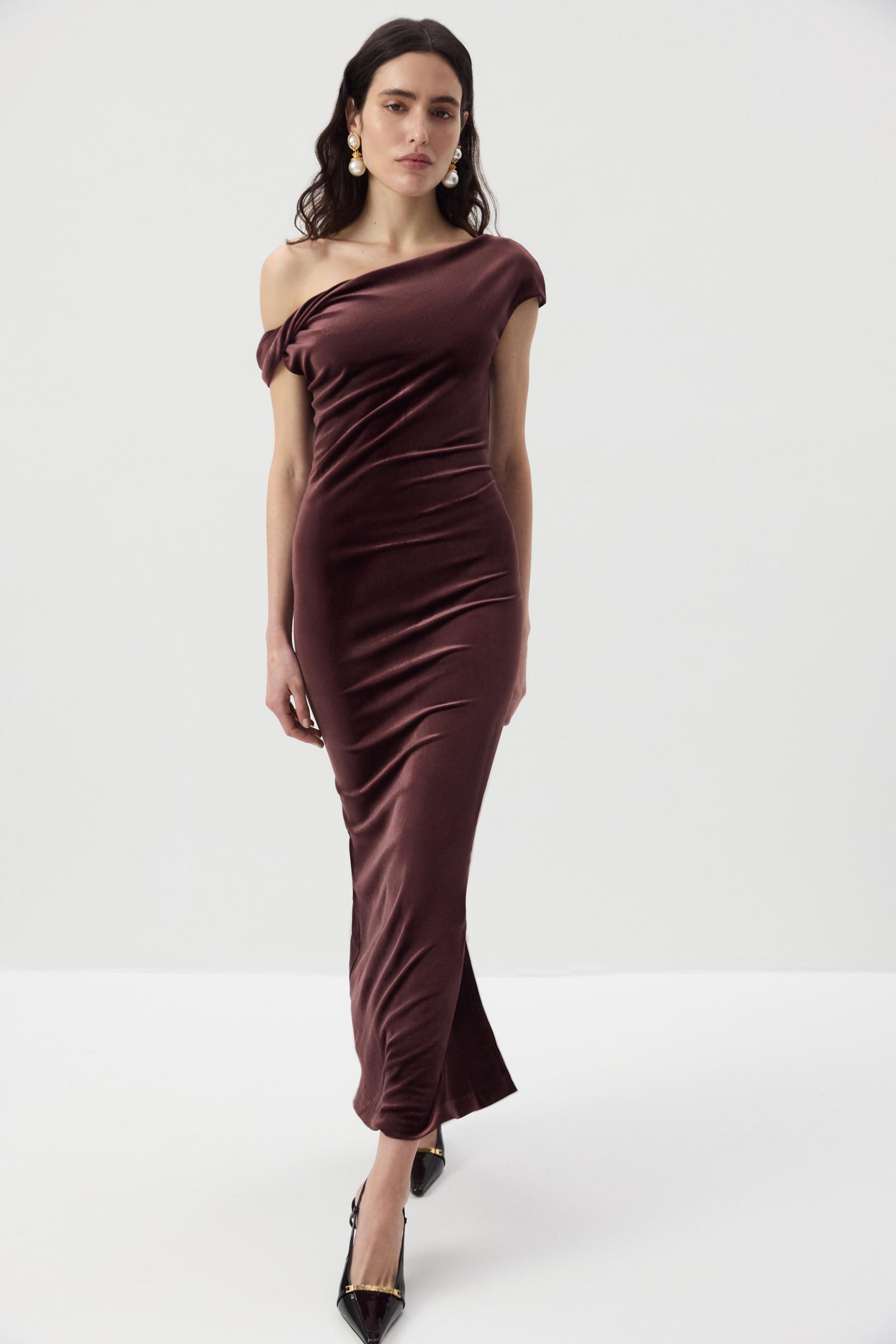 Бархатное платье длины макси с ассиметричной линией плеча, которая эффектно подчеркивает линию ключицы. Особенно мягкий силуэт спускается по линии талии и бедер. Мы выбрали для модели бархат на трикотажной основе, который деликатно блестит и обнимает фигуру.