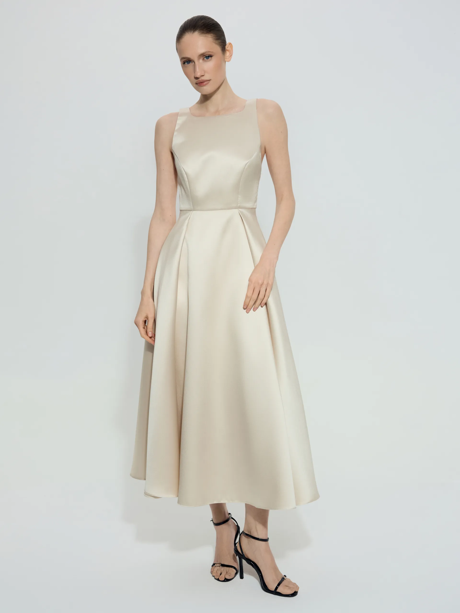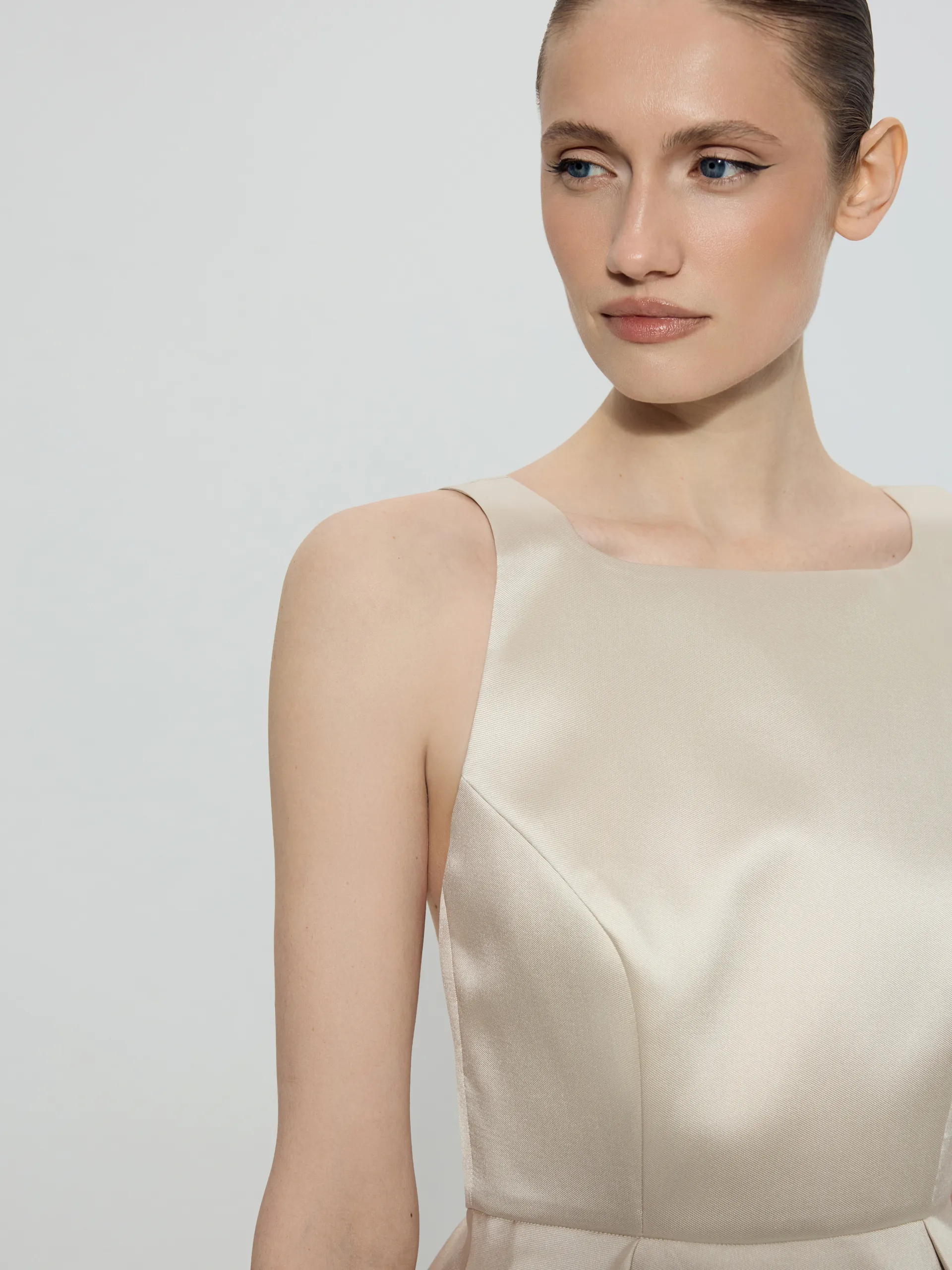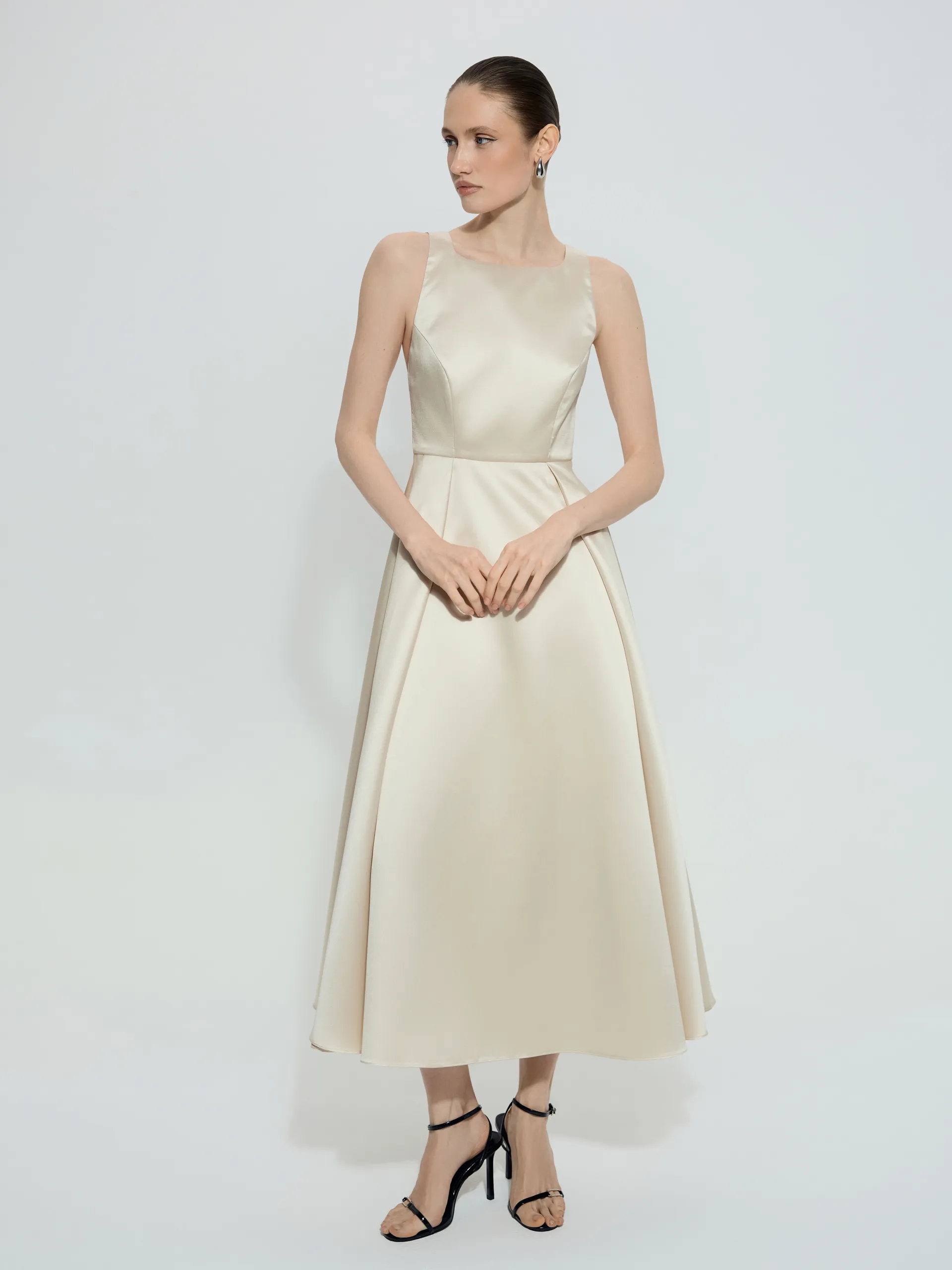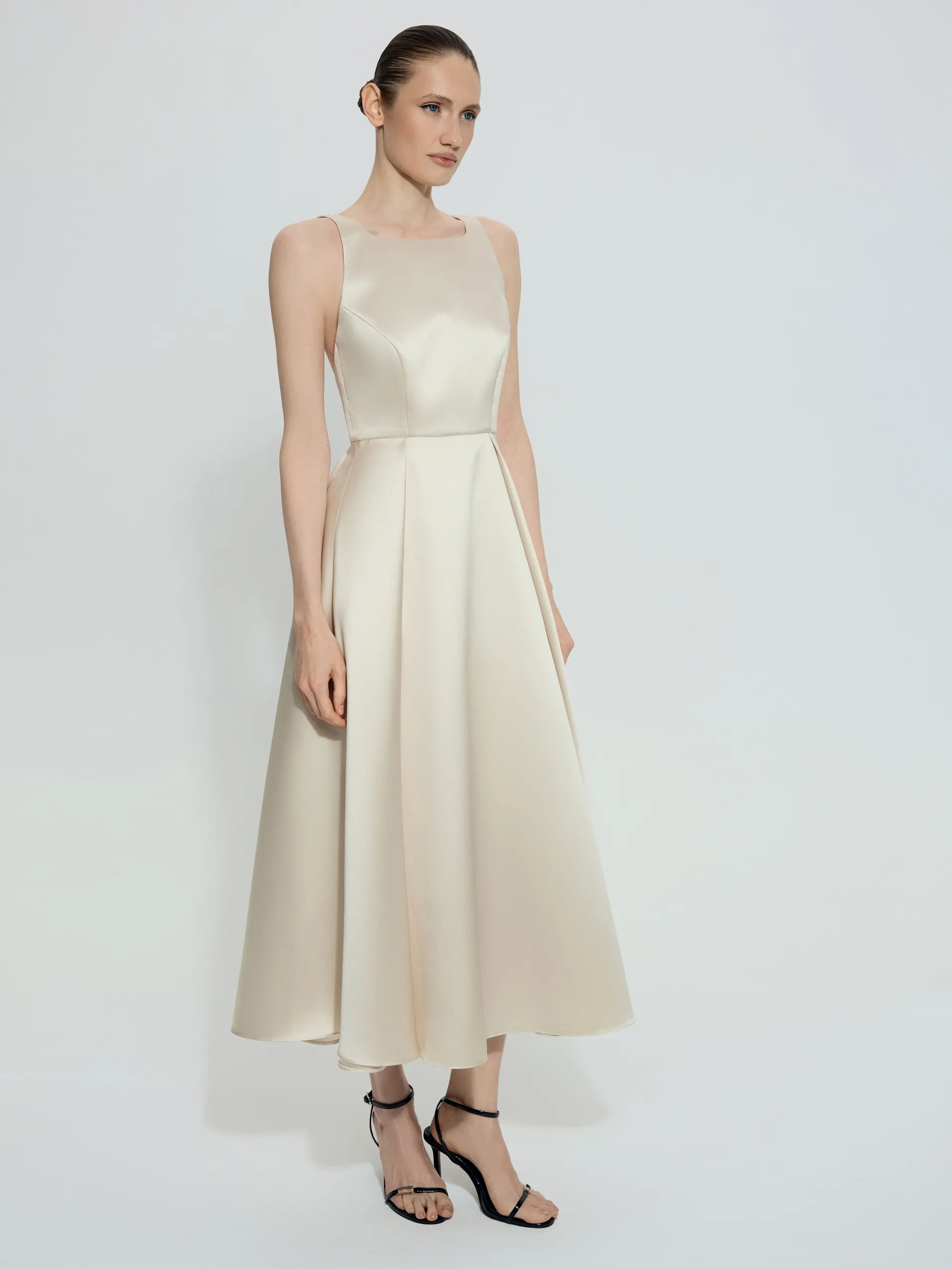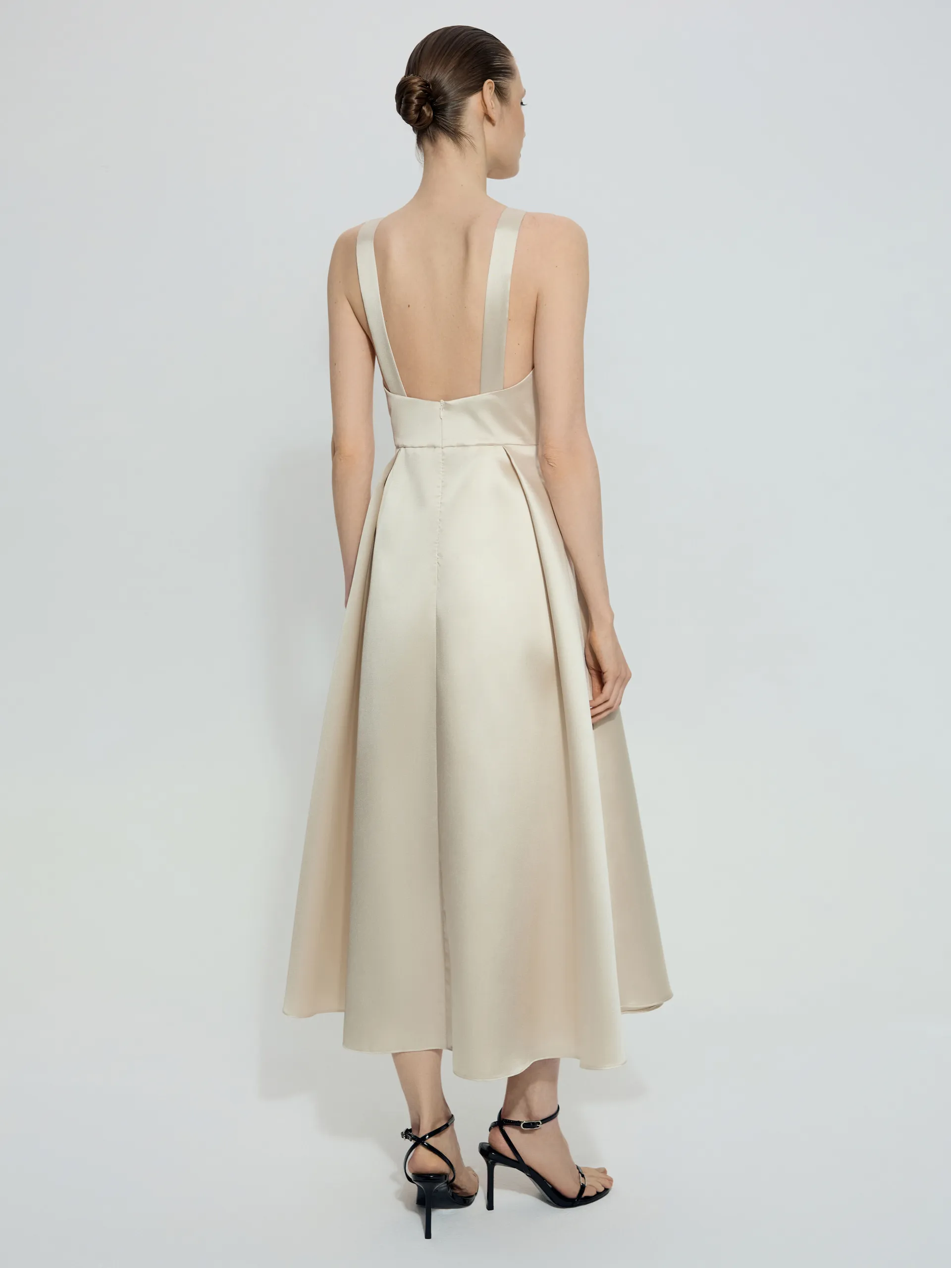 Платье Linora с открытой спиной — элегантная модель вне времени, выполненная в силуэте New Look, который красиво подчёркивает талию и делает образ утончённым. Глубокая акцентная спинка добавляет женственности, а благородный мягкий блеск ткани создаёт деликатный эффект. Платье универсально для торжественных и вечерних выходов.