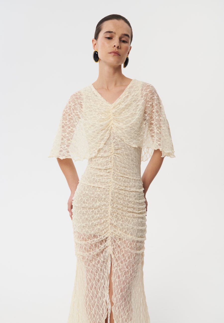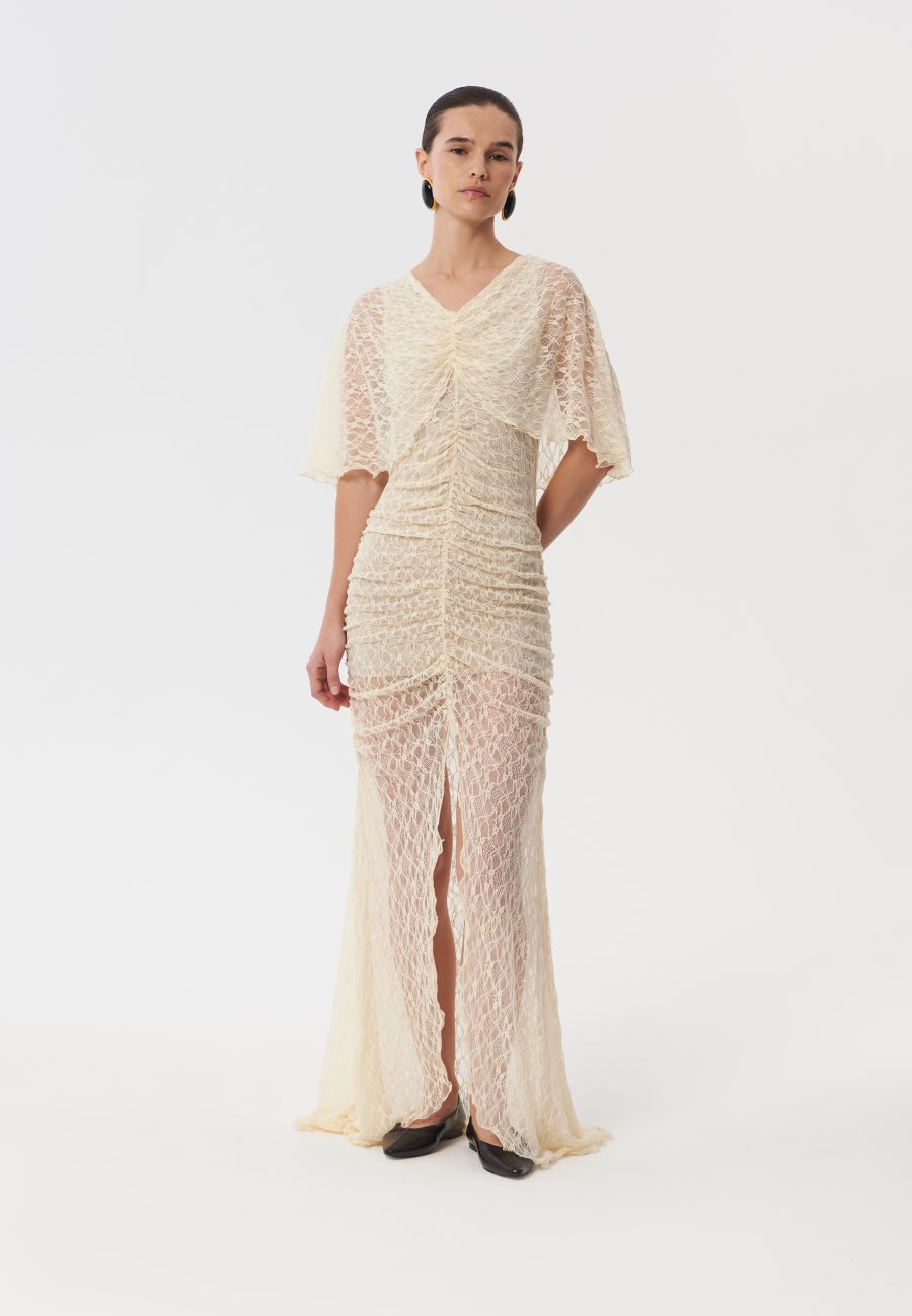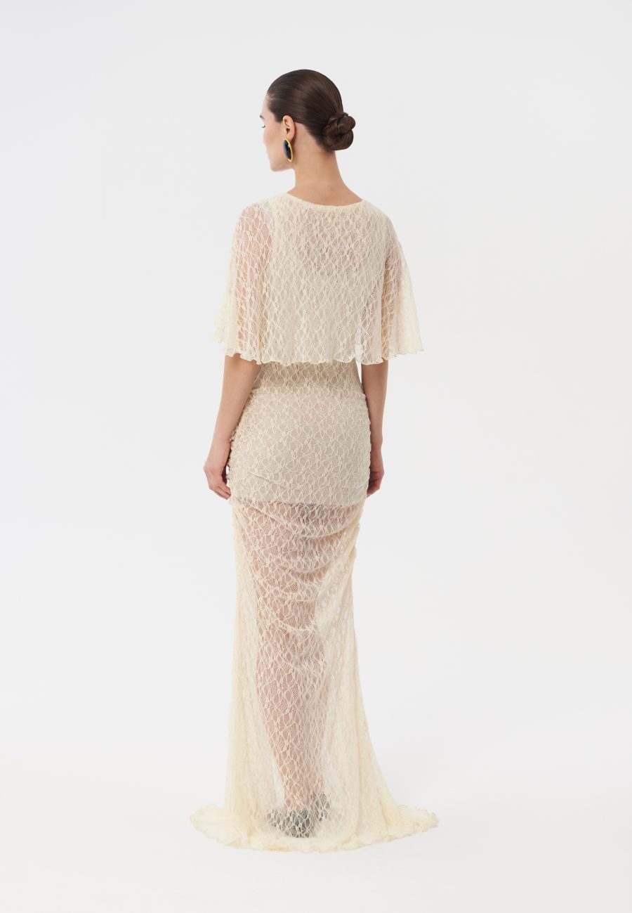 Платье Angel выполнено из ажурного кружева в нежном кремовом оттенке. Платье в длине макси, прилегающего силуэта, со сборкой спереди по центральному и боковым швам, с высоким разрезом спереди. Верхняя часть выполнена в виде воздушного отлитного кейпа. Это платье идеально подчеркнет вашу женственность, создавая незабываемый образ для особых случаев.