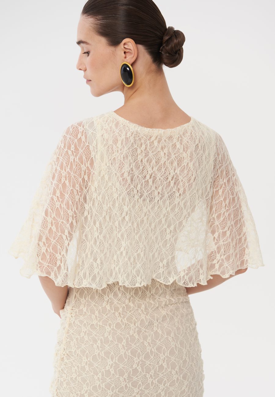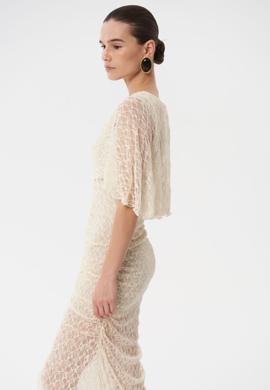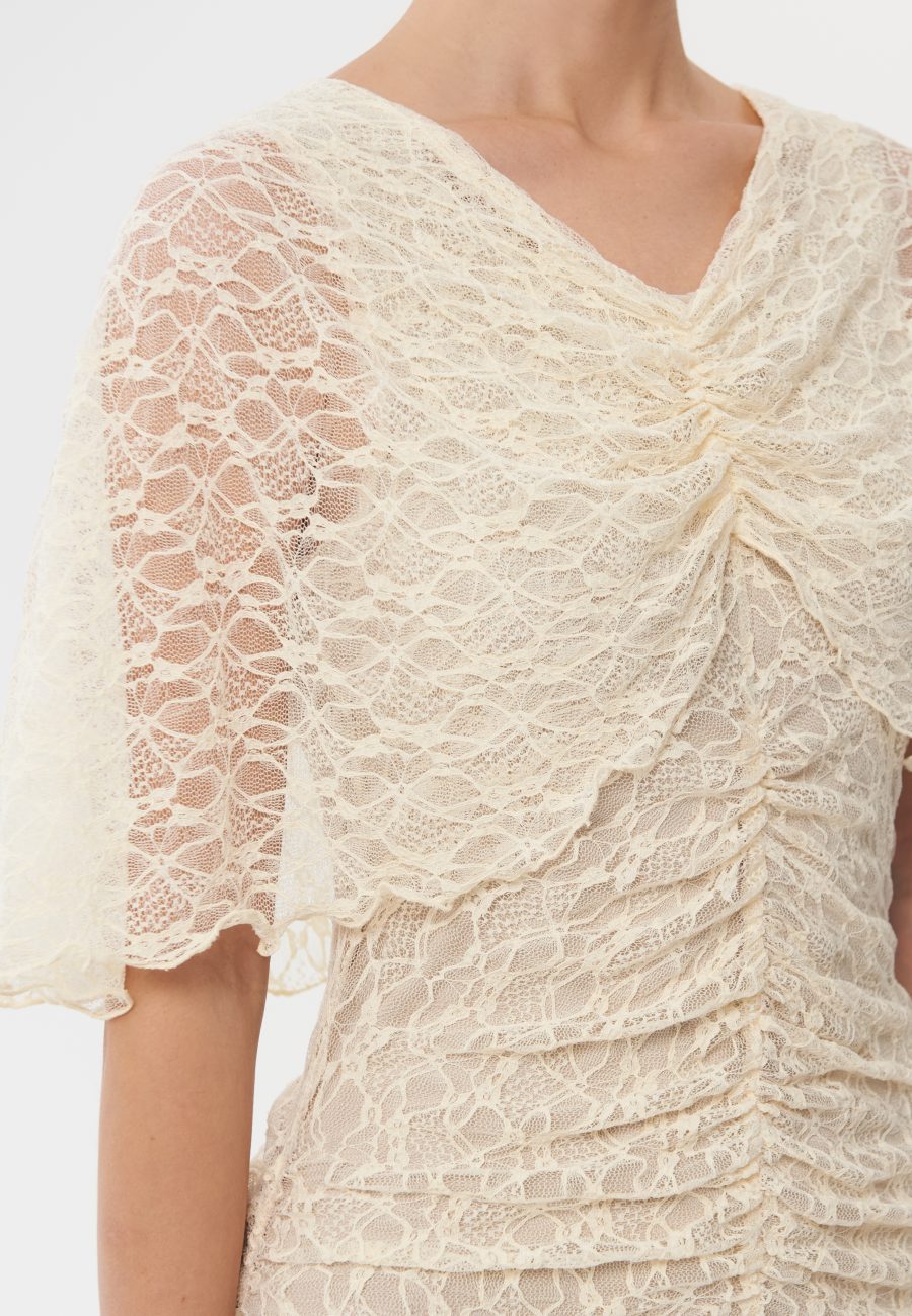 Платье Angel выполнено из ажурного кружева в нежном кремовом оттенке. Платье в длине макси, прилегающего силуэта, со сборкой спереди по центральному и боковым швам, с высоким разрезом спереди. Верхняя часть выполнена в виде воздушного отлитного кейпа. Это платье идеально подчеркнет вашу женственность, создавая незабываемый образ для особых случаев.