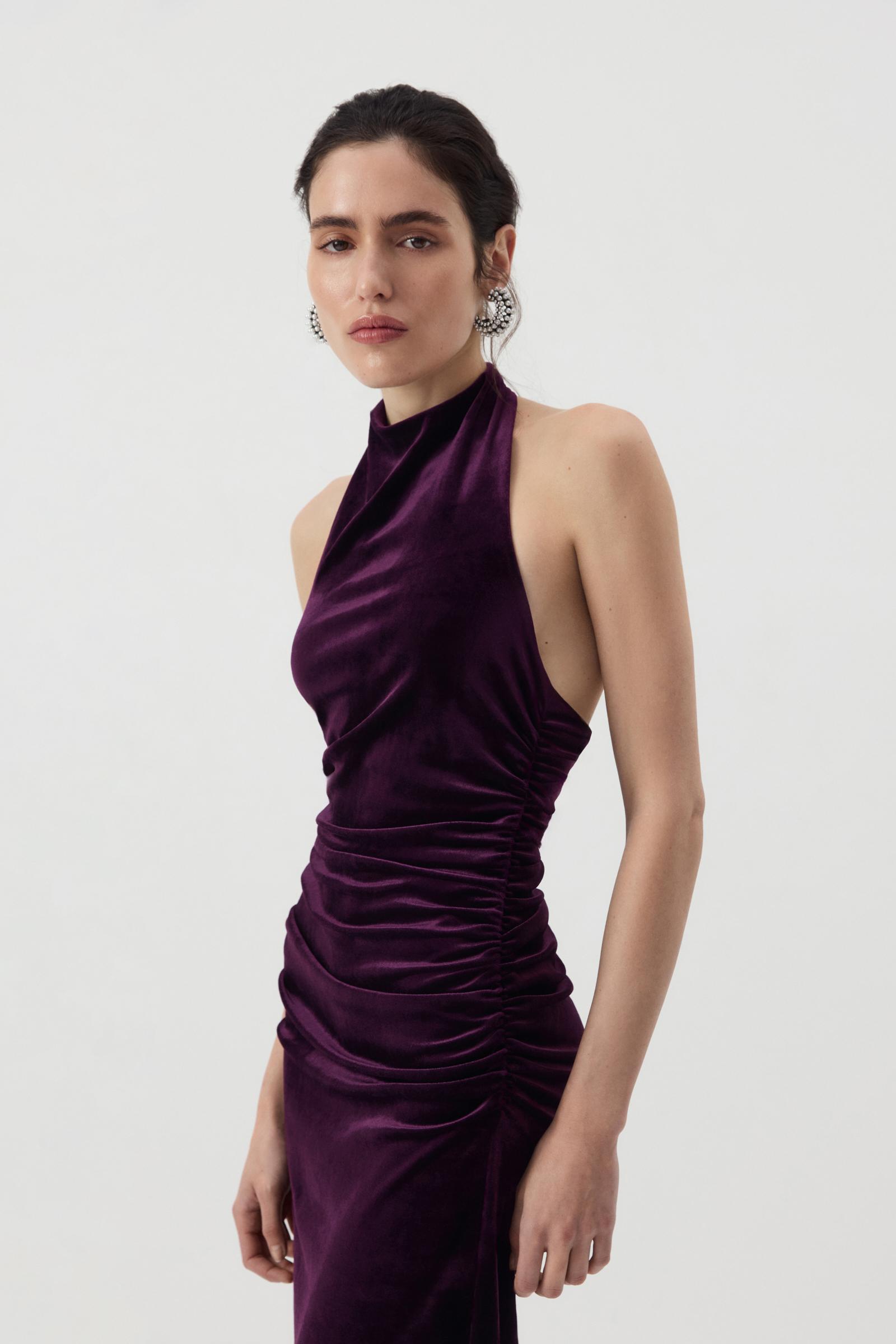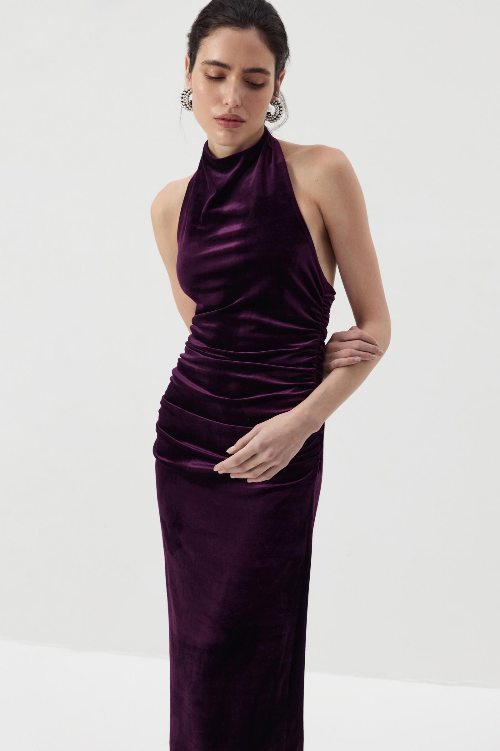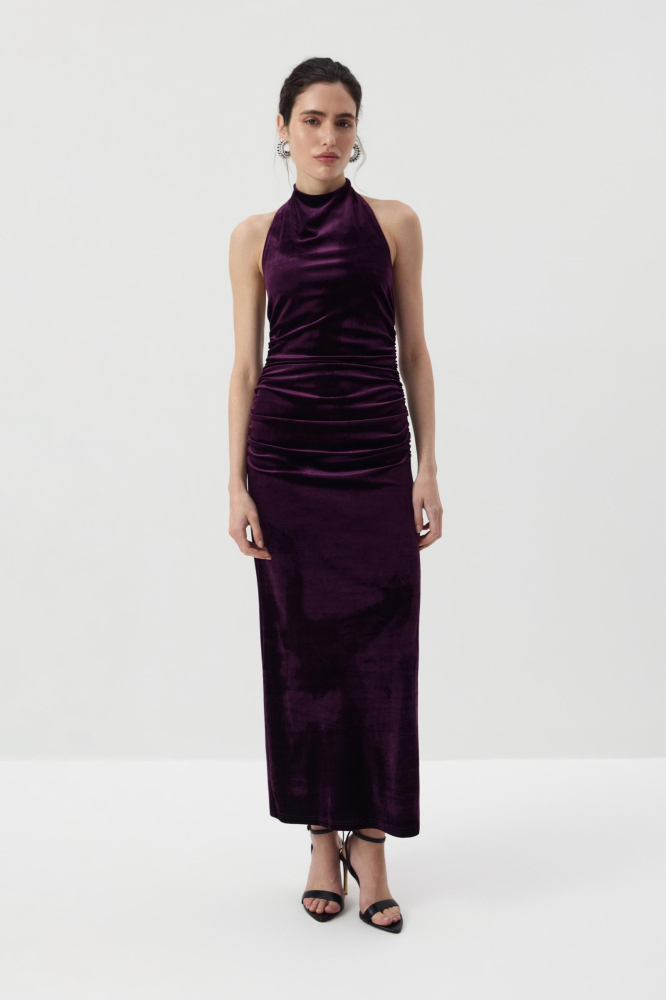 Облегающее платье длины макси из бархата с воротником халтер. Акцентом модели горловина и открытая спина. Струящийся трикотажный бархат деликатно прилегает к телу, а сборка по боковым швам добавляет акцент талии. Платье на подкладке из мягкого трикотажа.