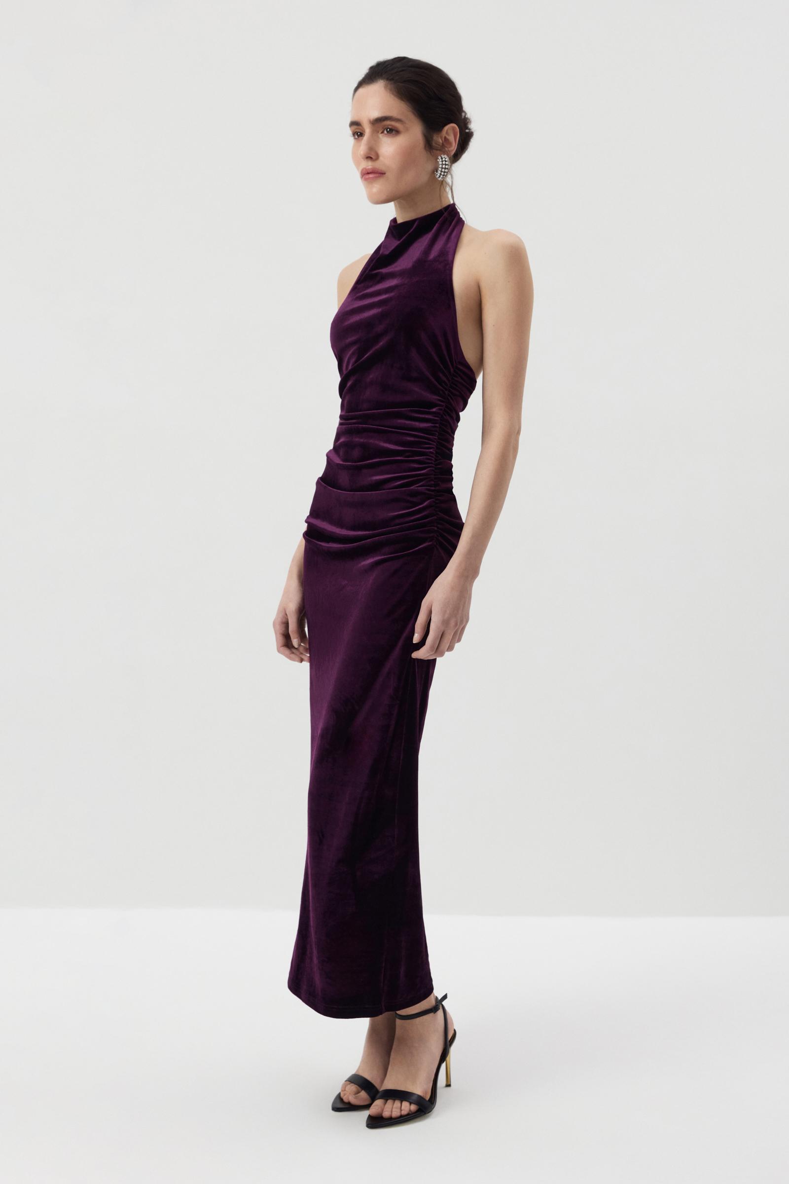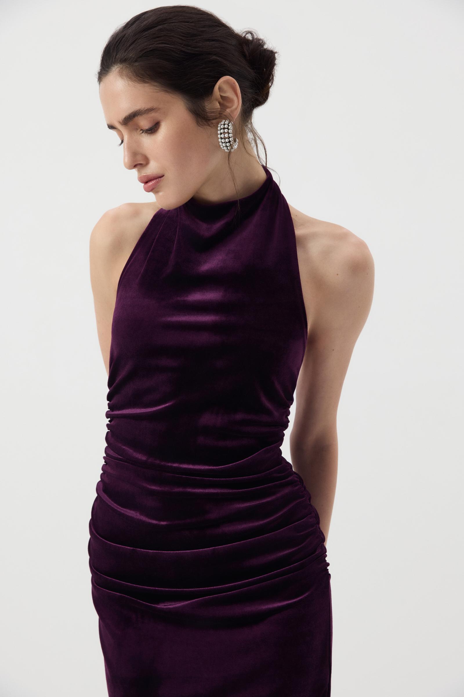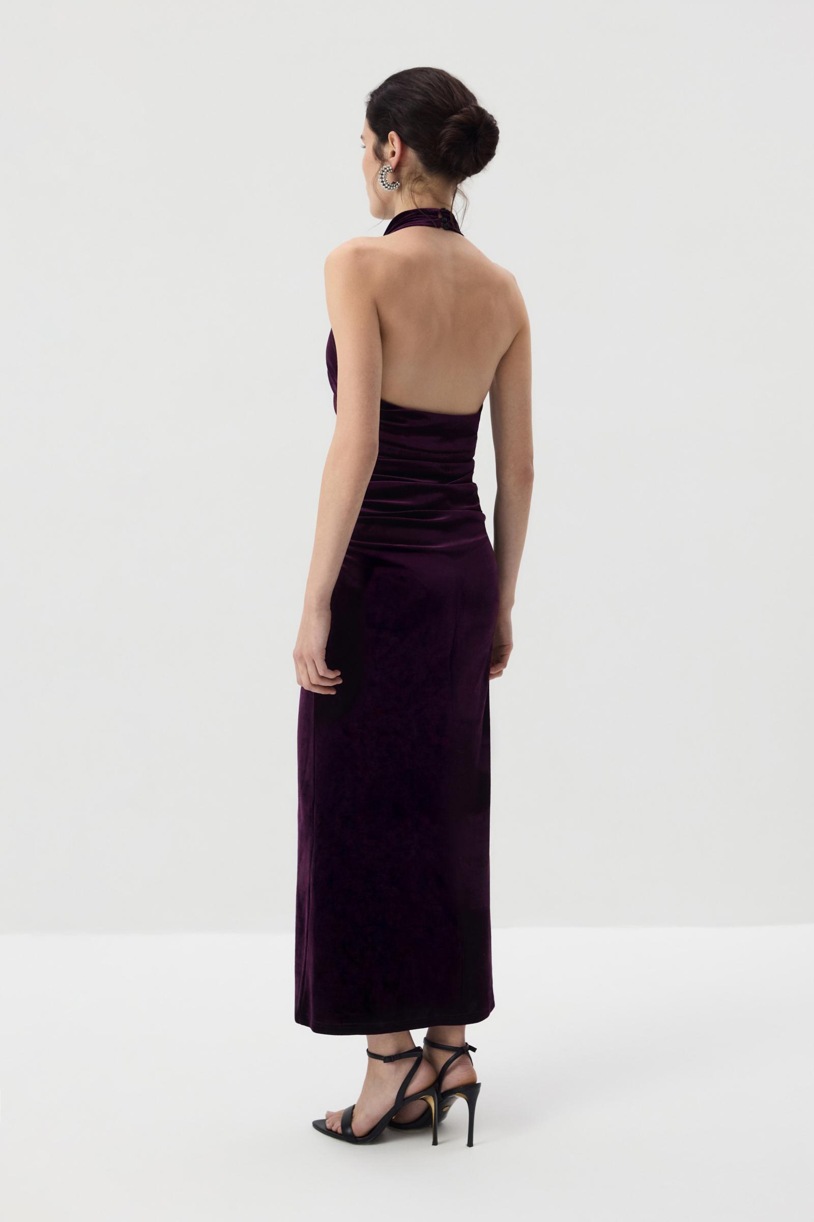 Облегающее платье длины макси из бархата с воротником халтер. Акцентом модели горловина и открытая спина. Струящийся трикотажный бархат деликатно прилегает к телу, а сборка по боковым швам добавляет акцент талии. Платье на подкладке из мягкого трикотажа.