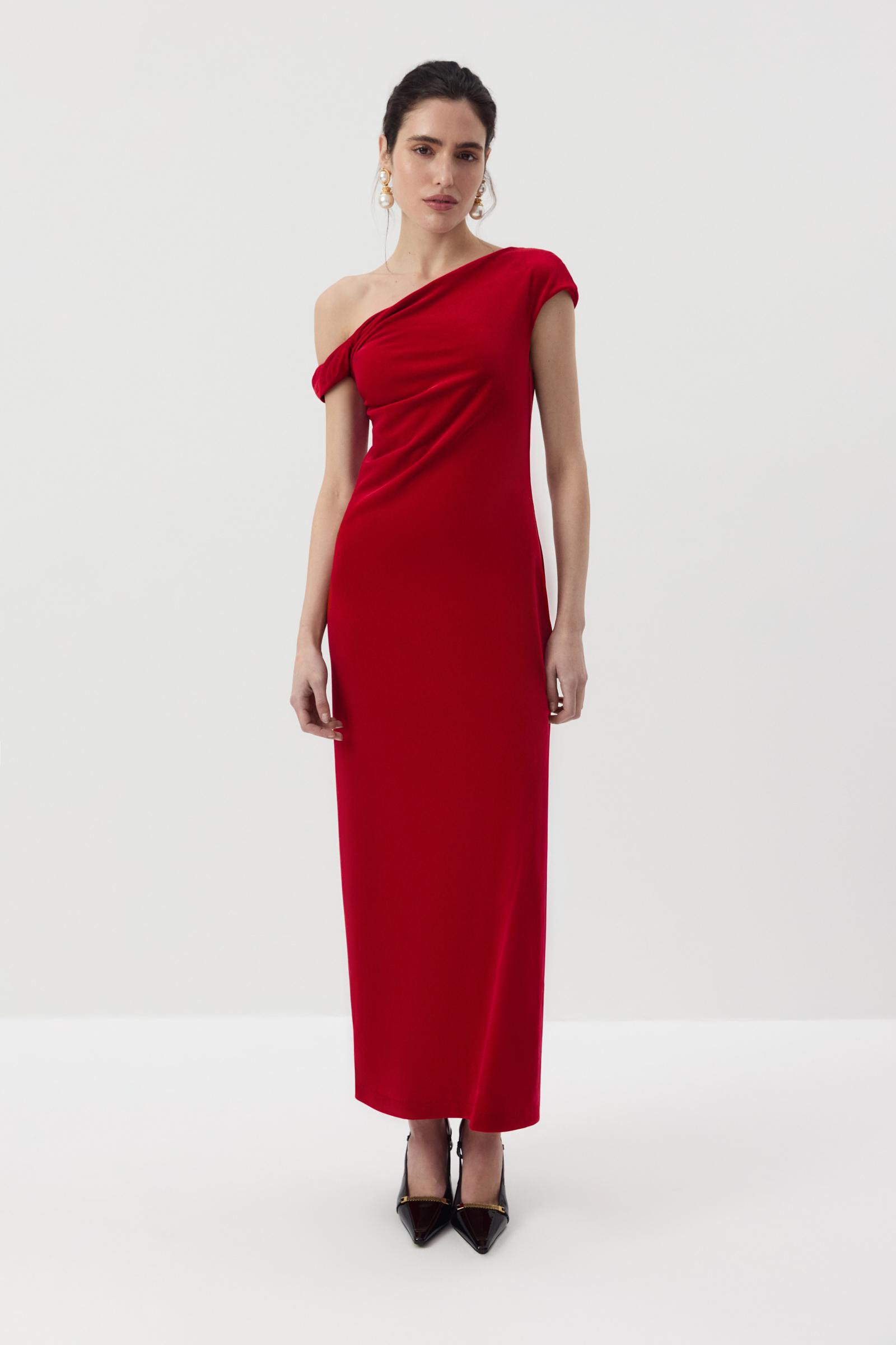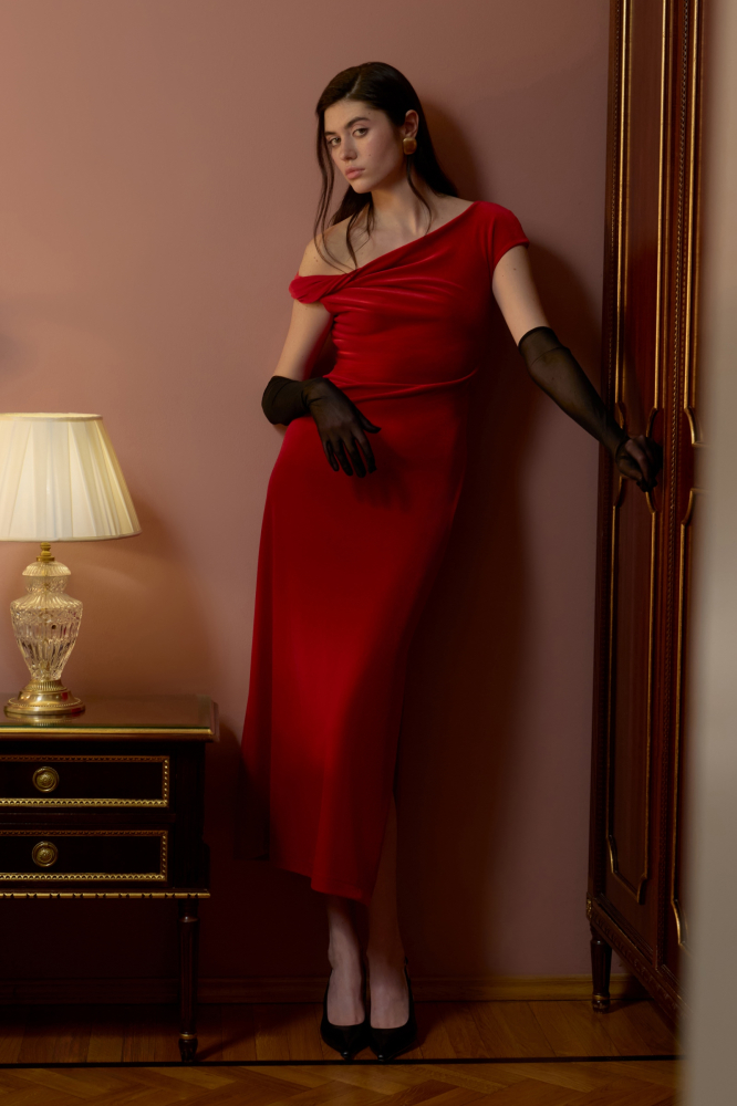 Бархатное платье длины макси с ассиметричной линией плеча, которая эффектно подчеркивает линию ключицы. Особенно мягкий силуэт спускается по линии талии и бедер. Мы выбрали для модели бархат на трикотажной основе, который деликатно блестит и обнимает фигуру.