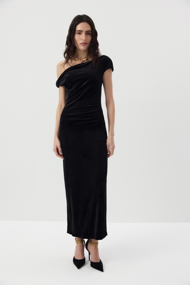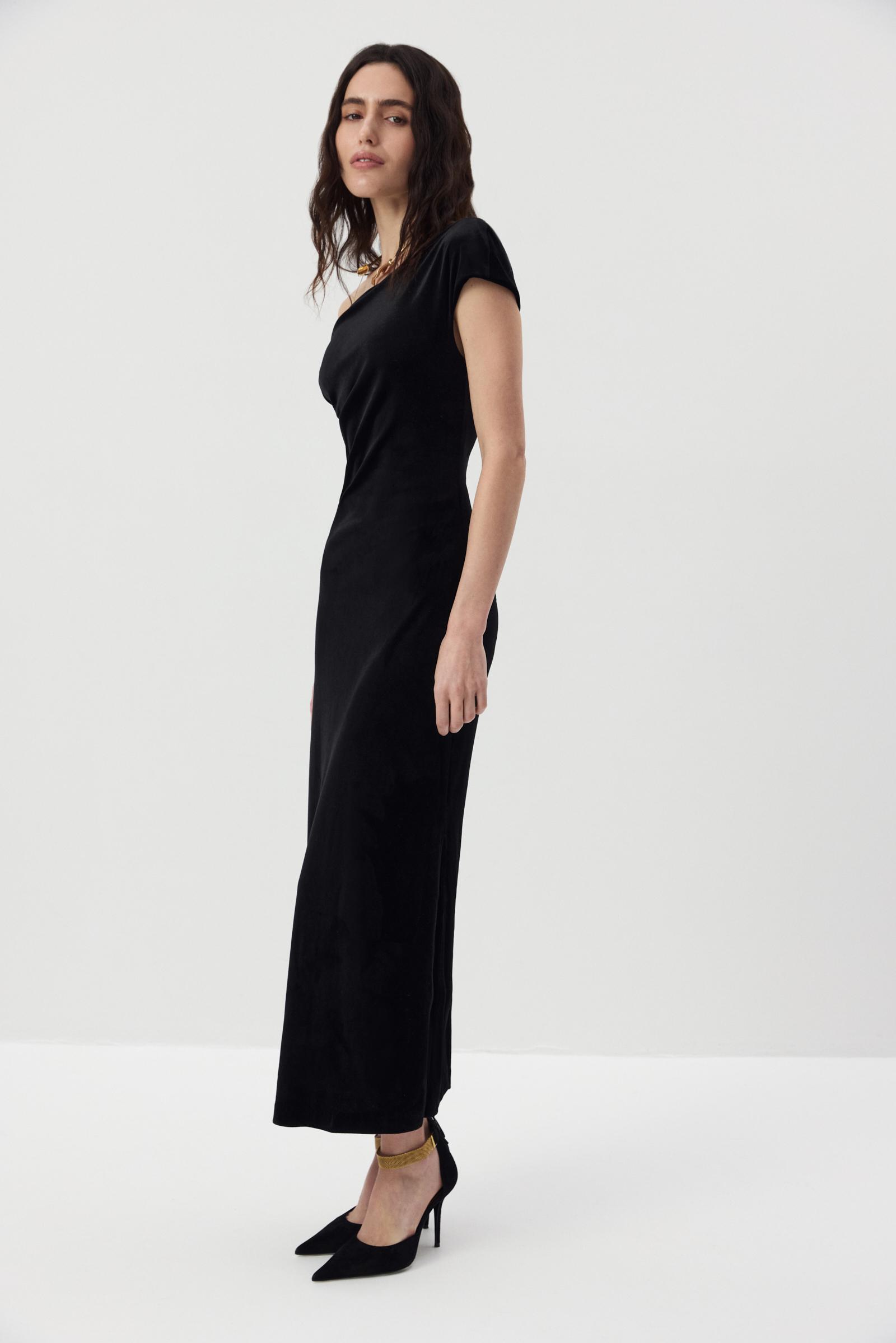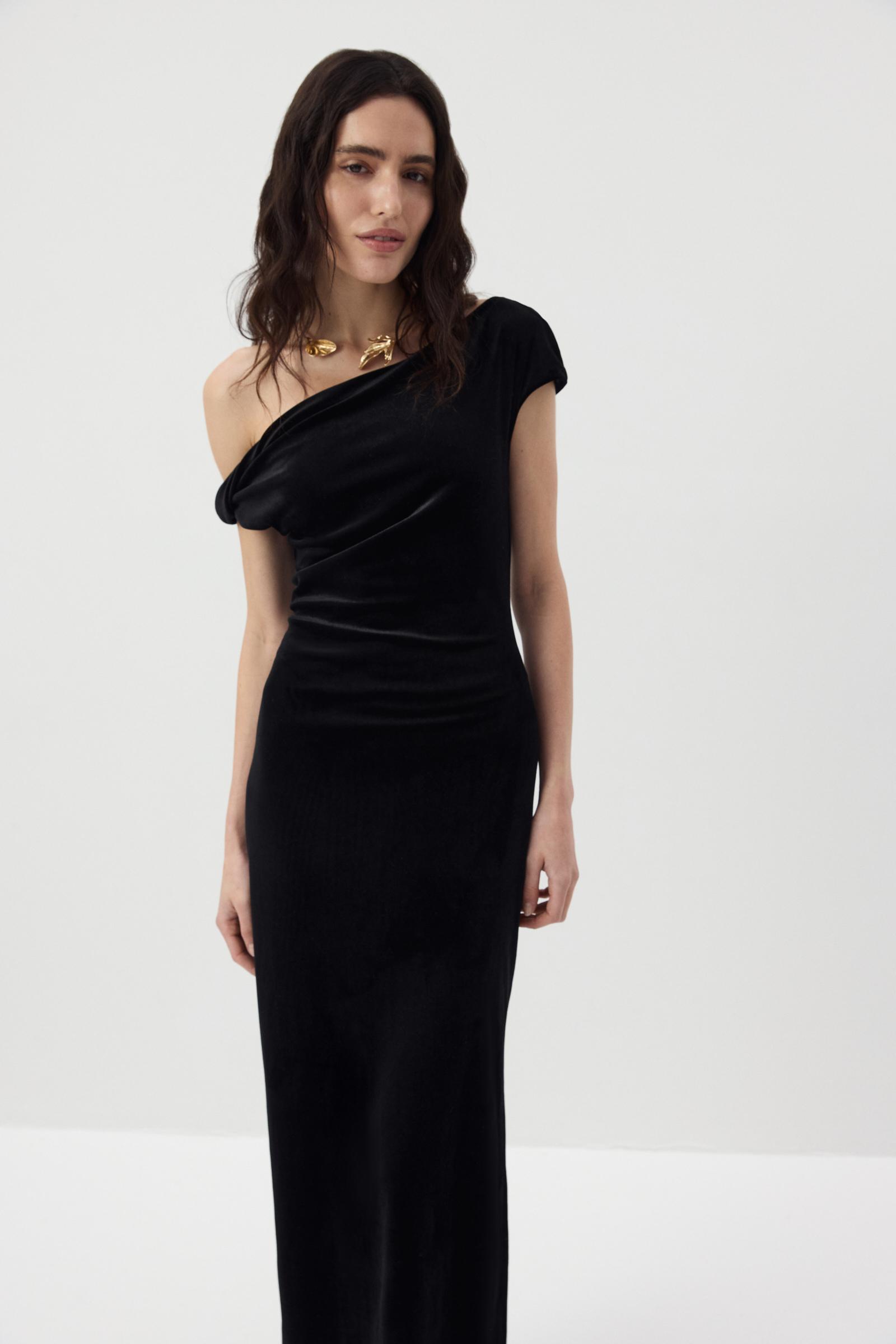 Бархатное платье длины макси с ассиметричной линией плеча, которая эффектно подчеркивает линию ключицы. Особенно мягкий силуэт спускается по линии талии и бедер. Мы выбрали для модели бархат на трикотажной основе, который деликатно блестит и обнимает фигуру.