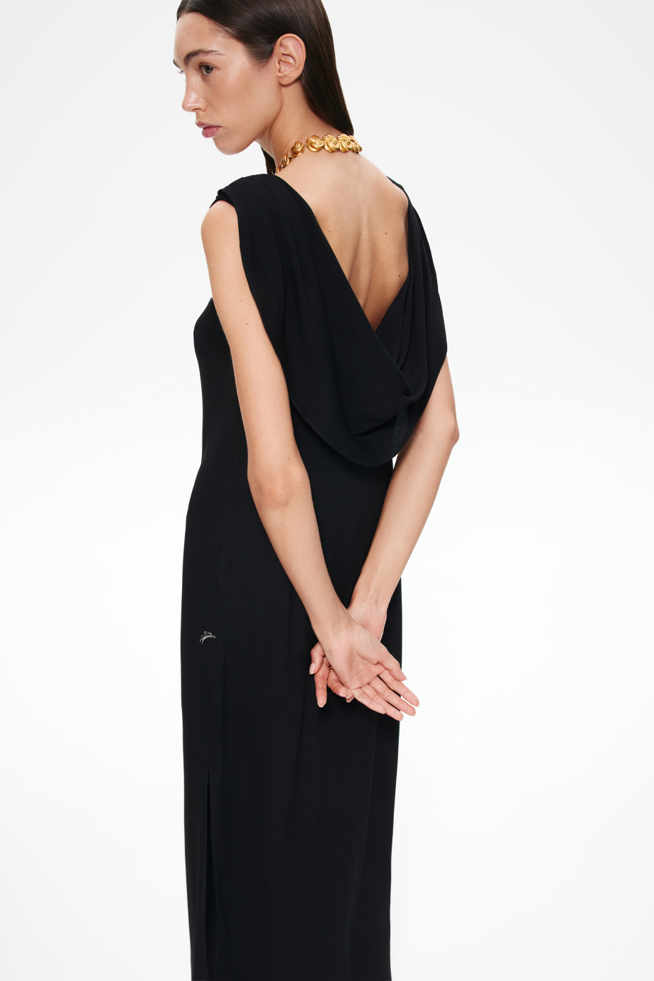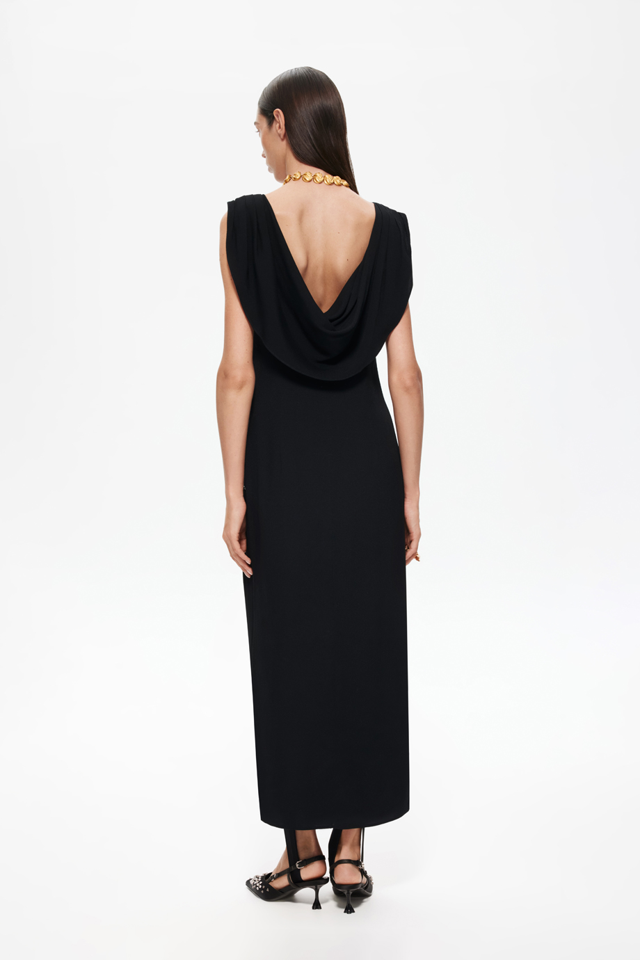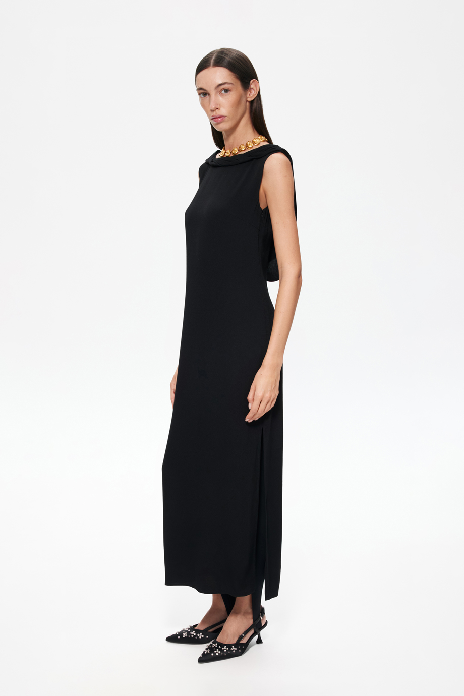 Это изысканное вечернее платье макси станет идеальным выбором для любого торжественного мероприятия. Модель без рукавов подчёркивает женственность и изящность рук. Вырез на спине добавляет образу элегантности и загадочности, привлекая внимание и подчёркивая достоинства фигуры.