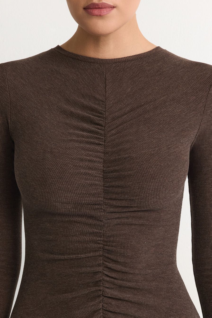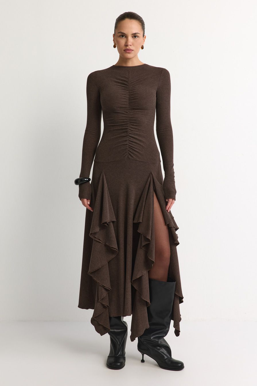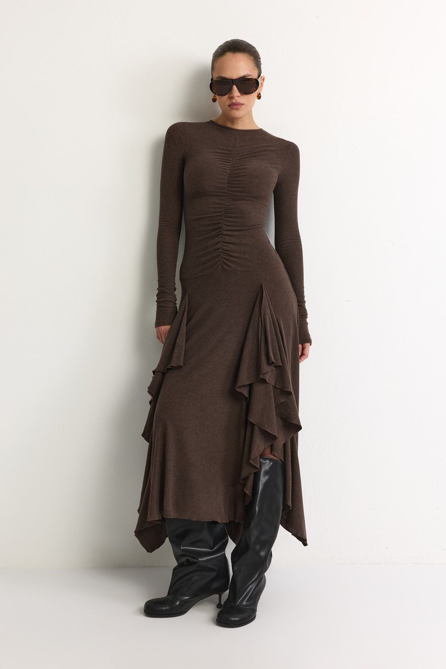 Коричневое трикотажное платье из смесовой вискозы – модель облегающего кроя с юбкой с клиньями. Платье декорировано сборками на лицевой стороне и спине.