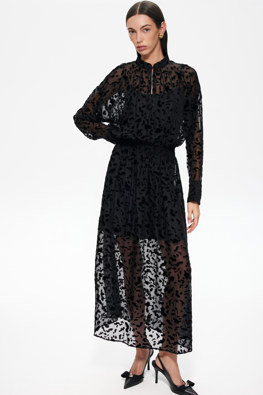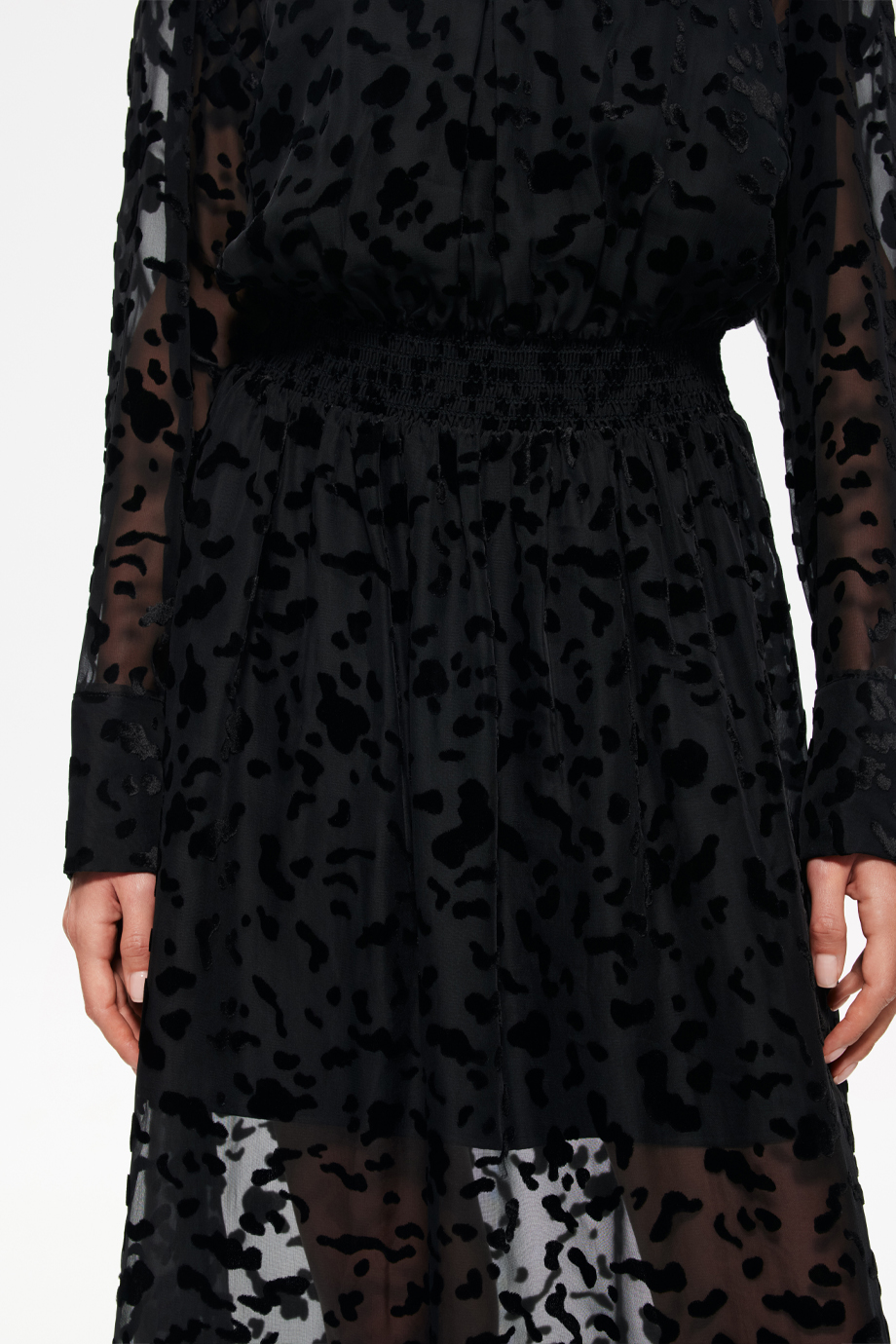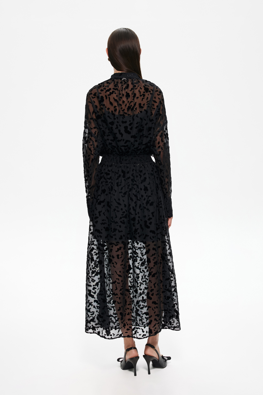 Чёрное платье из деворе — идеальный выбор для создания стильного образа. Эластичный пояс-резинка обеспечивает комфортную посадку по фигуре. Этот элемент одежды станет основой для различных модных комбинаций.
