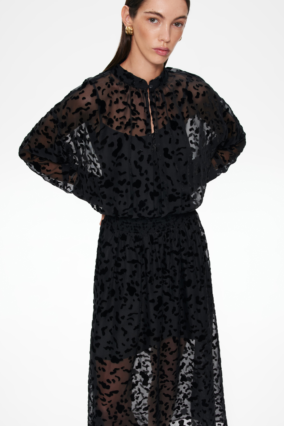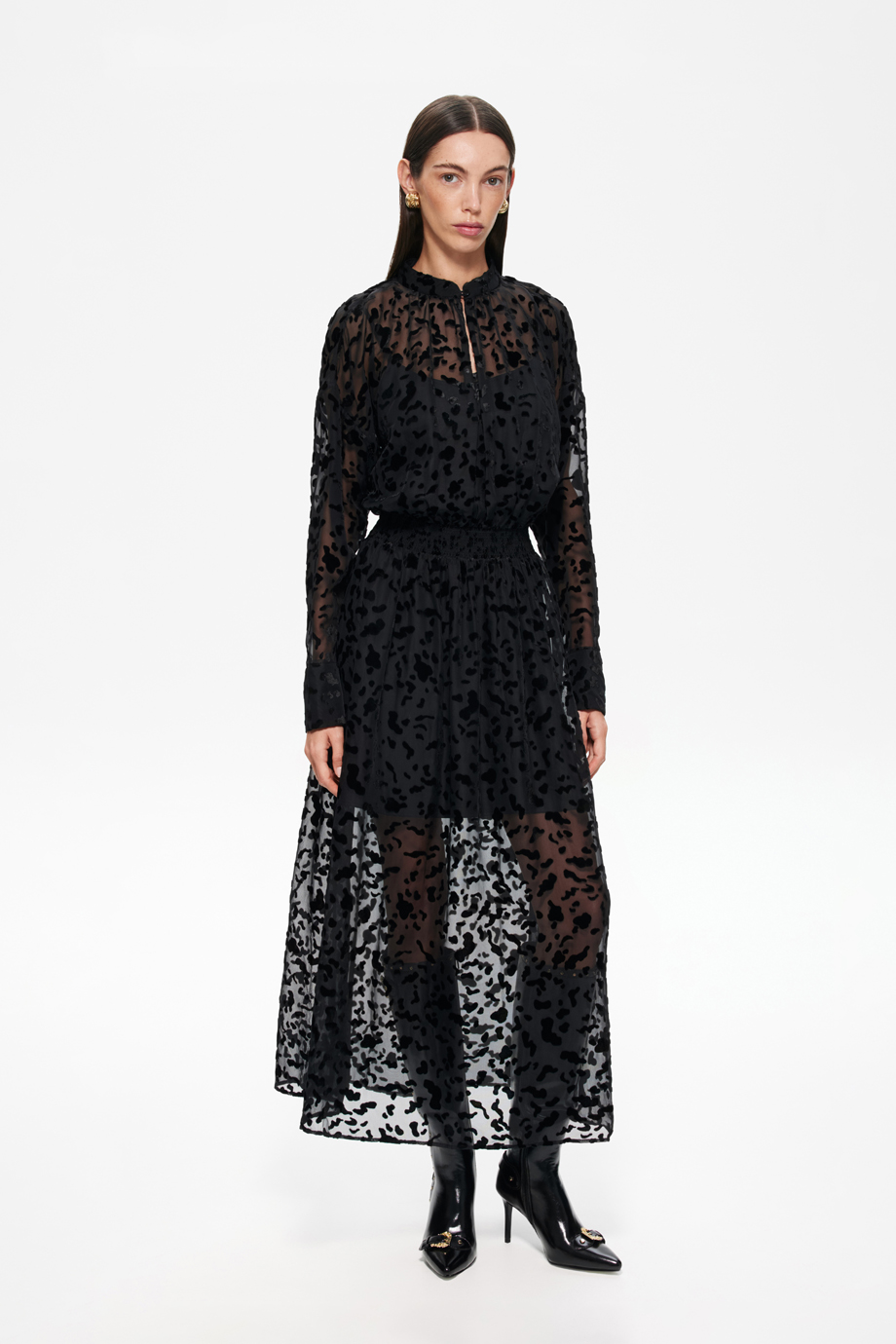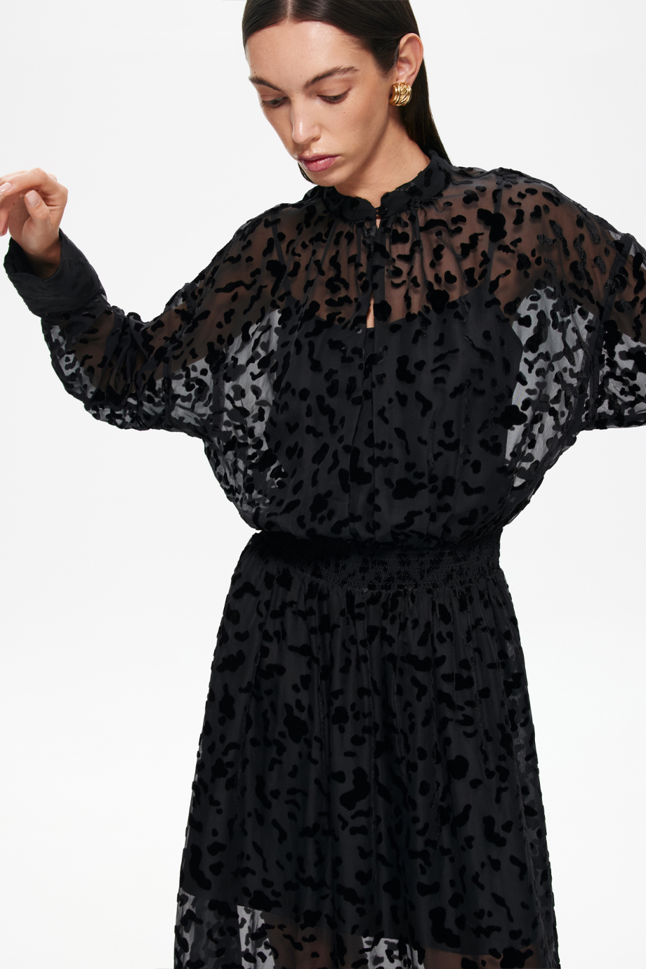 Чёрное платье из деворе — идеальный выбор для создания стильного образа. Эластичный пояс-резинка обеспечивает комфортную посадку по фигуре. Этот элемент одежды станет основой для различных модных комбинаций.