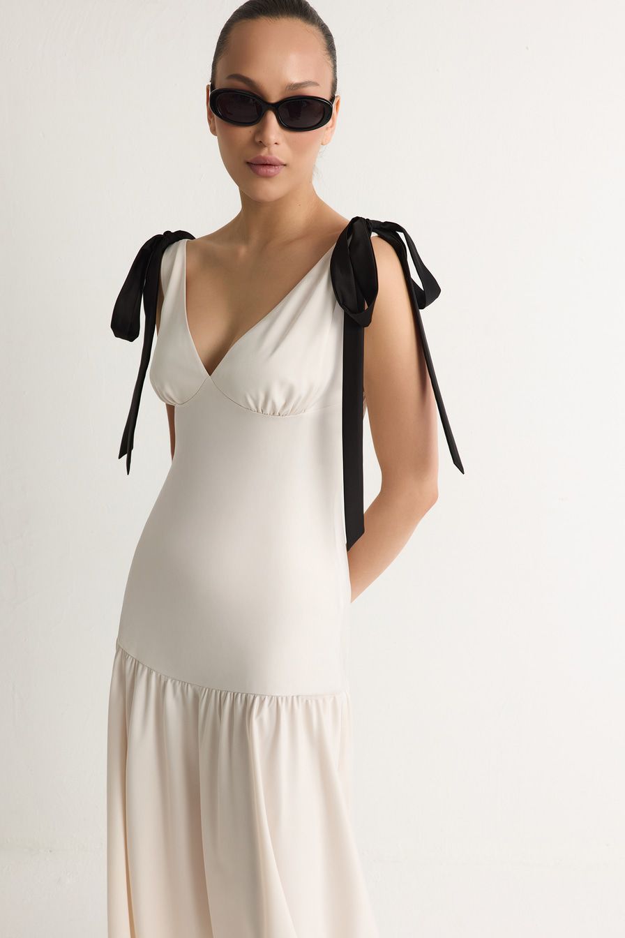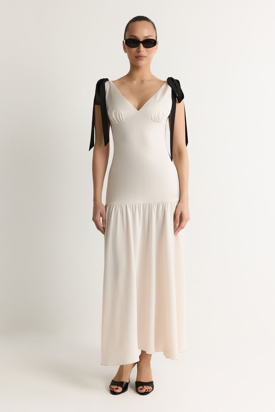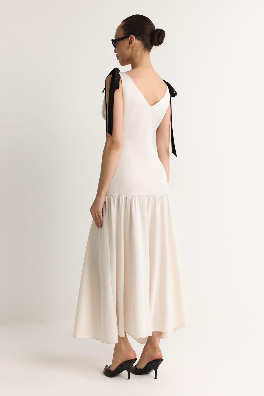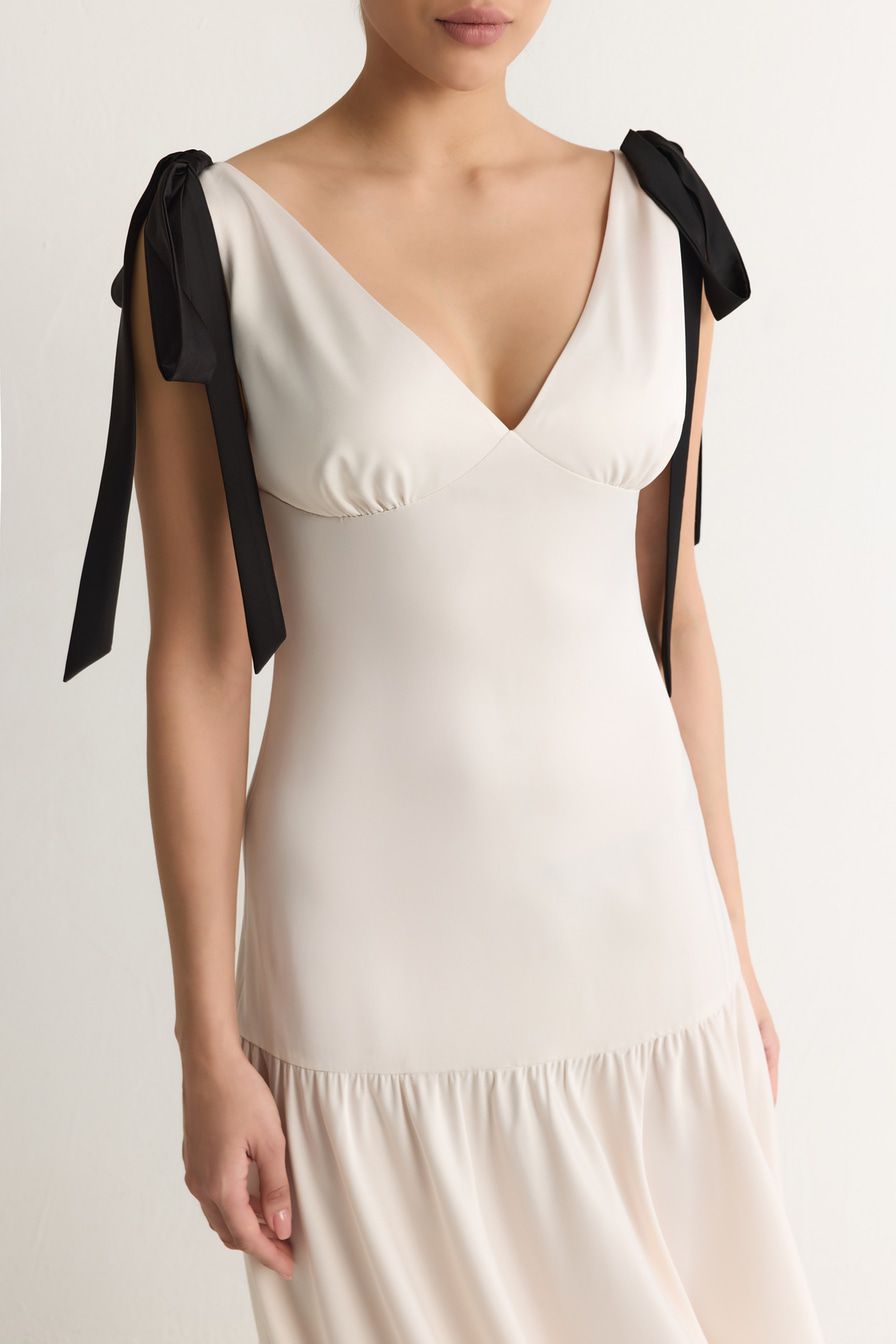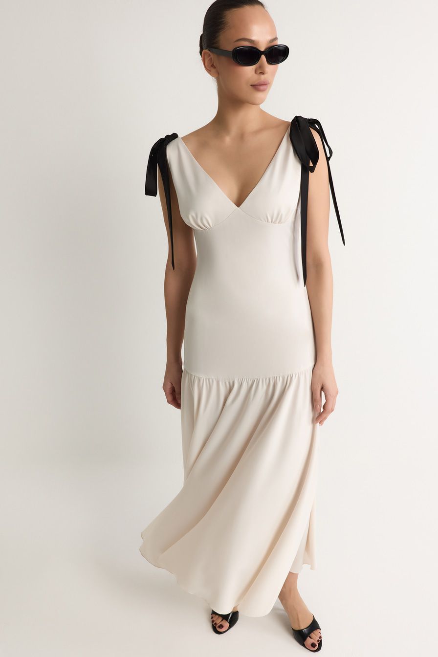 Молочное платье приталенного кроя декорировано бантами на плечах.