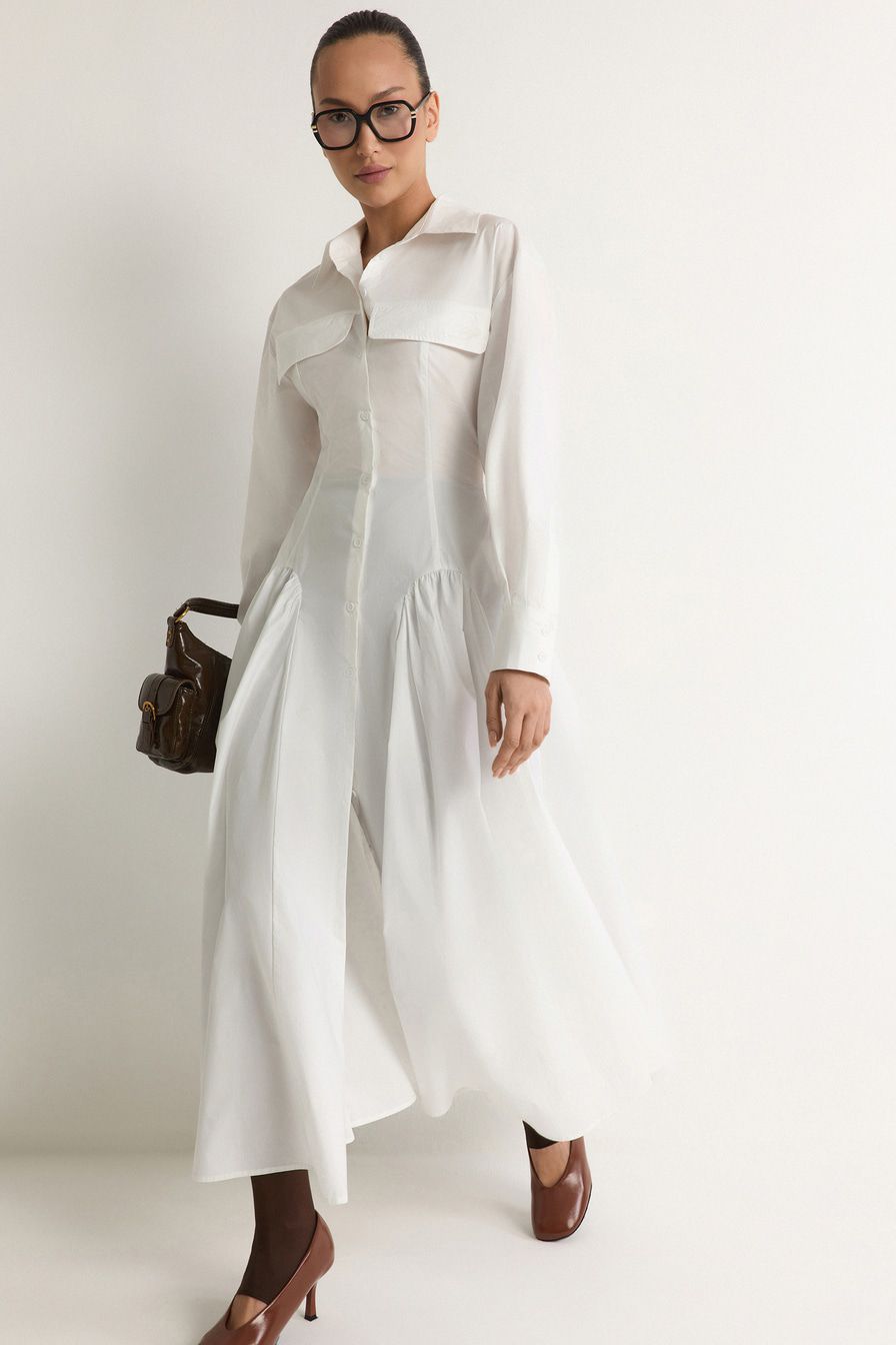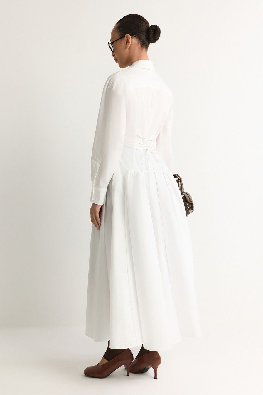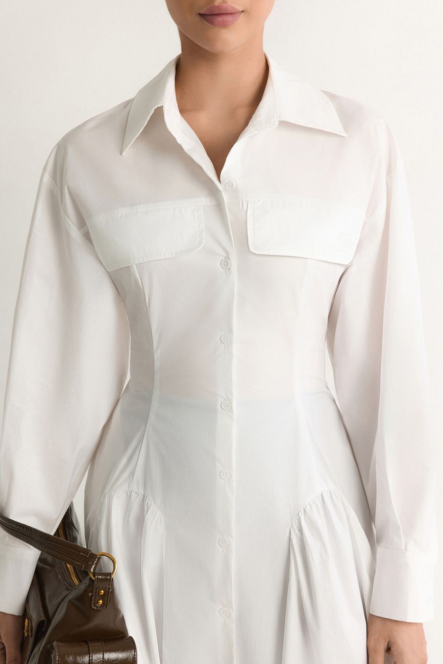 Белое платье-рубашка из смесового хлопка – модель приталенного кроя. Платье дополнено декоративными карманами с клапанами и шнуровкой на спине.