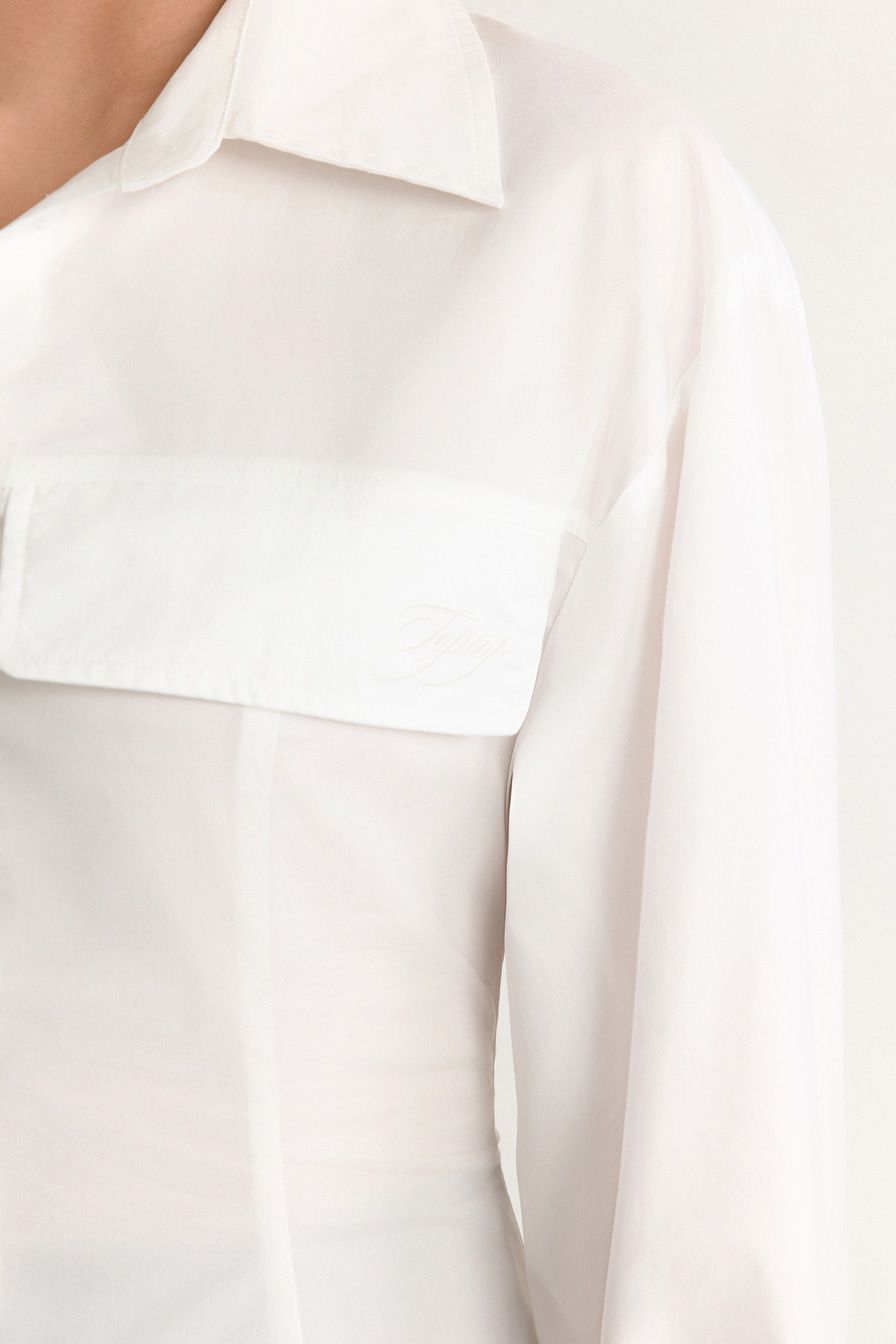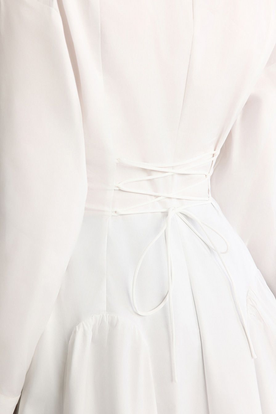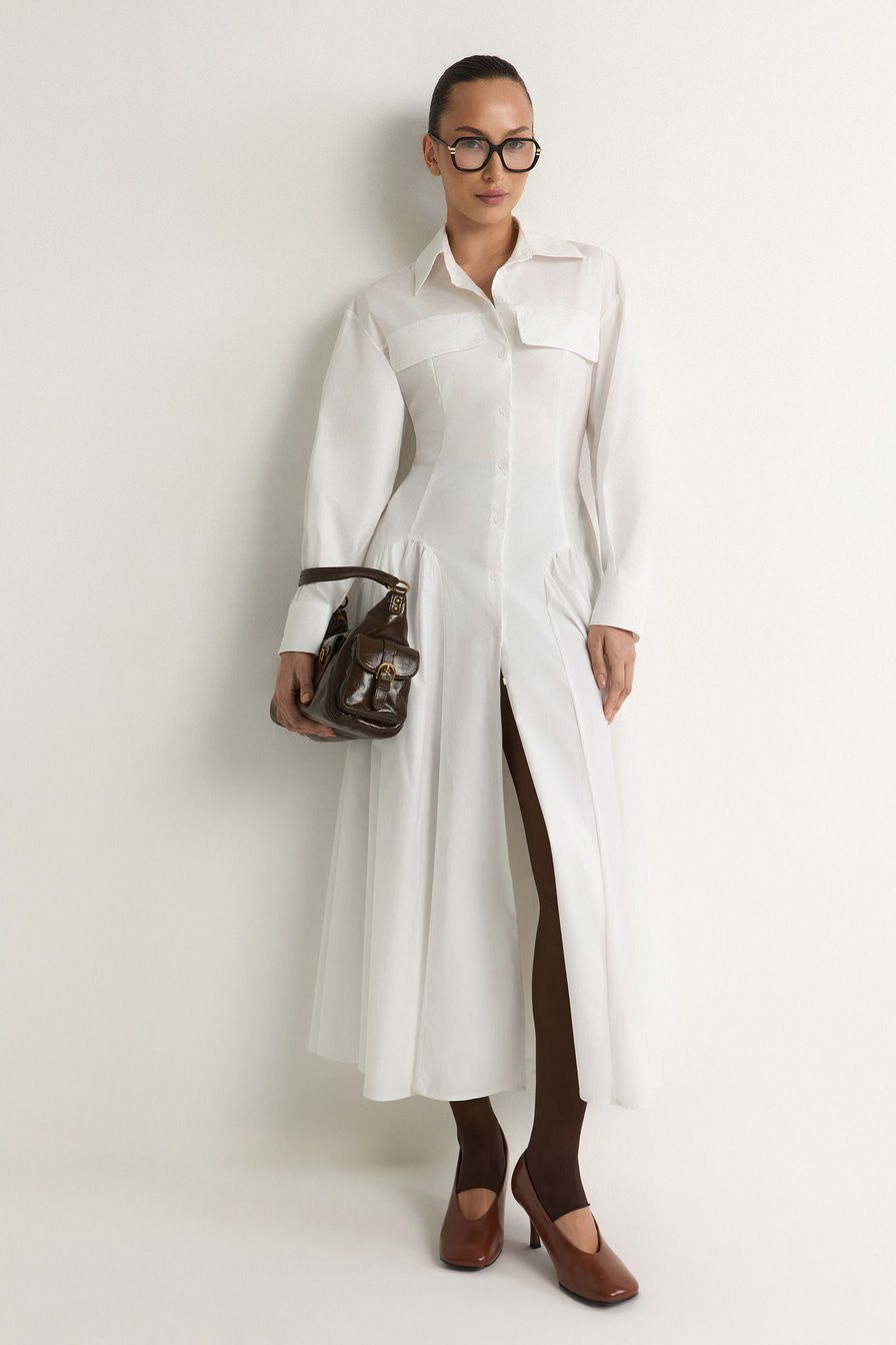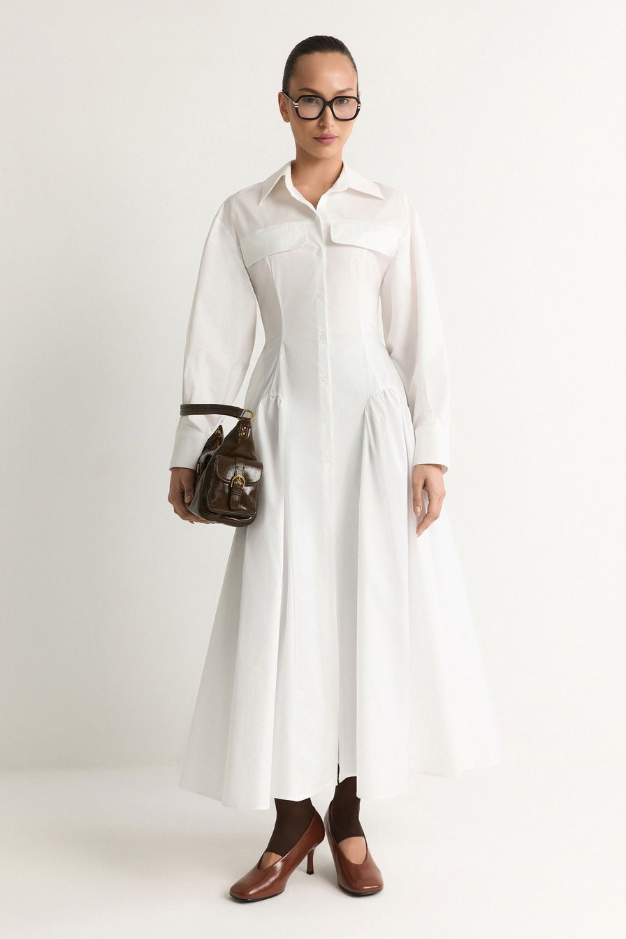 Белое платье-рубашка из смесового хлопка – модель приталенного кроя. Платье дополнено декоративными карманами с клапанами и шнуровкой на спине.