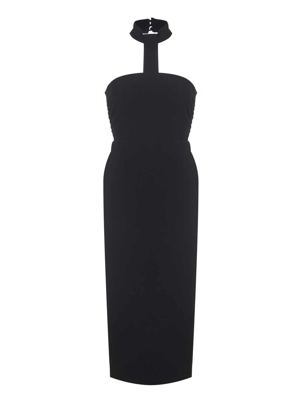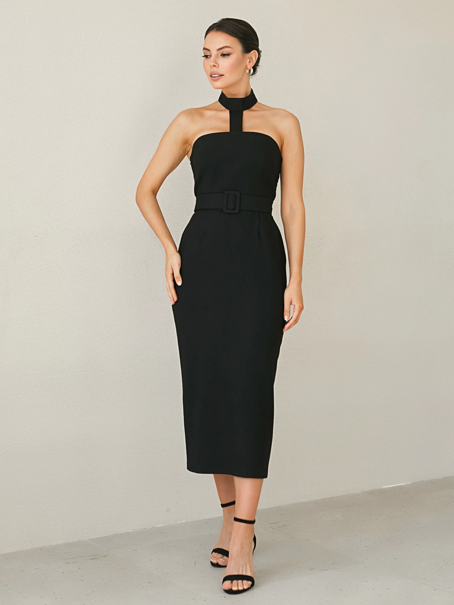 Облегающее платье черного цвета длины миди выполнено из комфортной ткани. В комплект входят два вида чокеров и текстильный пояс с пряжкой. Платье станет удачной инвестицией в базовый гардероб. Днем оно подойдет для офиса, а вечером его можно дополнить эффектными аксессуарами и пойти в ресторан или в театр. Сменные чокеры позволяют по-разному стилизовать платье и создавать интересные образы.