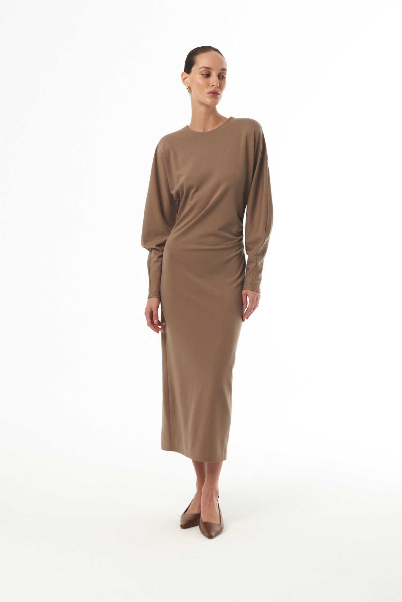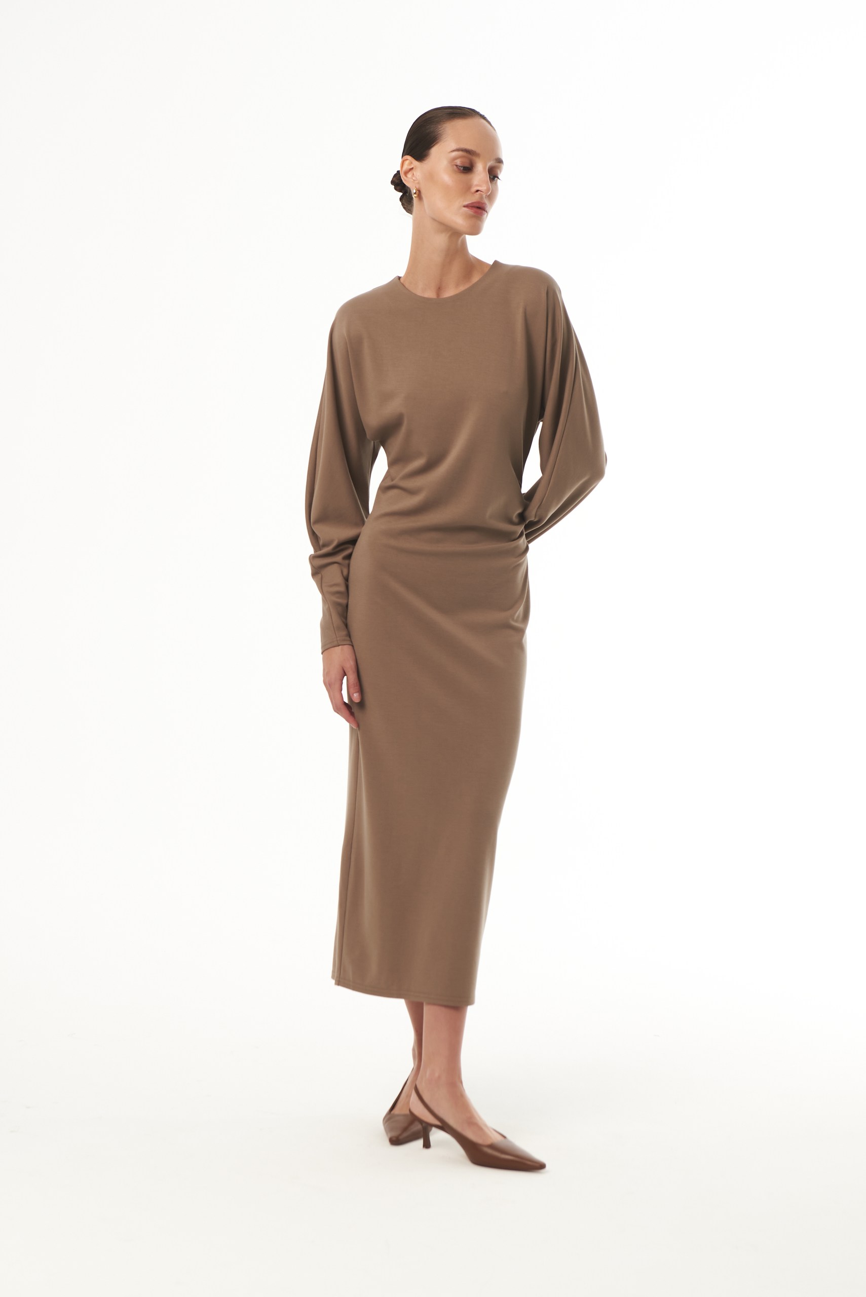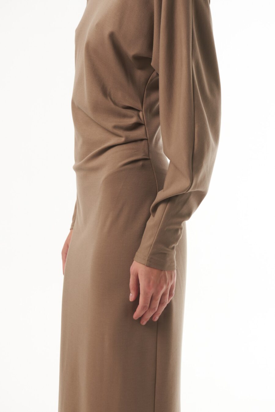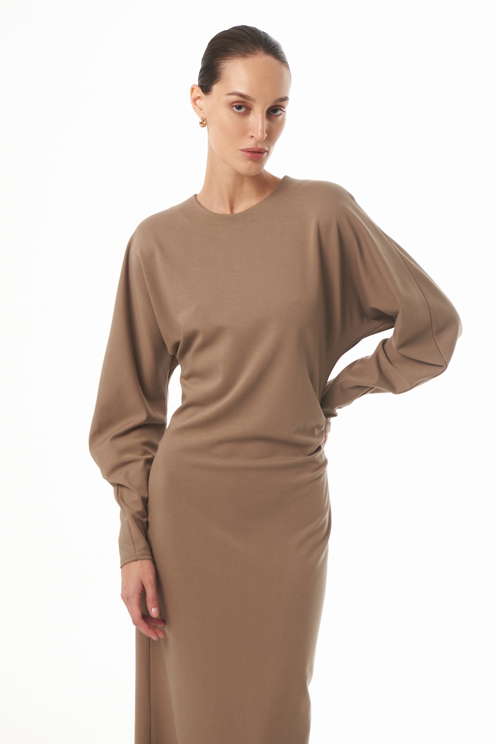 Трикотажное платье умеренного объёма, с расширенным плечевым поясом, по боковому шву, в районе талии три складки, длина миди. Рукав втачной, одношовный, расклешенный к низу, длиной ниже линии запястья.