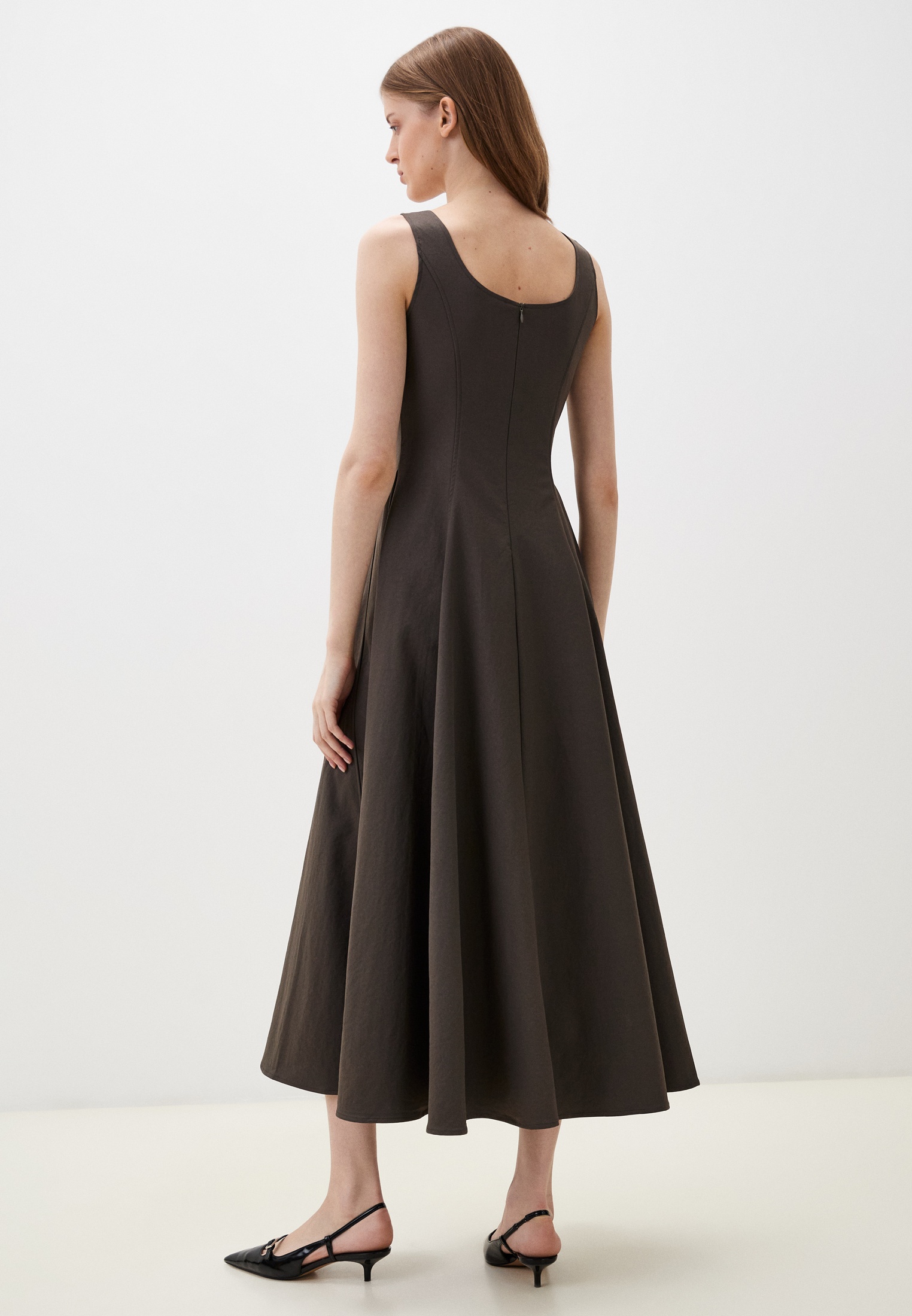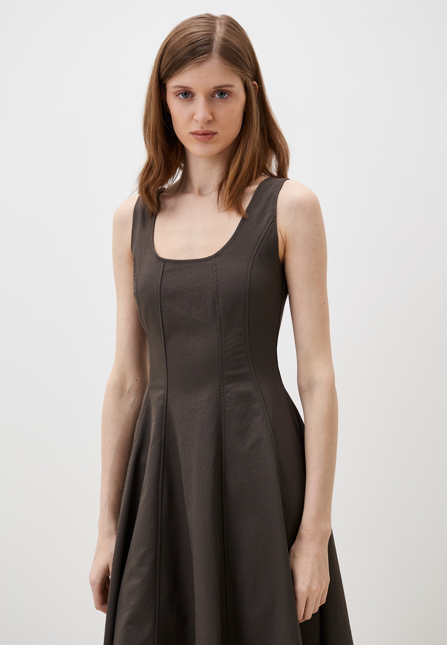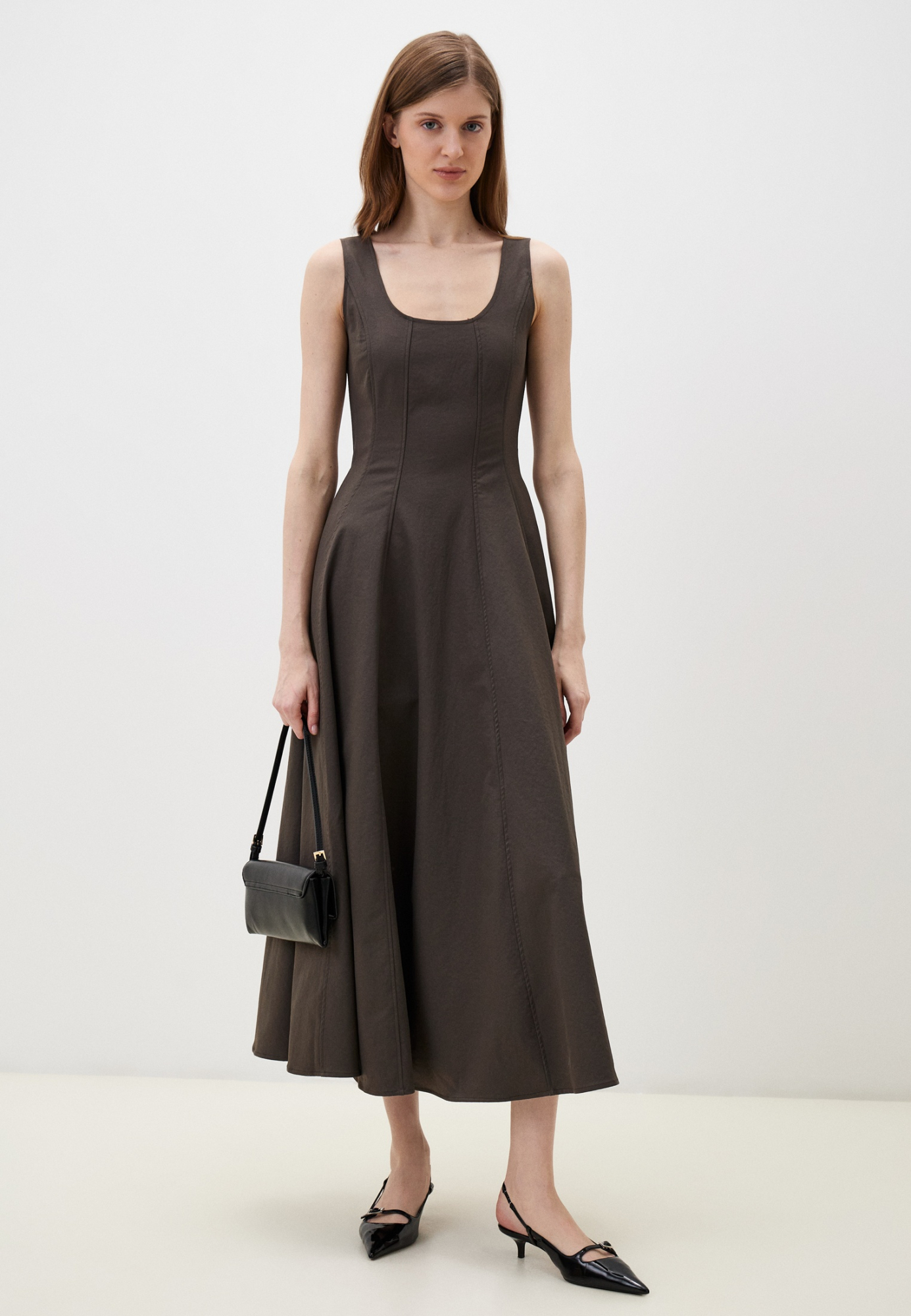 Белое платье-миди с выточками — про спокойствие и чистую форму. Широкие бретели, комфортная посадка и сдержанный силуэт для тех, кто выбирает гармонию без излишков.