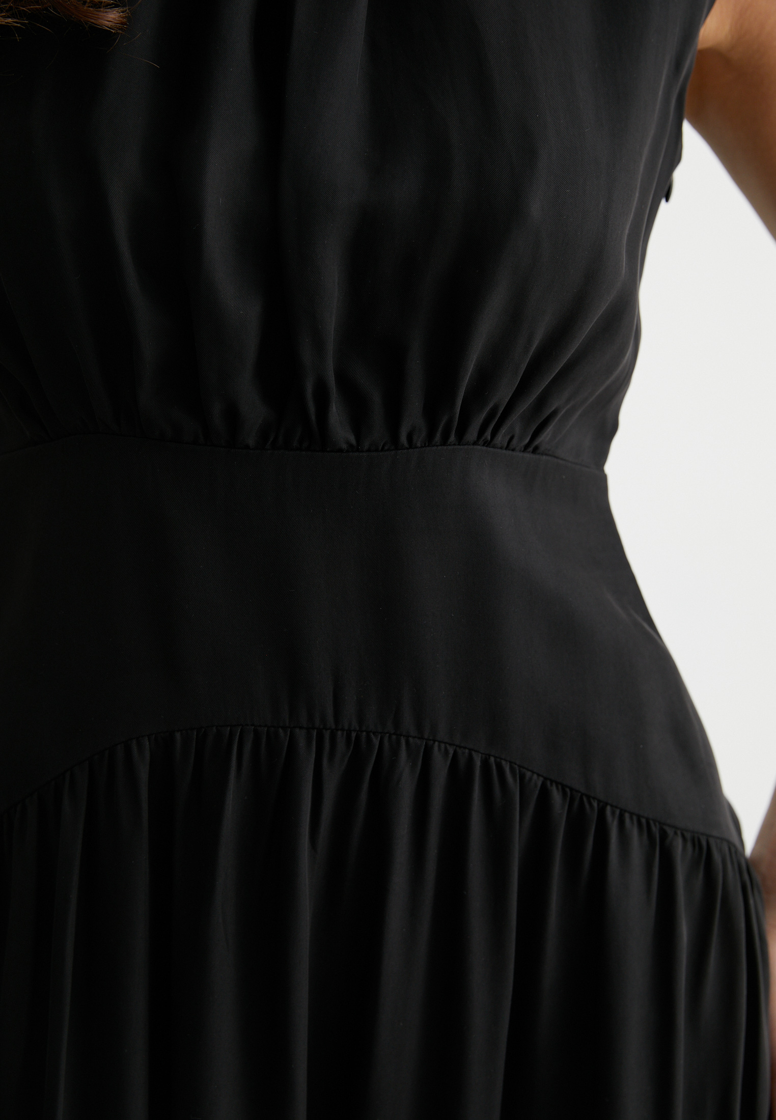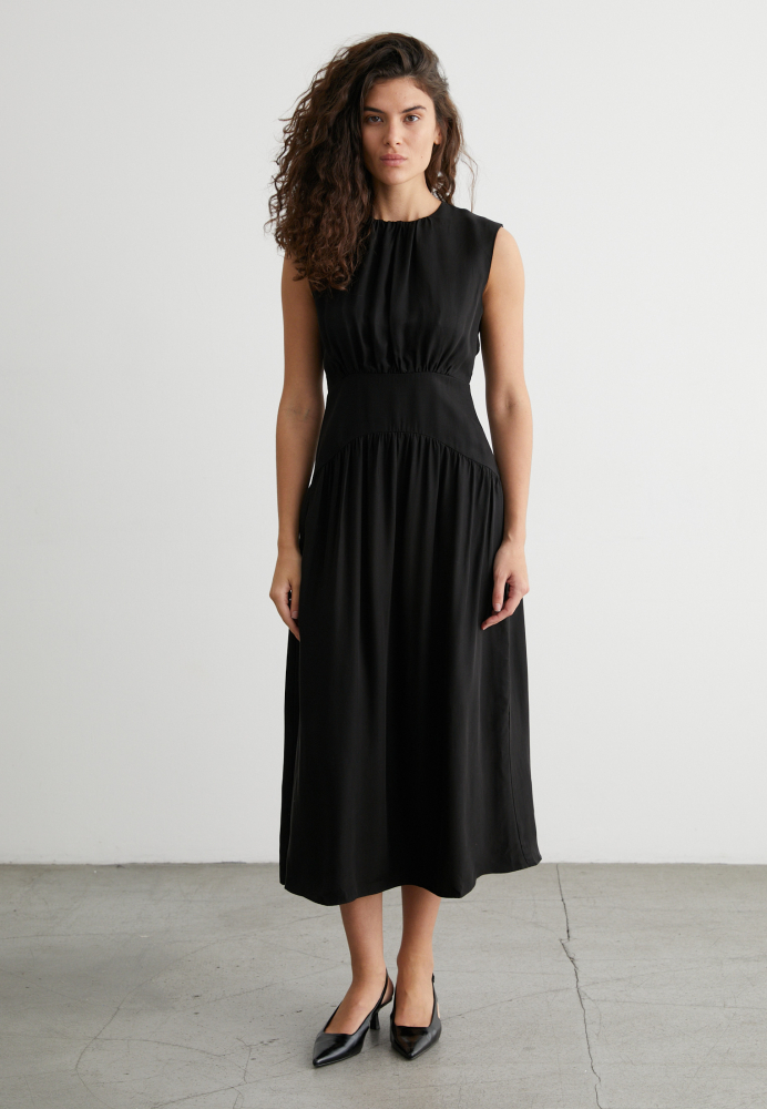 Платье миди без рукавов, с мягкими складками на талии — идеально для офиса, свидания или вечернего выхода. Материал держит форму, не мнётся и приятно струится как вторая кожа.
