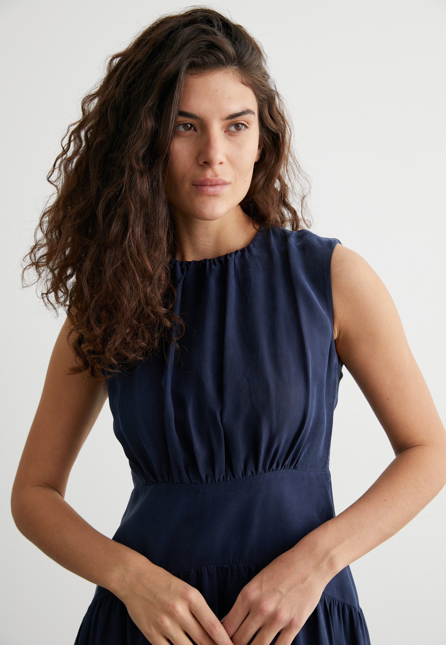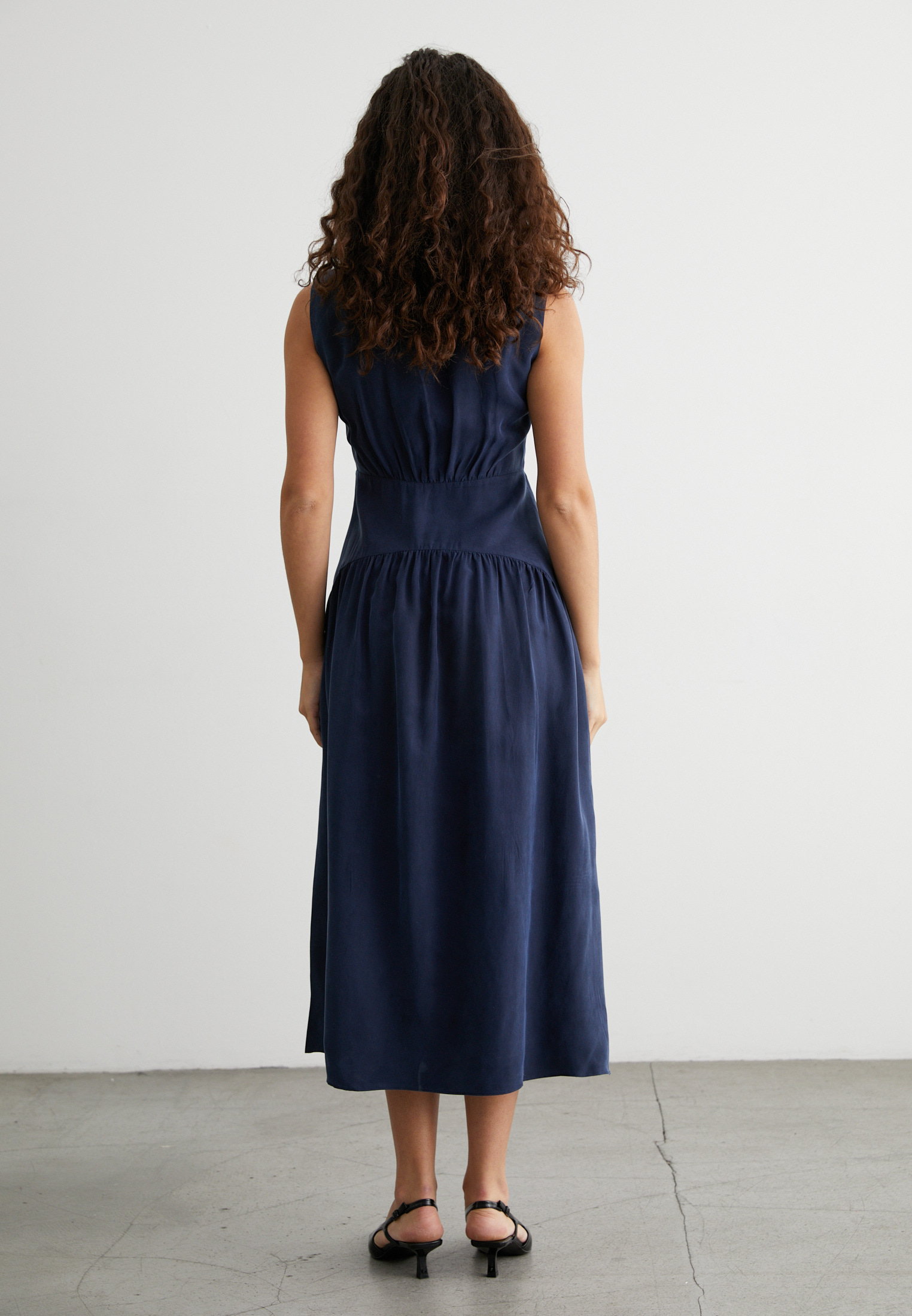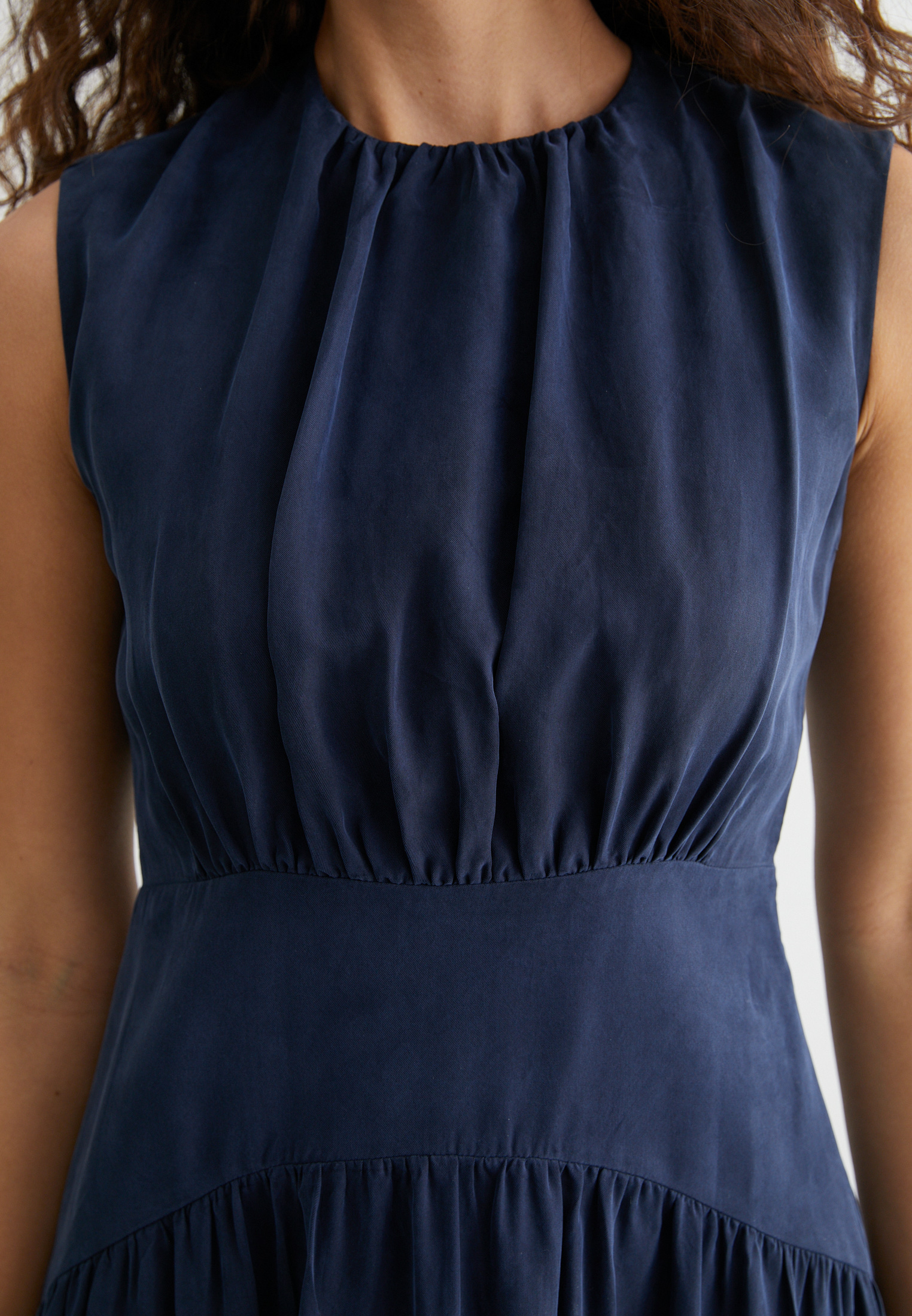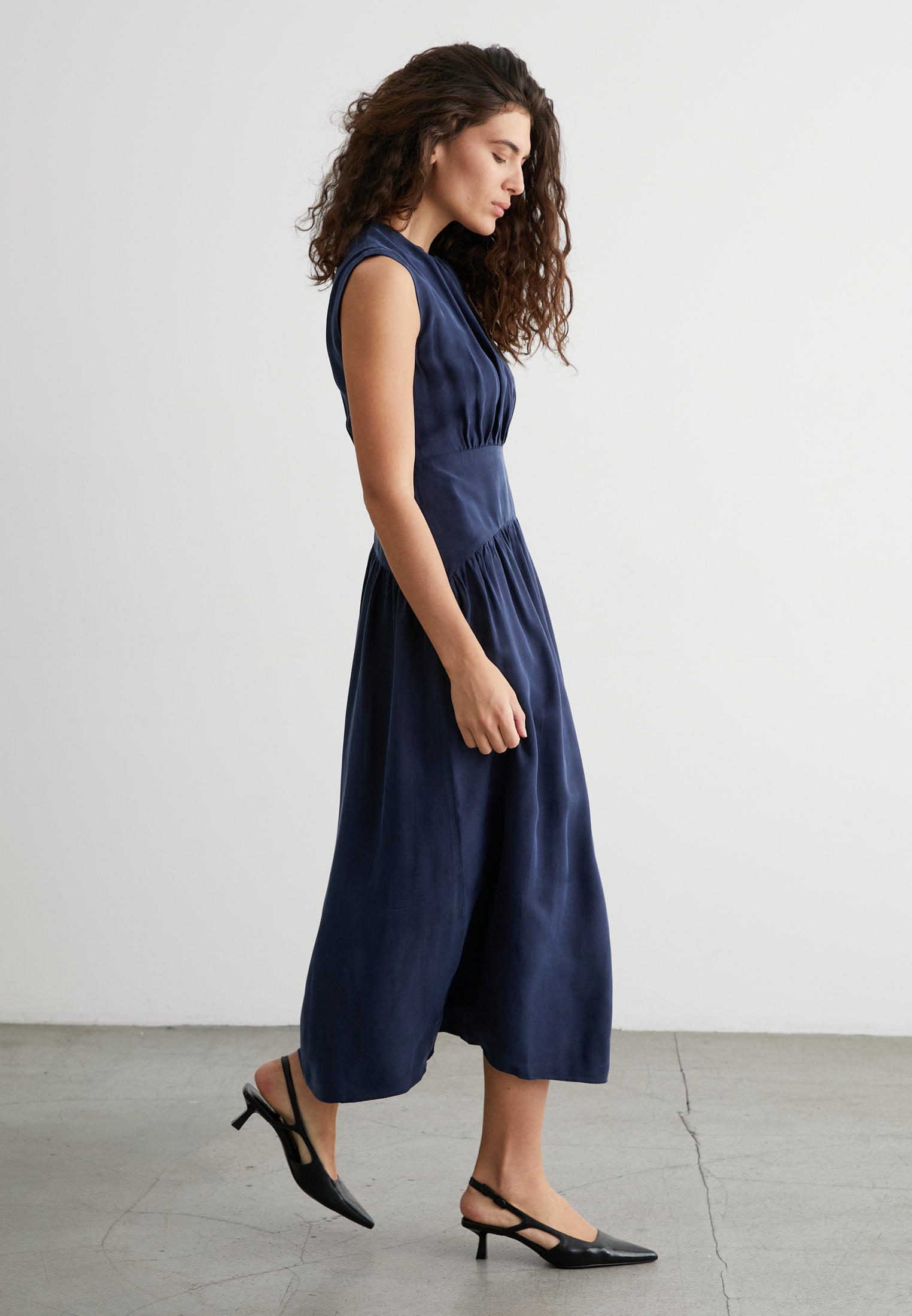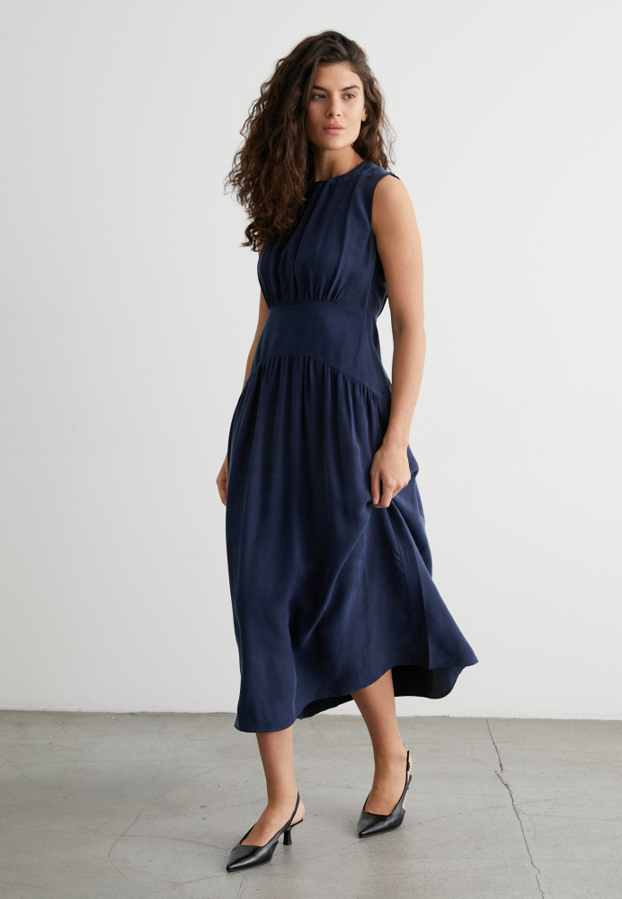 Платье миди без рукавов, с мягкими складками на талии — идеально для офиса, свидания или вечернего выхода. Материал держит форму, не мнётся и приятно струится как вторая кожа.