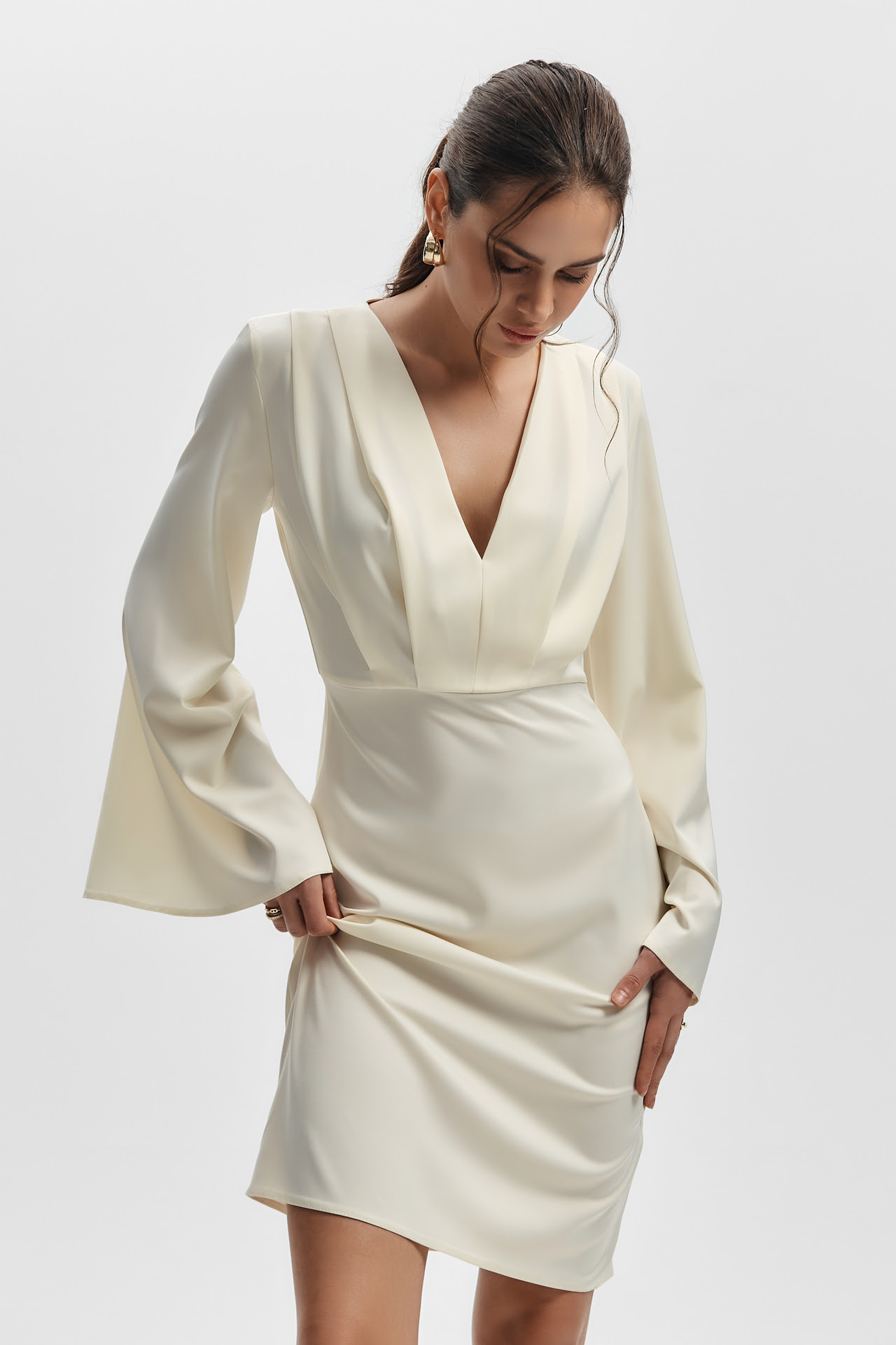 Элегантное платье молочного цвета с V-образным вырезом. Идеальный выбор для создания женственного и утончённого образа. Подходит для различных мероприятий и встреч.