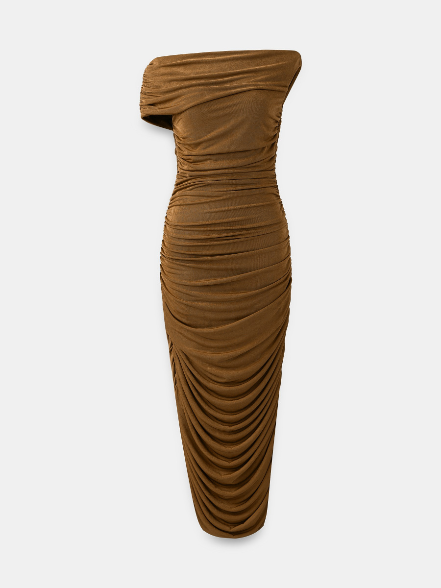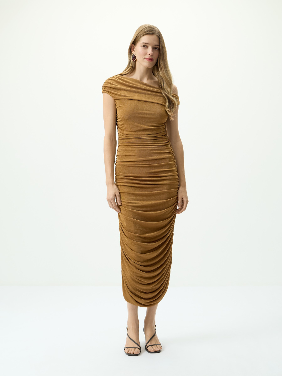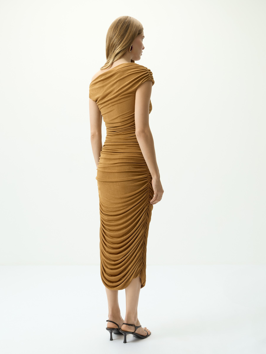 Драпированное платье мидакси с ассиметричной линией плеч подойдет как для особенных вечеров, так и неспешных прогулок по ночному городу. Рукава комфортно зафиксированы и не требуют внимания в процессе носки. Фактурная немнущаяся ткань с застроченными драпировкам деликатно очерчивает силуэт и растушевывает нюансы.