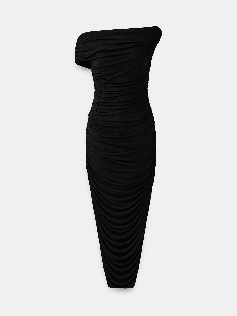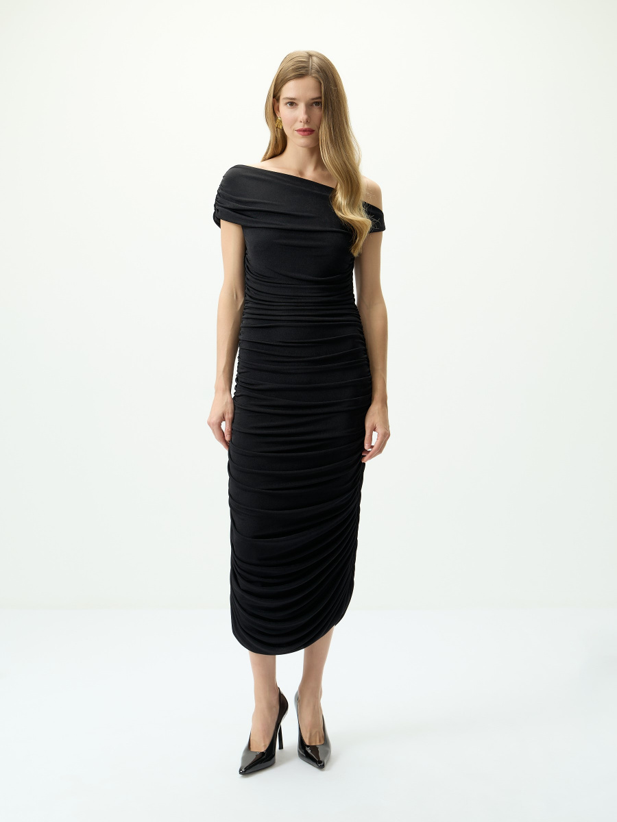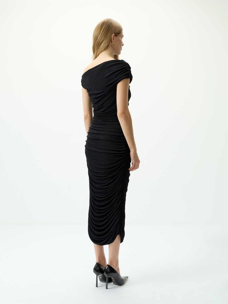 Драпированное платье мидакси с ассиметричной линией плеч подойдет как для особенных вечеров, так и неспешных прогулок по ночному городу. Рукава комфортно зафиксированы и не требуют внимания в процессе носки. Фактурная немнущаяся ткань с застроченными драпировкам деликатно очерчивает силуэт и растушевывает нюансы.