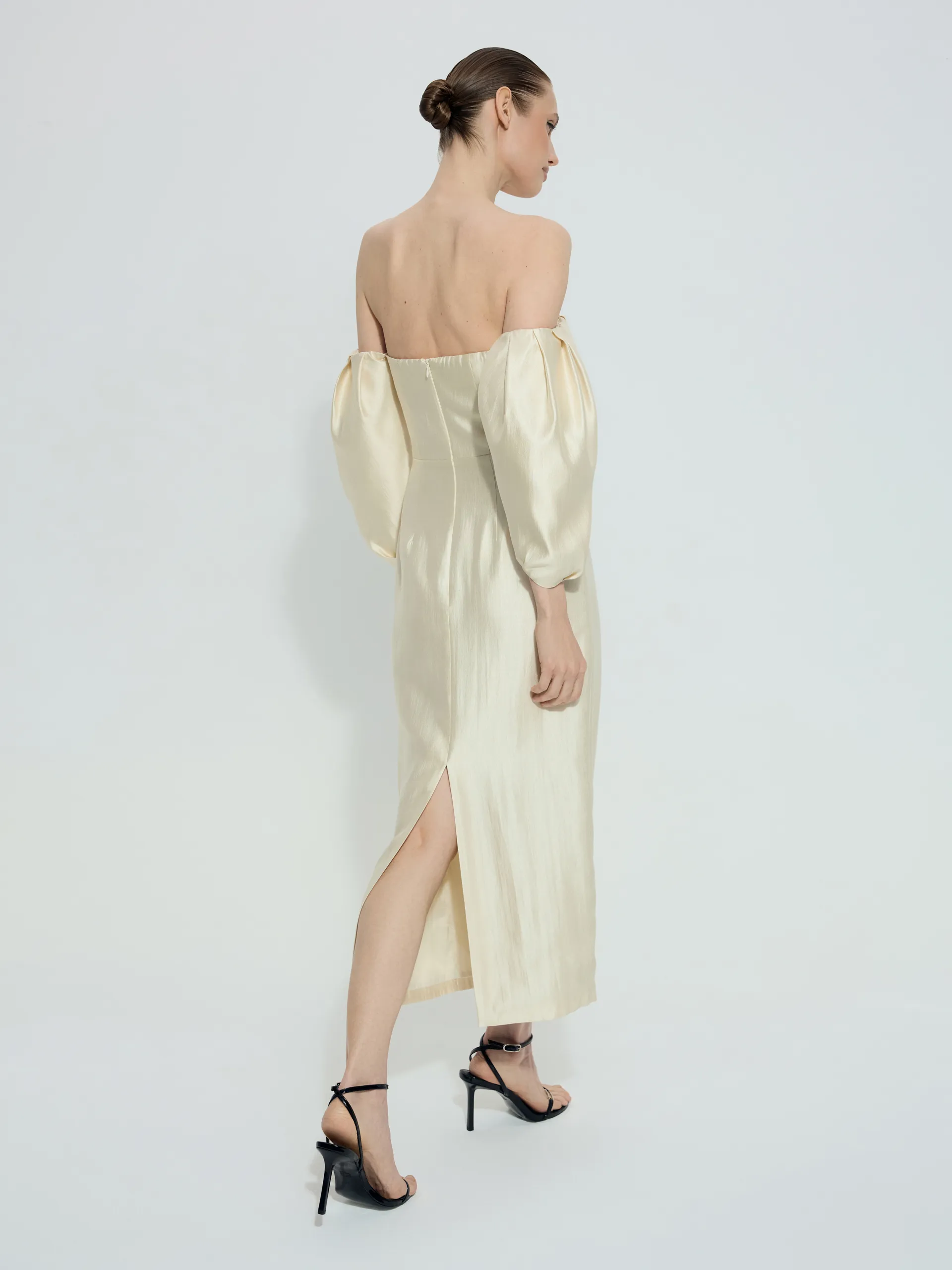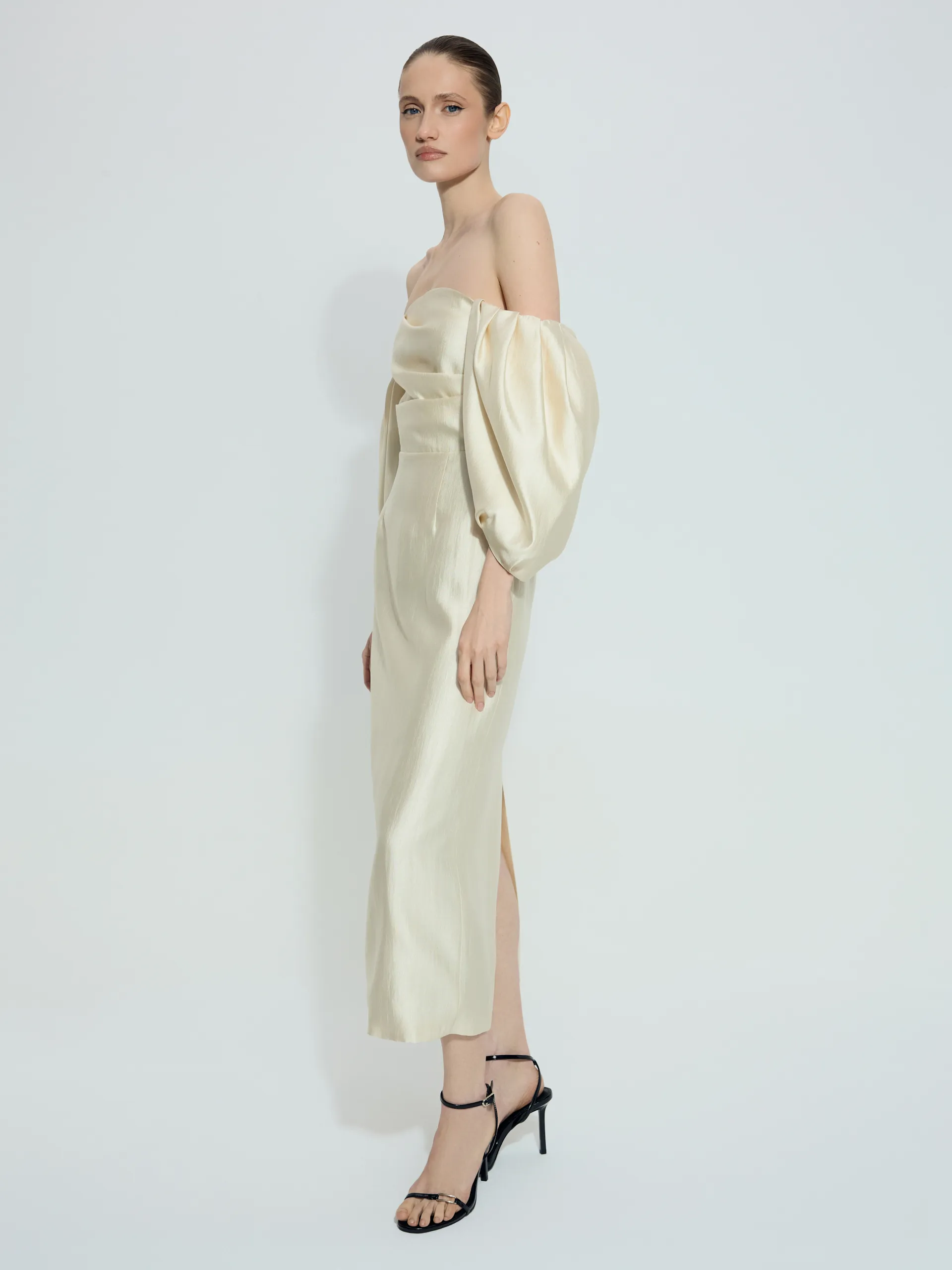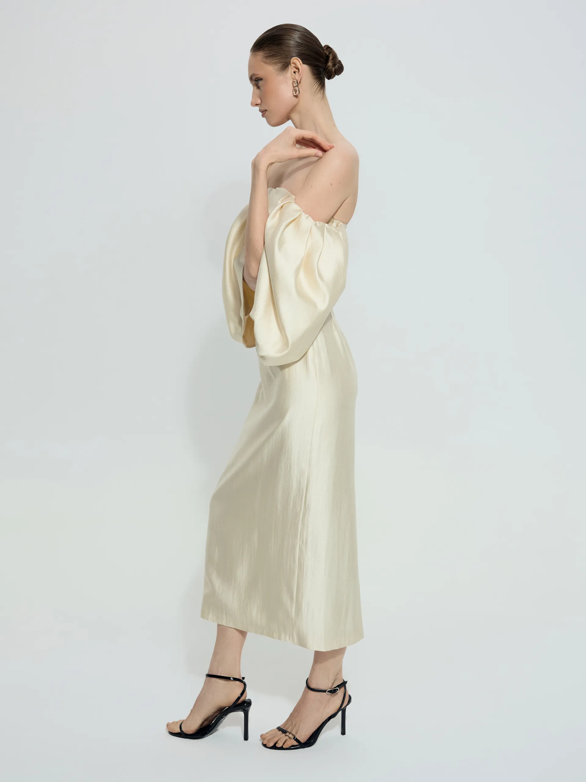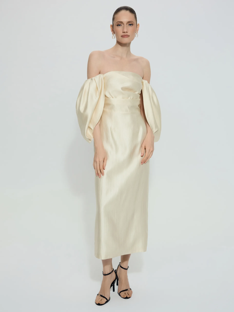 Платье Sorel — элегантная модель в кремовом оттенке, выполненная из ткани с деликатным благородным блеском. Приталенный силуэт с драпировкой по лифу подчеркивает талию, открытая линия плеч делает образ выразительным, а рукава-«цветы» добавляют мягкой романтичности. Завышенная талия визуально вытягивает силуэт. Благодаря высокому содержанию тенсела платье комфортно и подходит не только для зимних выходов, но и для тёплого сезона. Дополнить образ можно аккуратными босоножками, туфлями и лаконичными украшениями — так сохраняется легкость и утончённость силуэта.