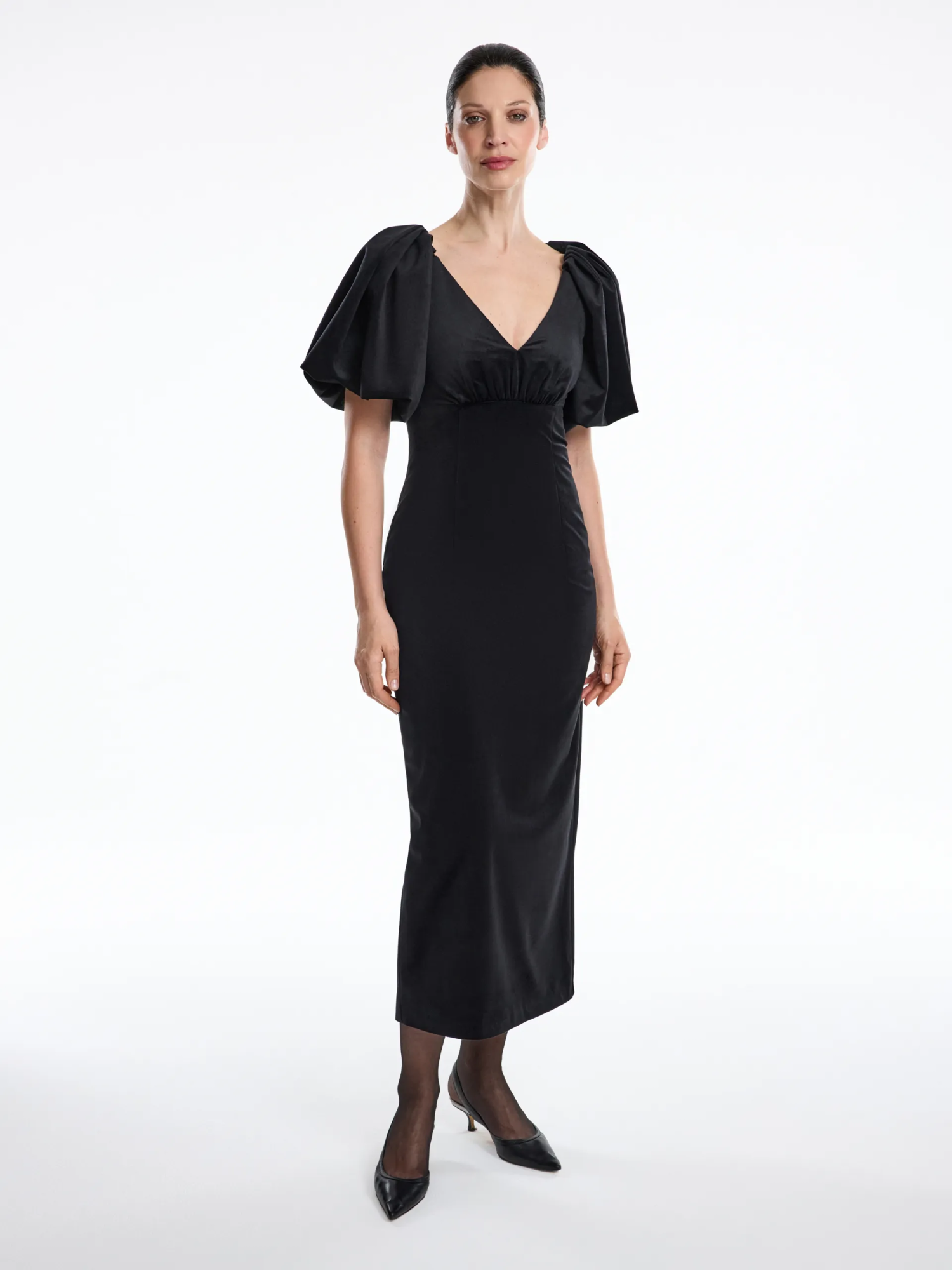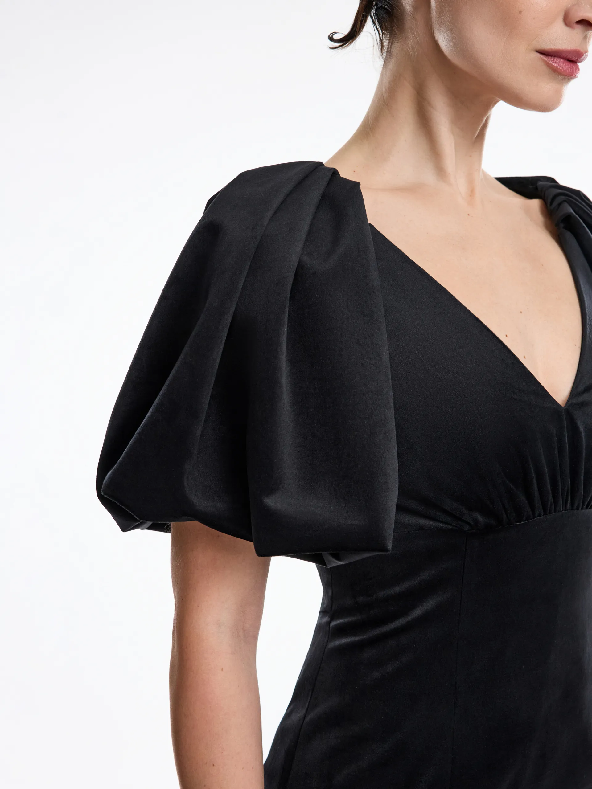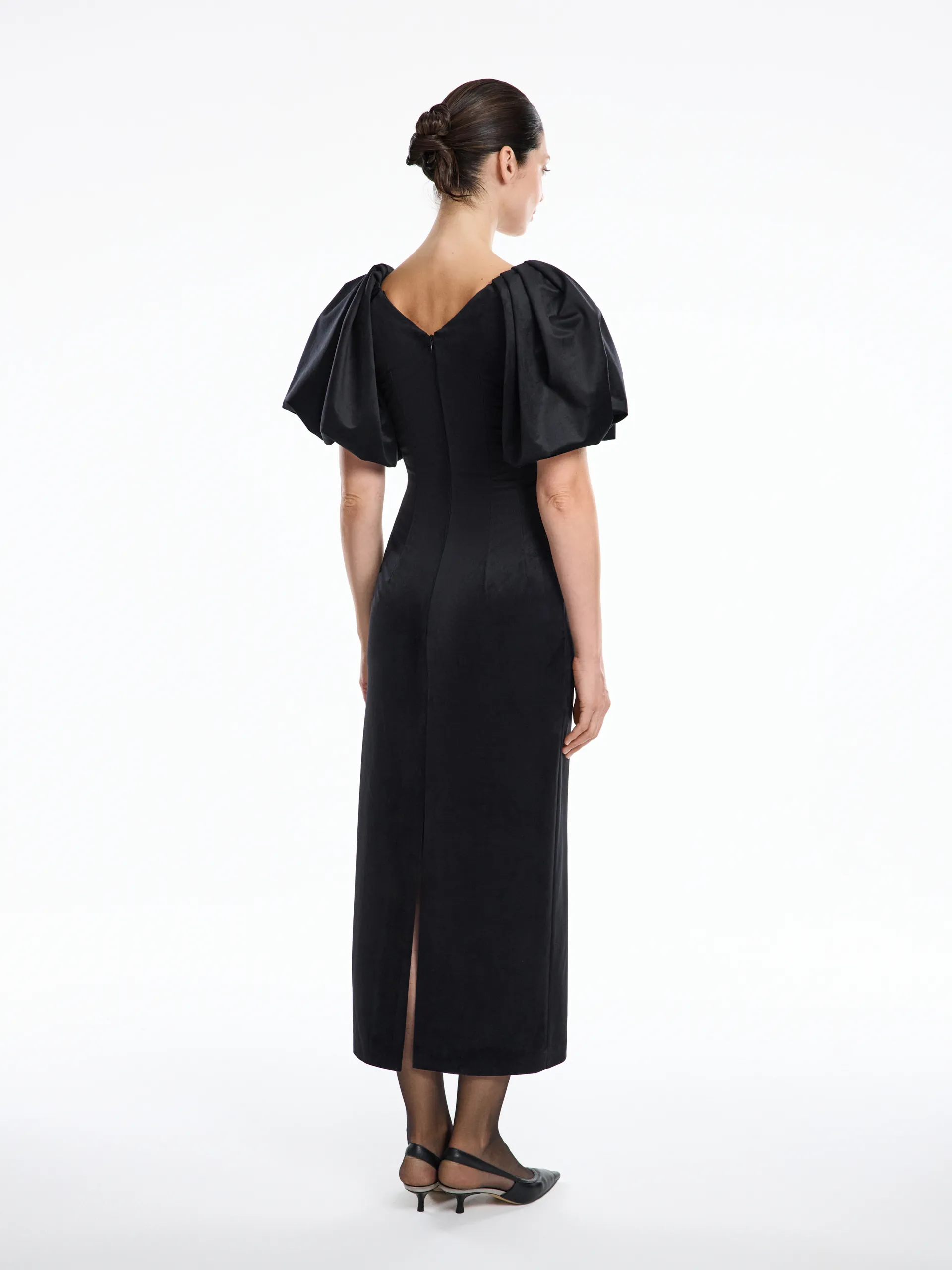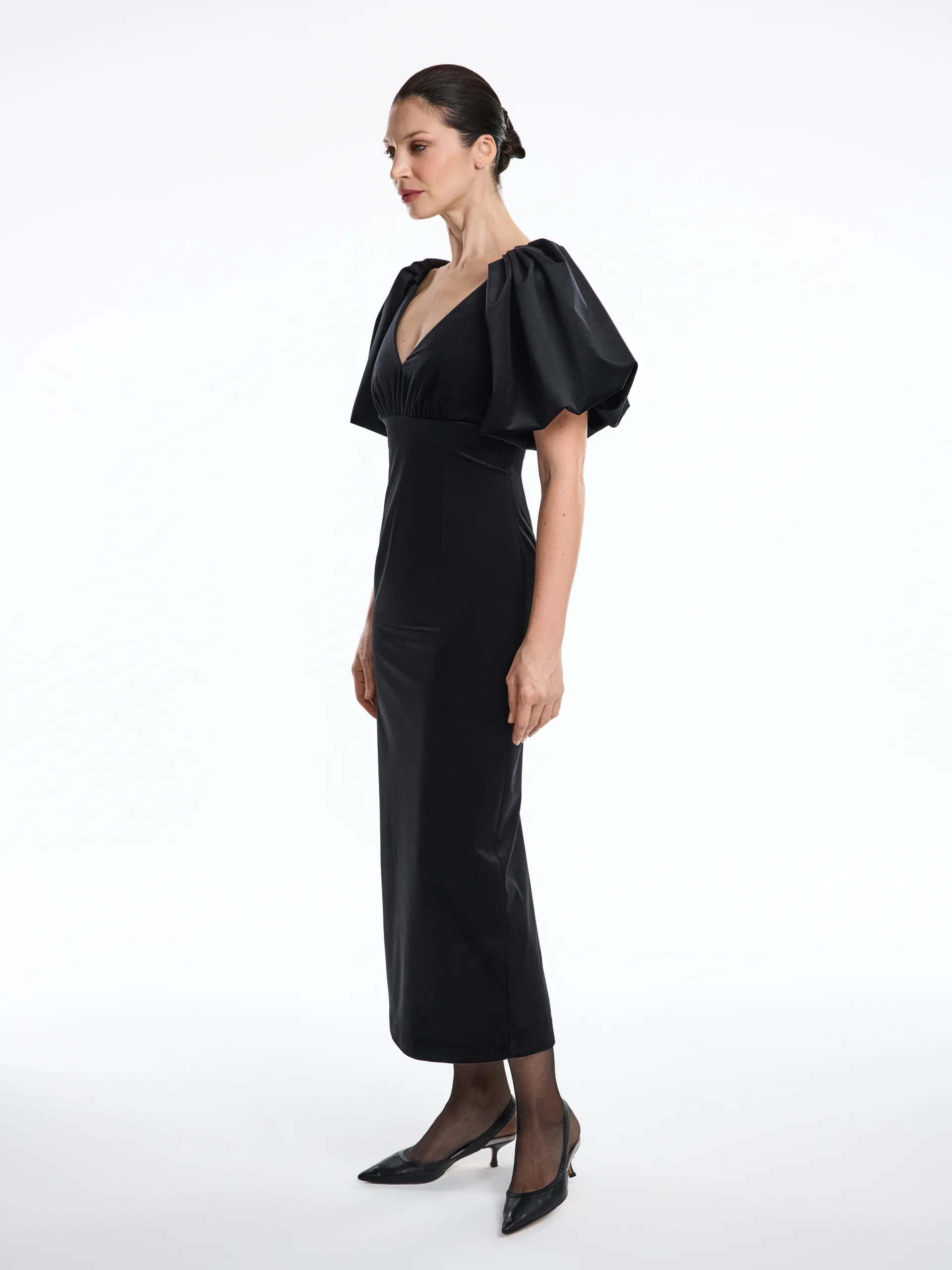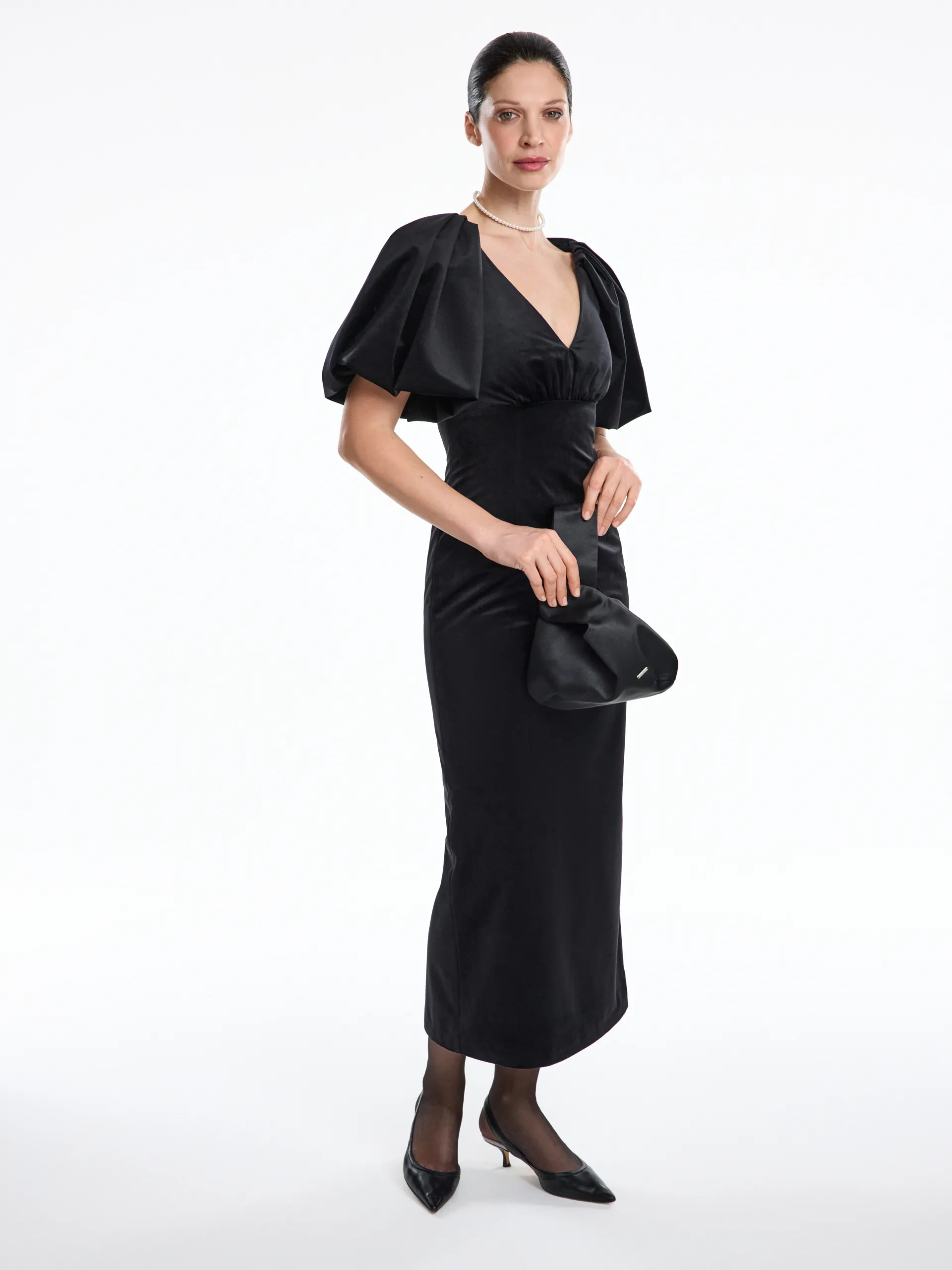 Платье Thalia из итальянского бархата в чёрном цвете — выразительная модель с акцентом на силуэт и фактуру ткани. Пластичный бархат красиво отражает свет и мягко подчёркивает линии фигуры, а акцентные рукава добавляют образу характер. Завышенная линия талии визуально вытягивает пропорции, длина мидакси делает платье универсальным для разных случаев. Модель смотрится эффектно и при этом сдержанно, легко сочетаясь с лаконичной обувью и минималистичными аксессуарами.