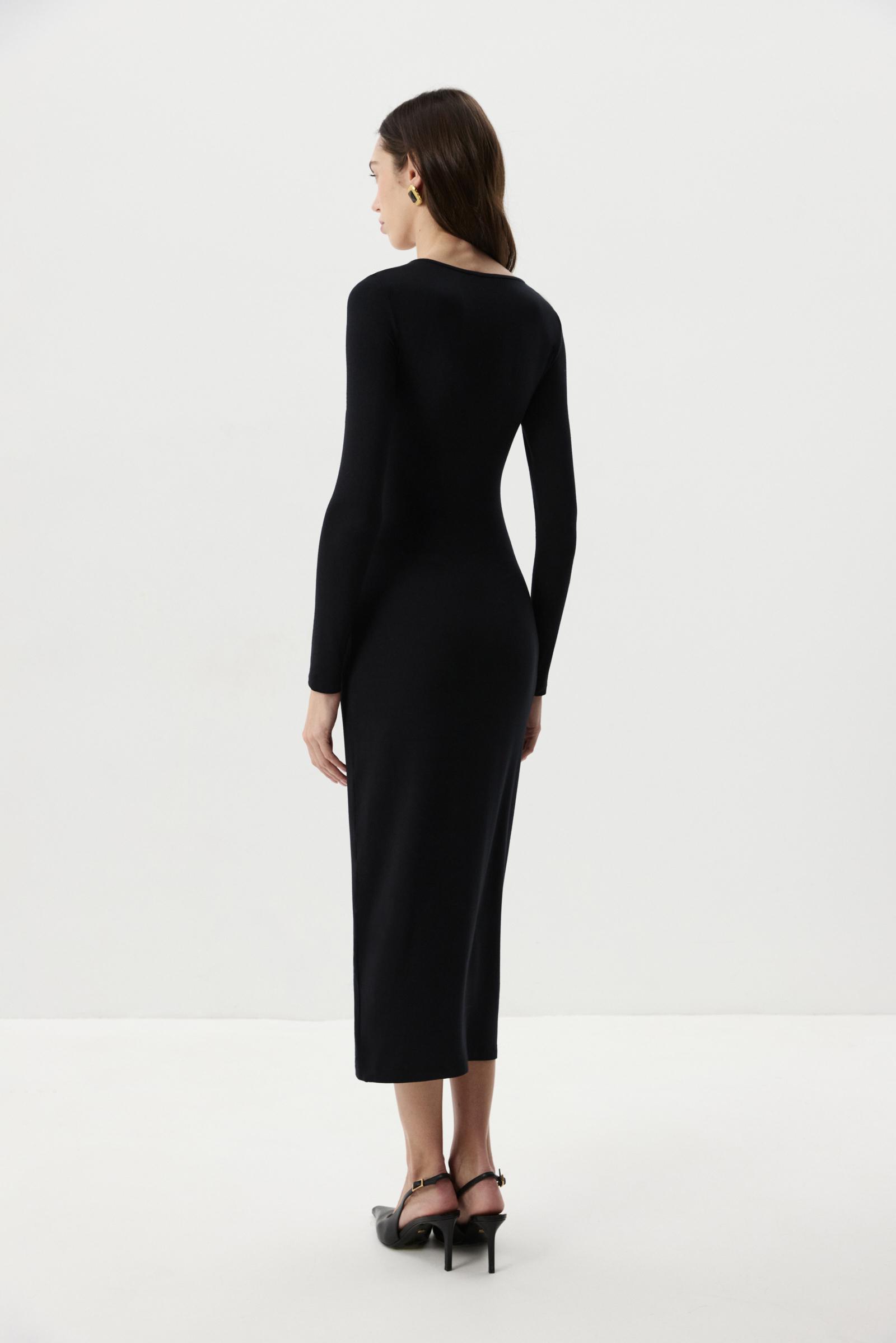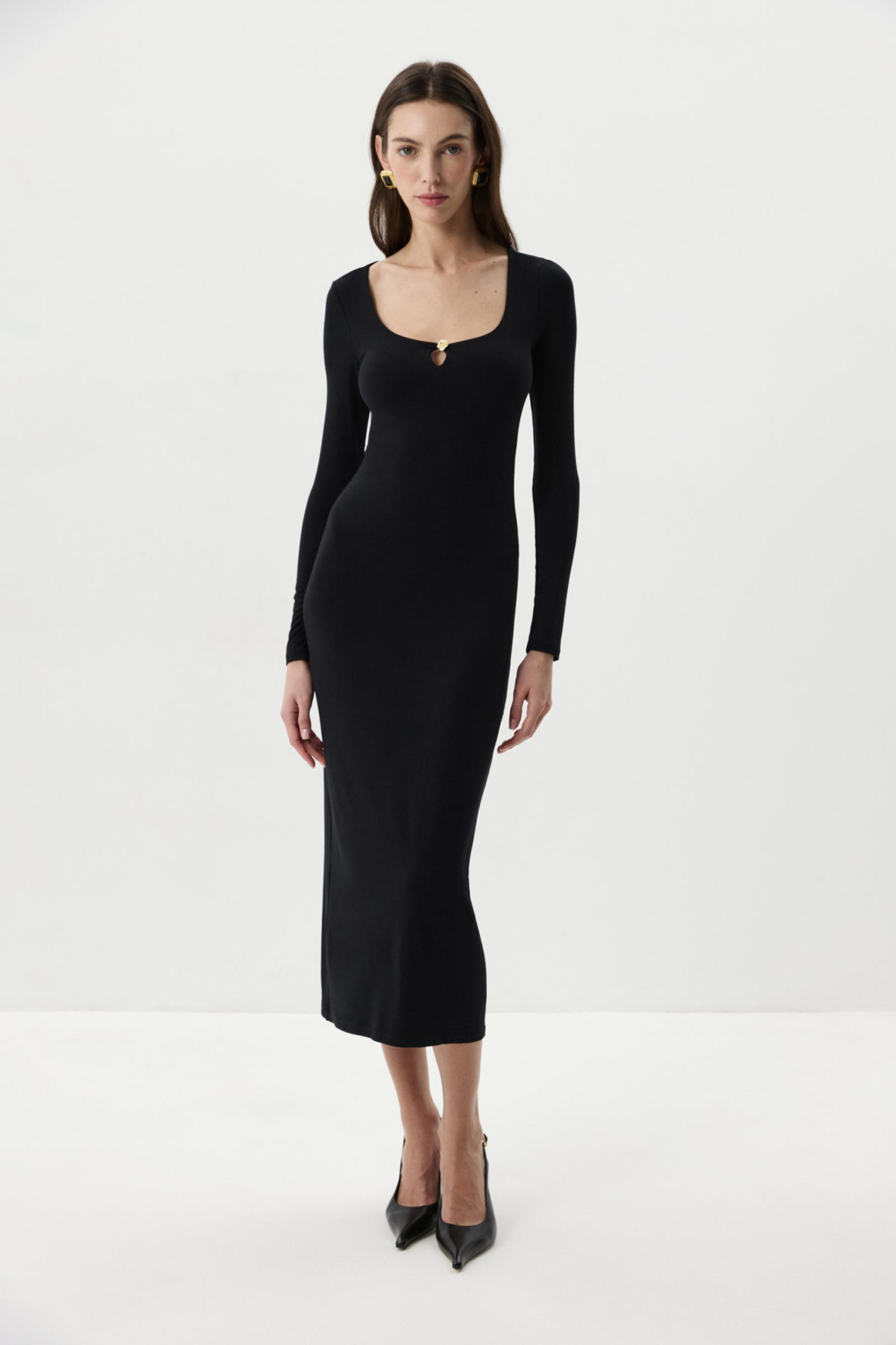 Платье из вискозного трикотажа в длине миди. Платье прилегающего силуэта с длинным рукавом. Глубокое декольте подчеркивает линию ключиц, а декоративный элемент в виде золотой розы добавляет платью акцент.
