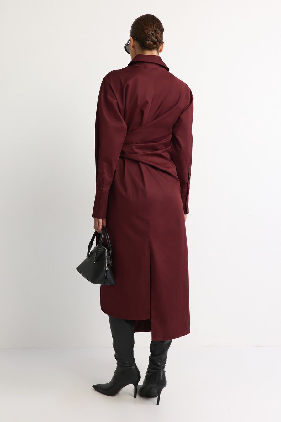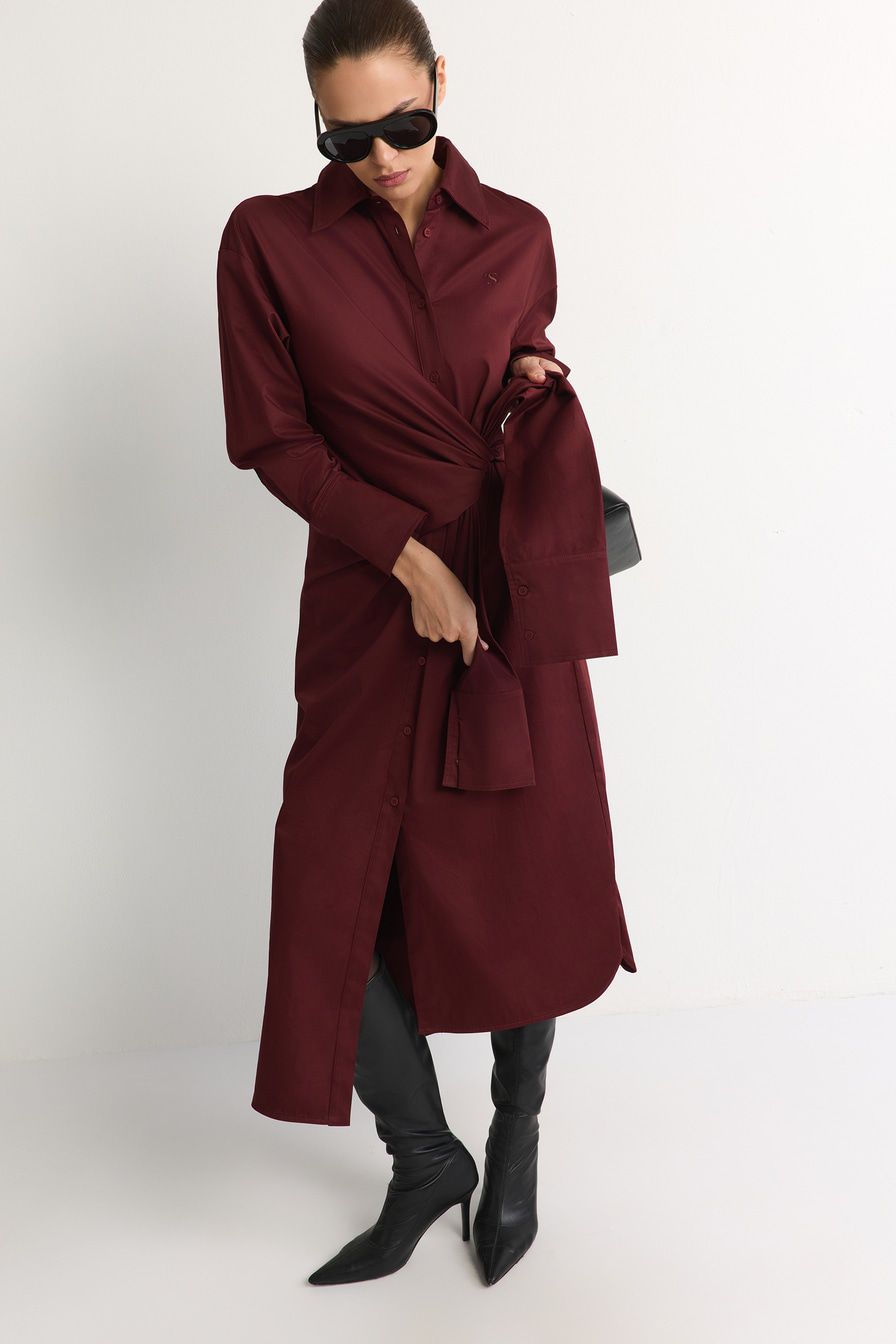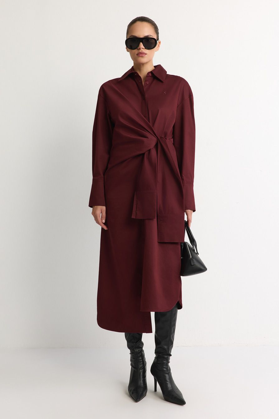 Бордовое платье-рубашка из смесового хлопка – модель свободного асимметричного кроя. Платье дополнено декоративными рукавами, которые завязываются на талии.