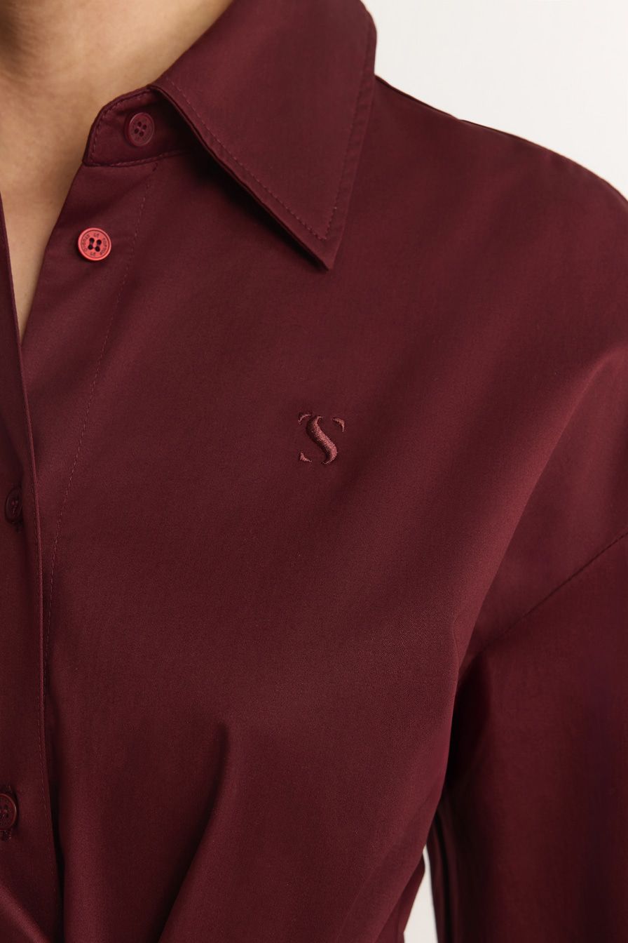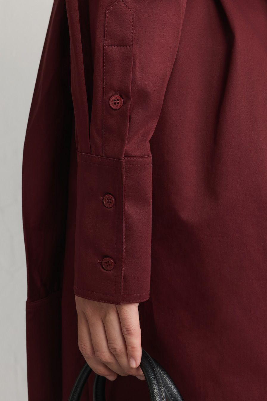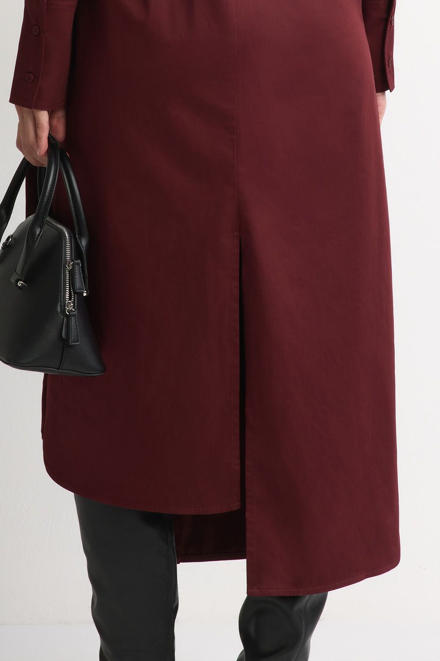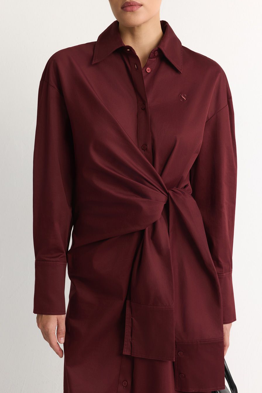 Бордовое платье-рубашка из смесового хлопка – модель свободного асимметричного кроя. Платье дополнено декоративными рукавами, которые завязываются на талии.