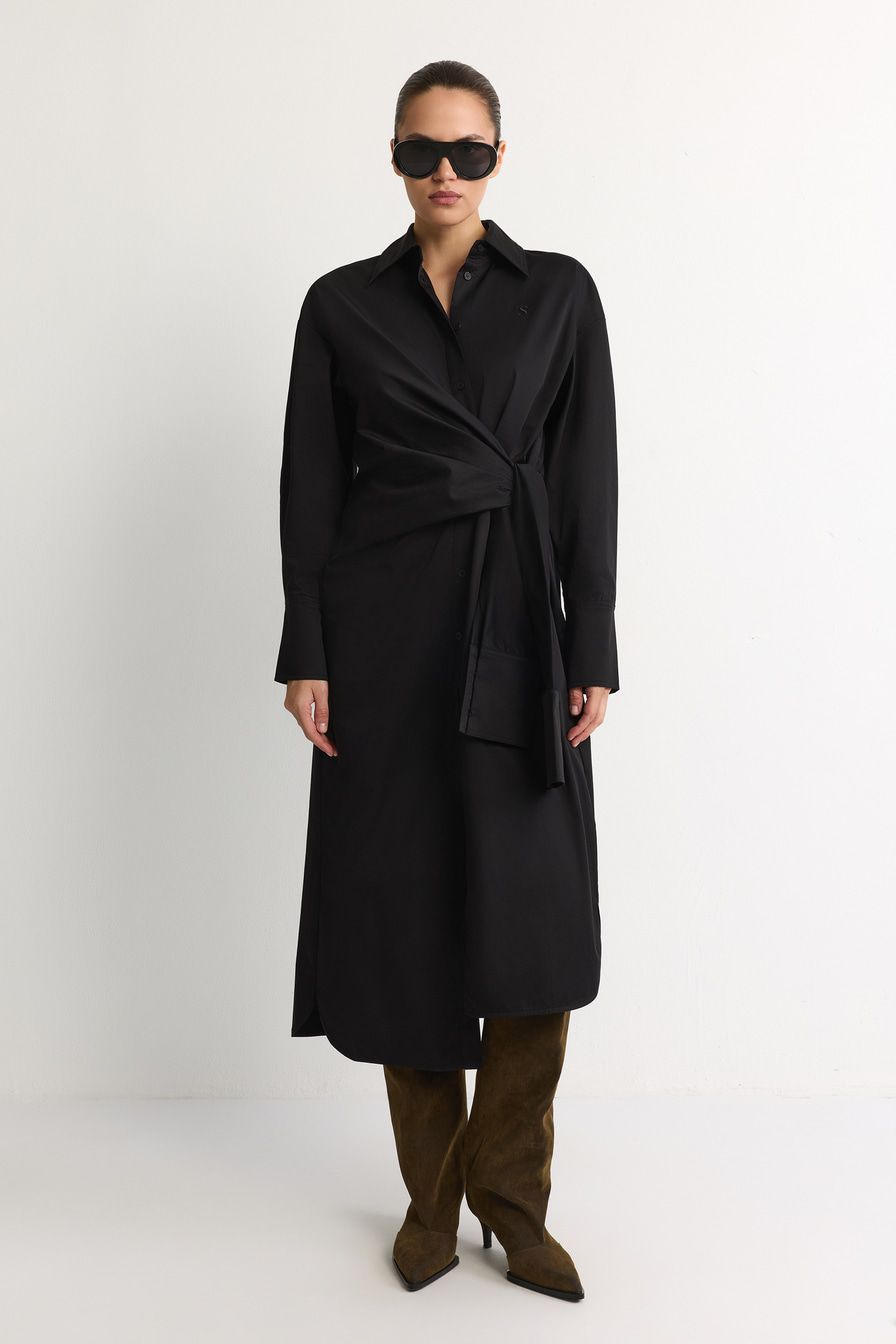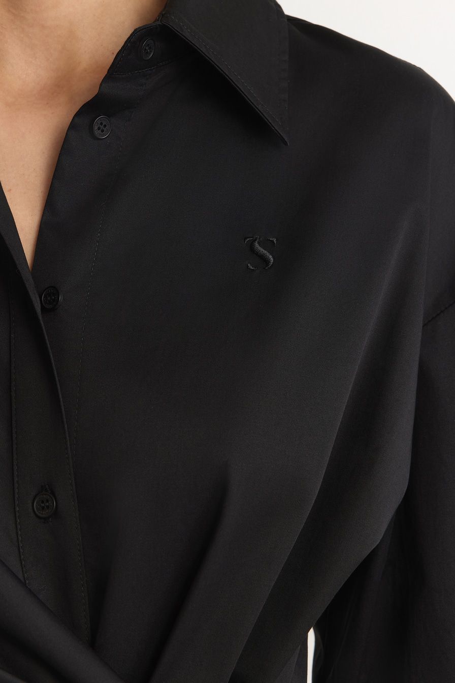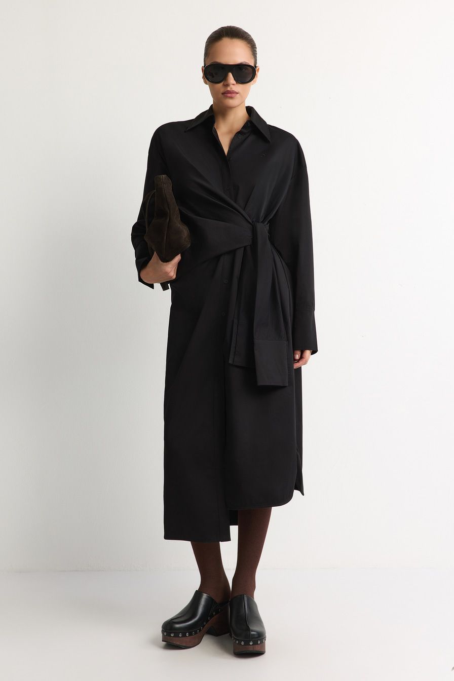 Черное платье-рубашка из смесового хлопка – модель свободного асимметричного кроя. Платье дополнено декоративными рукавами, которые завязываются на талии.