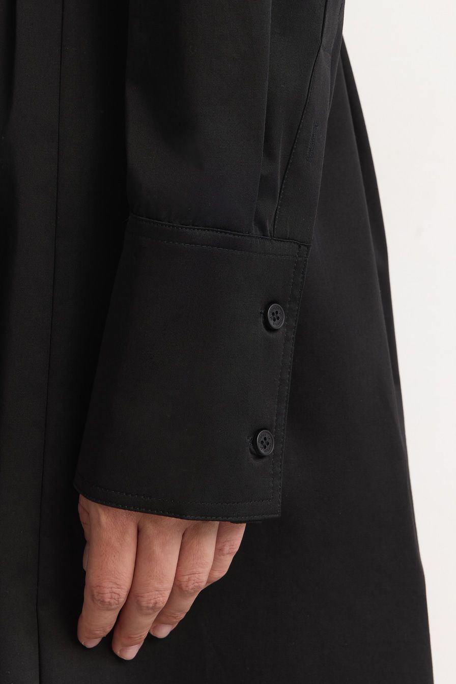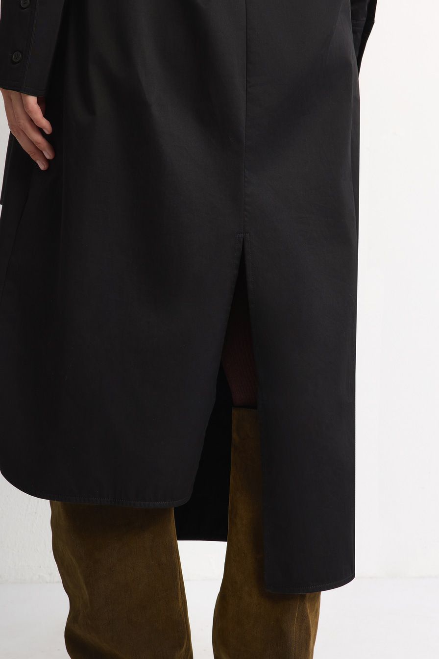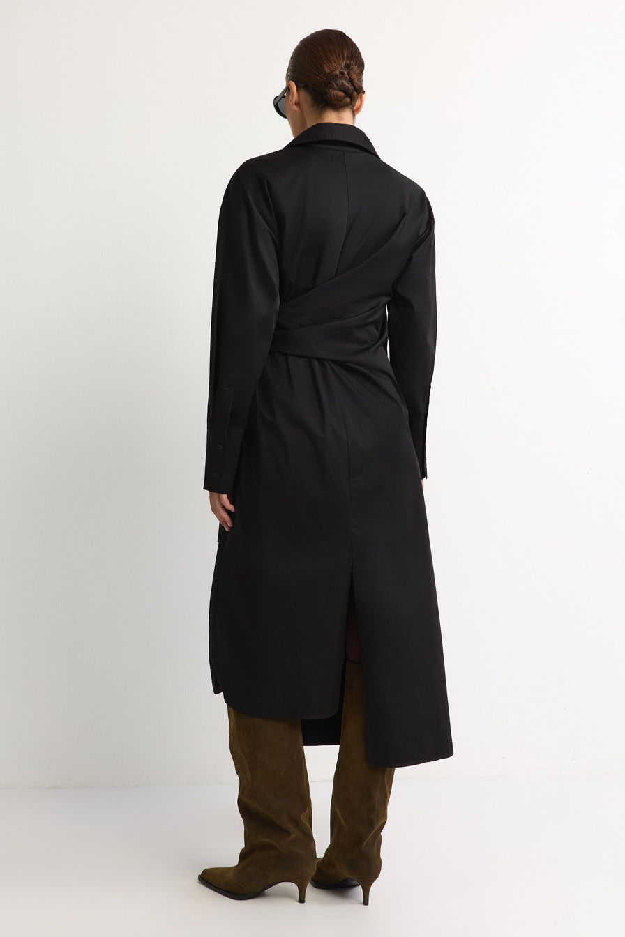 Черное платье-рубашка из смесового хлопка – модель свободного асимметричного кроя. Платье дополнено декоративными рукавами, которые завязываются на талии.