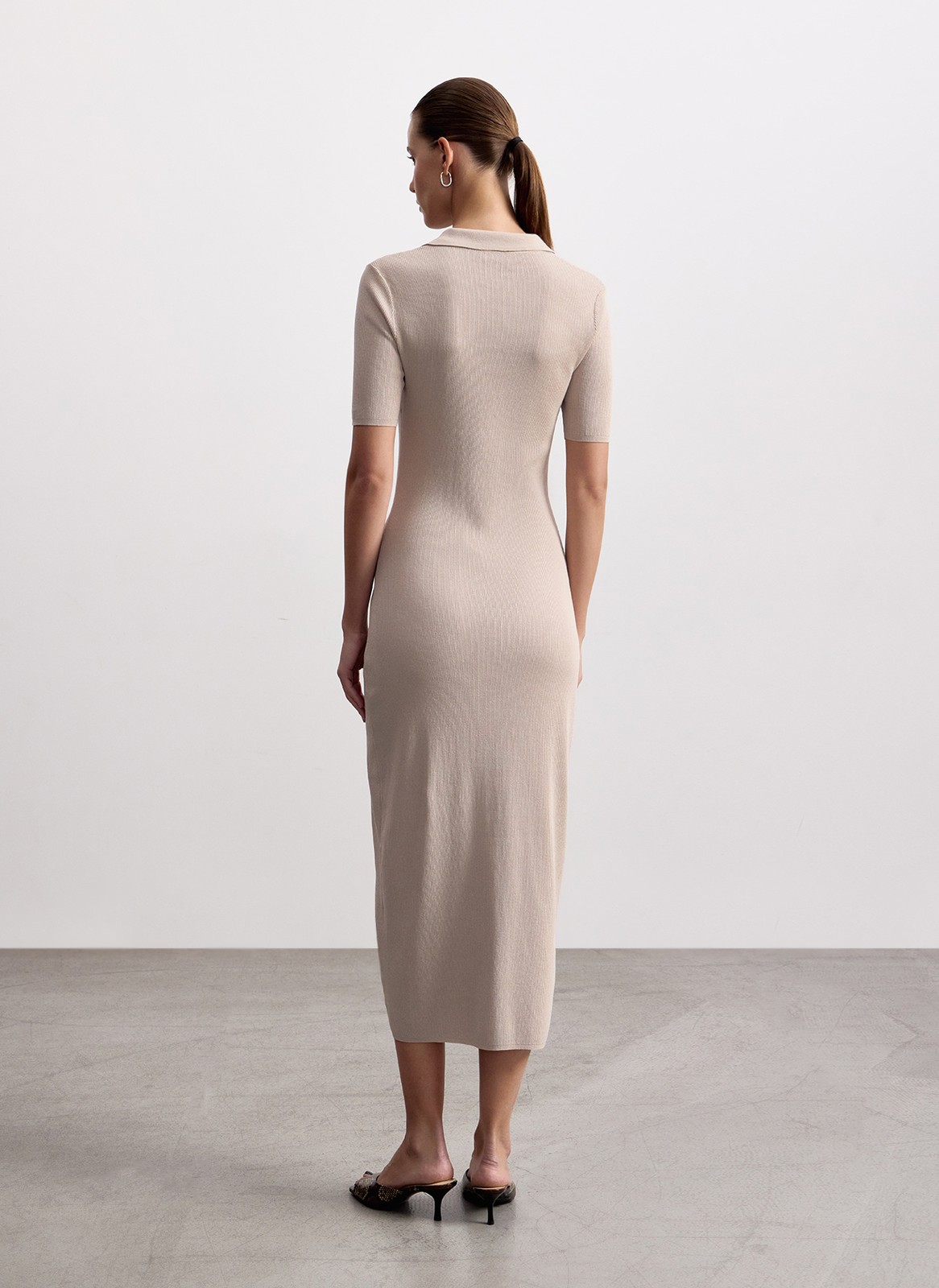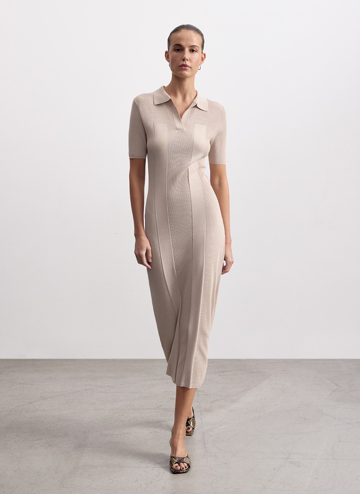 Платье с воротником поло станет идеальной основой для женственного и комфортного образа.