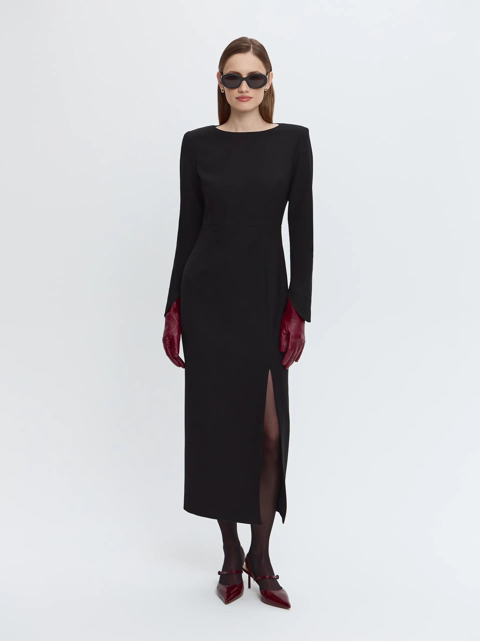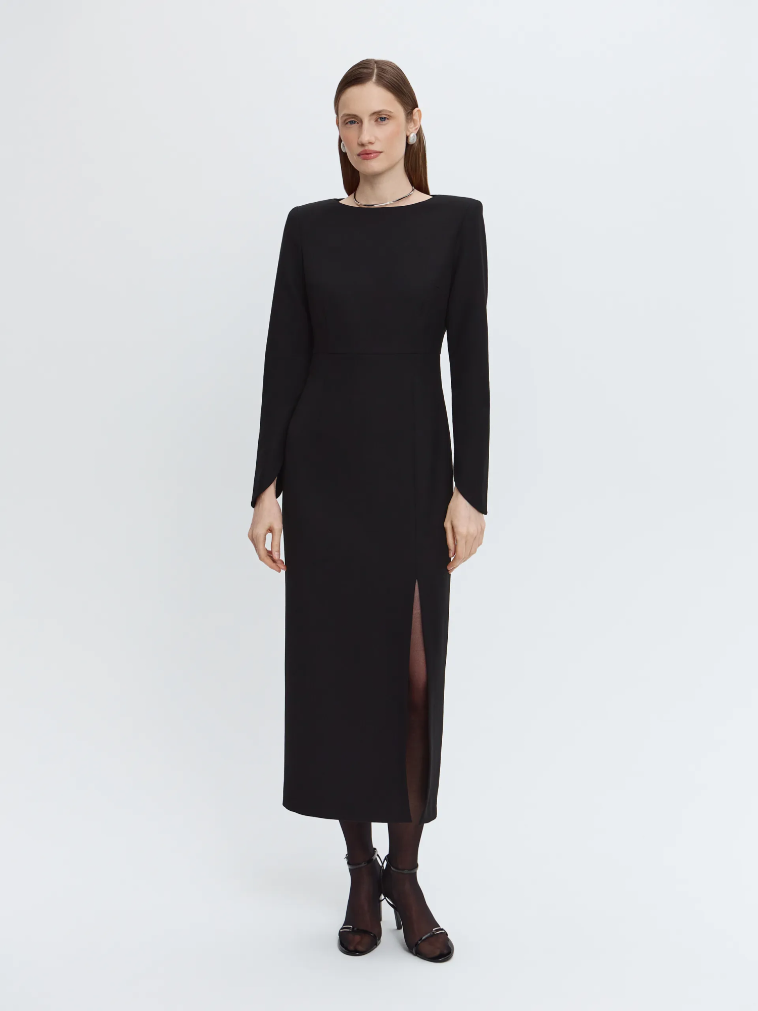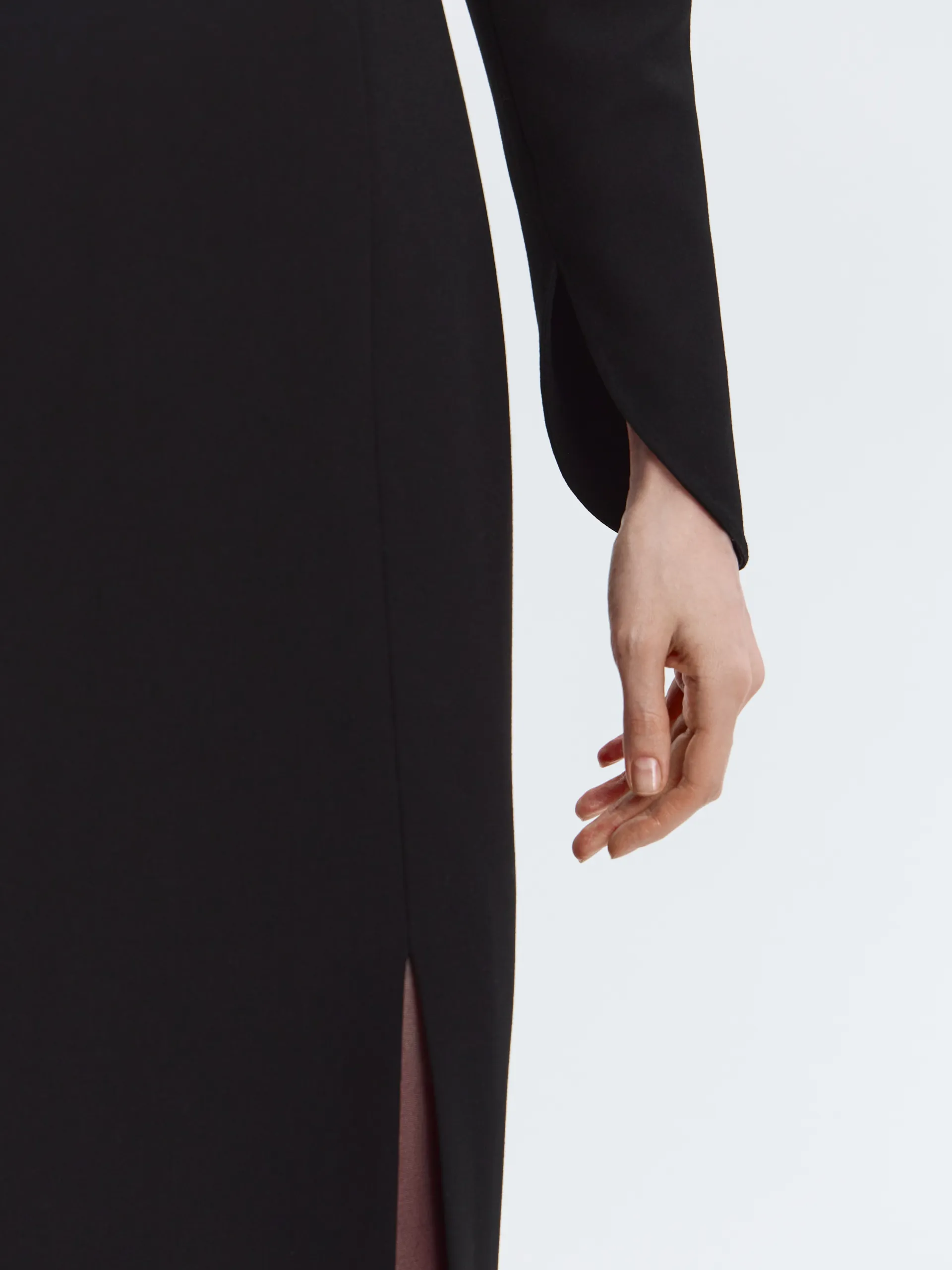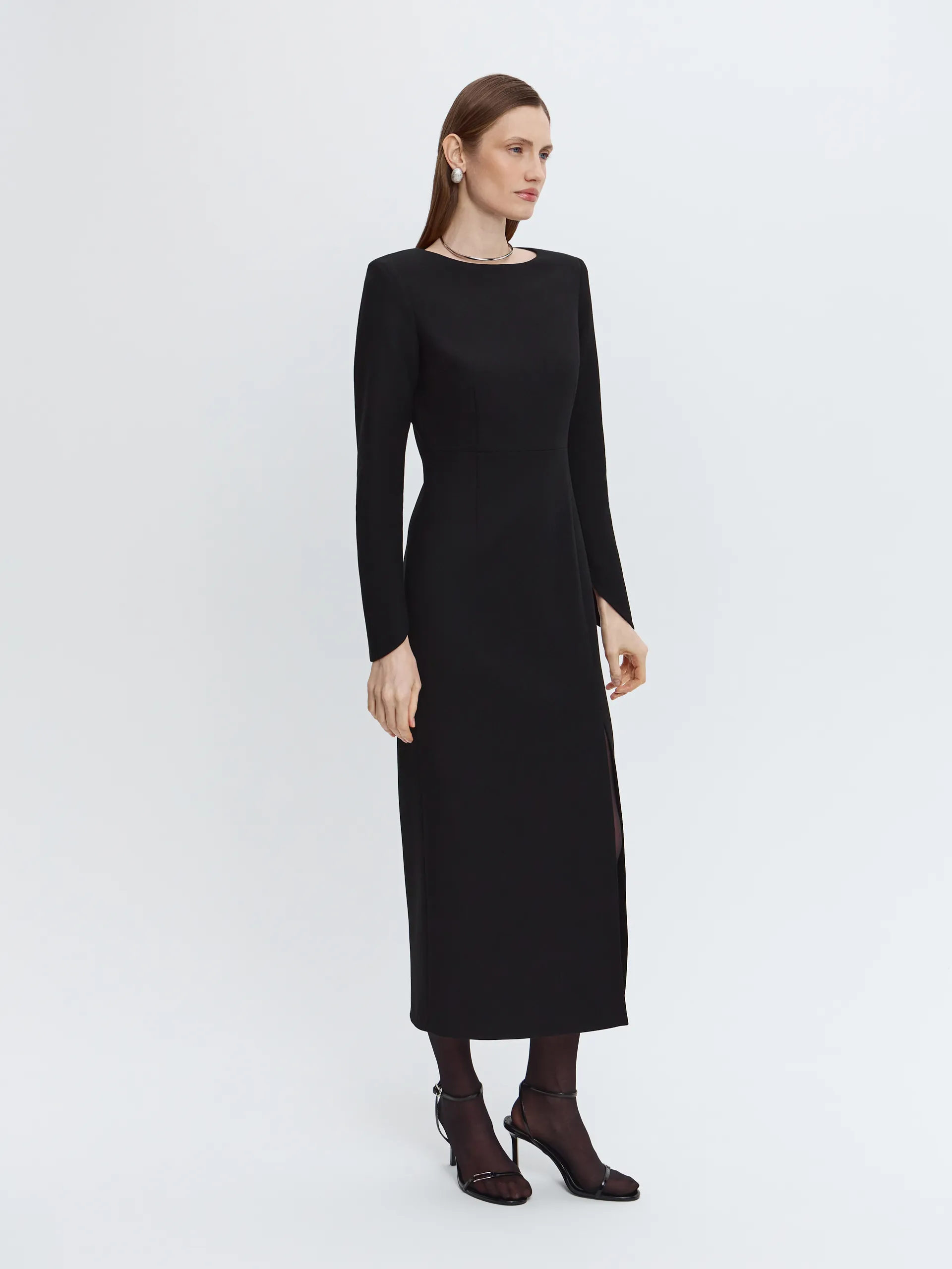 Модель в длине мидакси выполнена из плотной костюмной ткани, которая хорошо держит форму и подходит для офисного гардероба. Выверенный крой формирует аккуратный силуэт, подчёркивая линии фигуры без излишнего прилегания. О-образные рукава добавляют современный акцент, слегка завышенная линия талии визуально вытягивает пропорции, а боковой разрез обеспечивает комфорт и лёгкость движения.