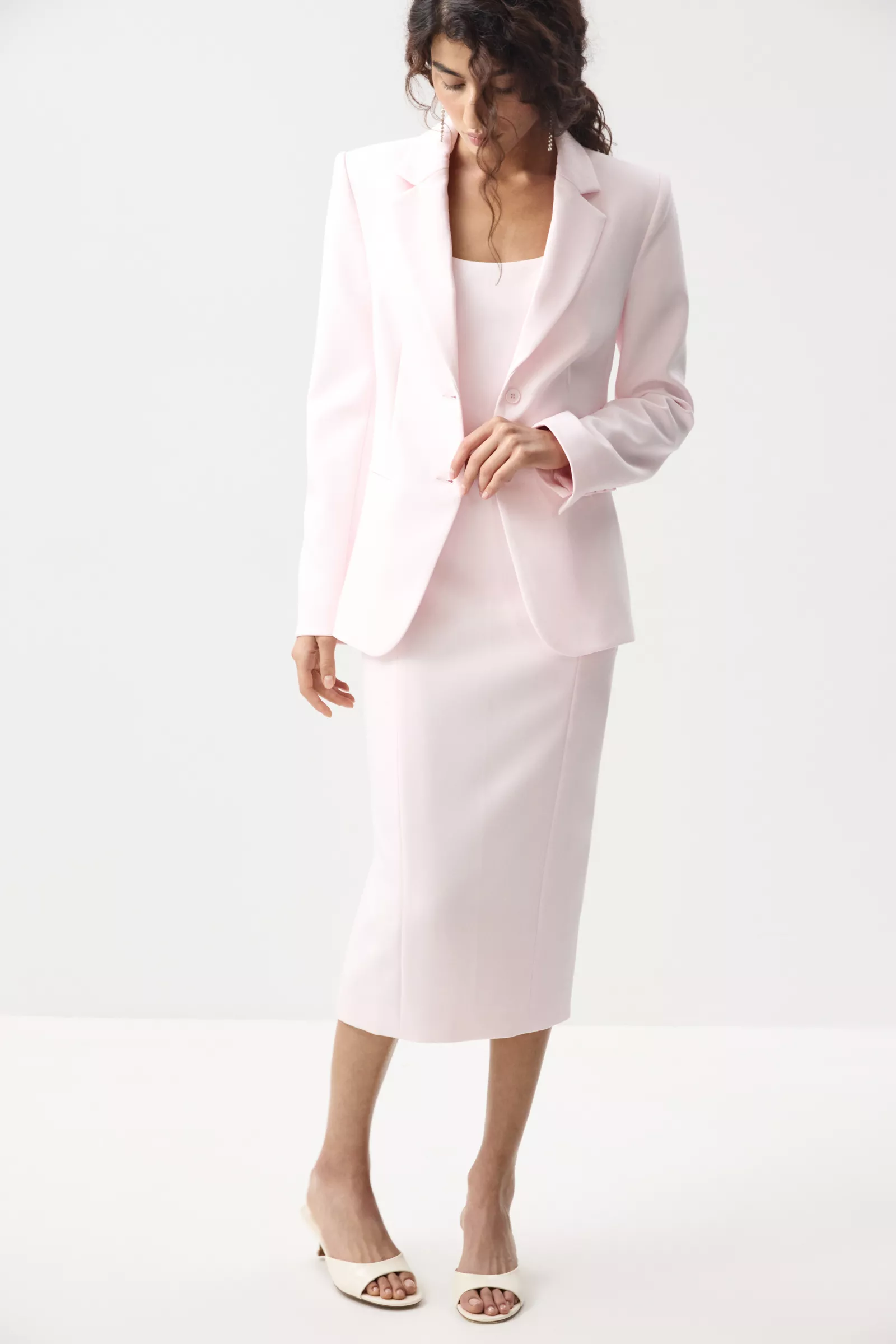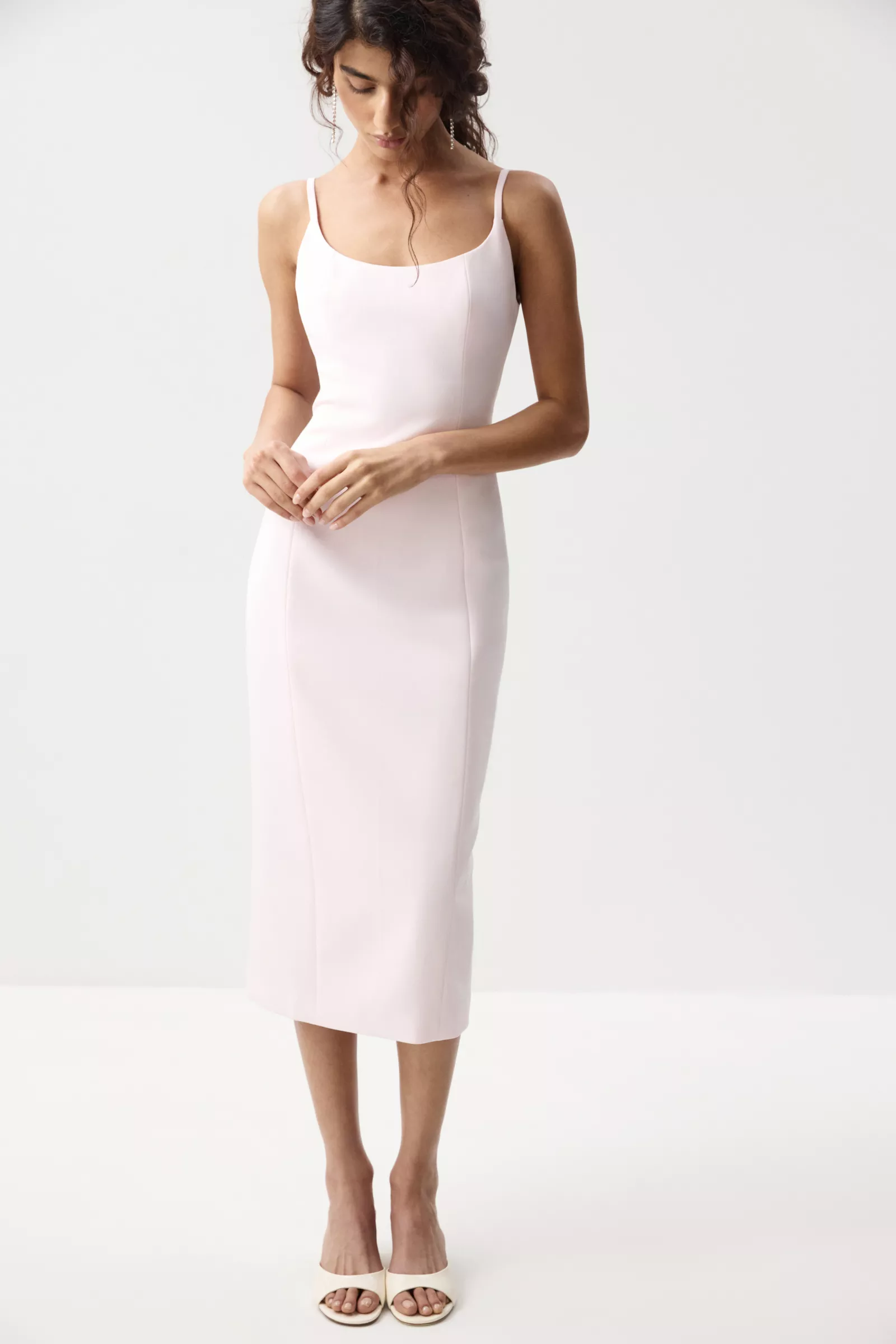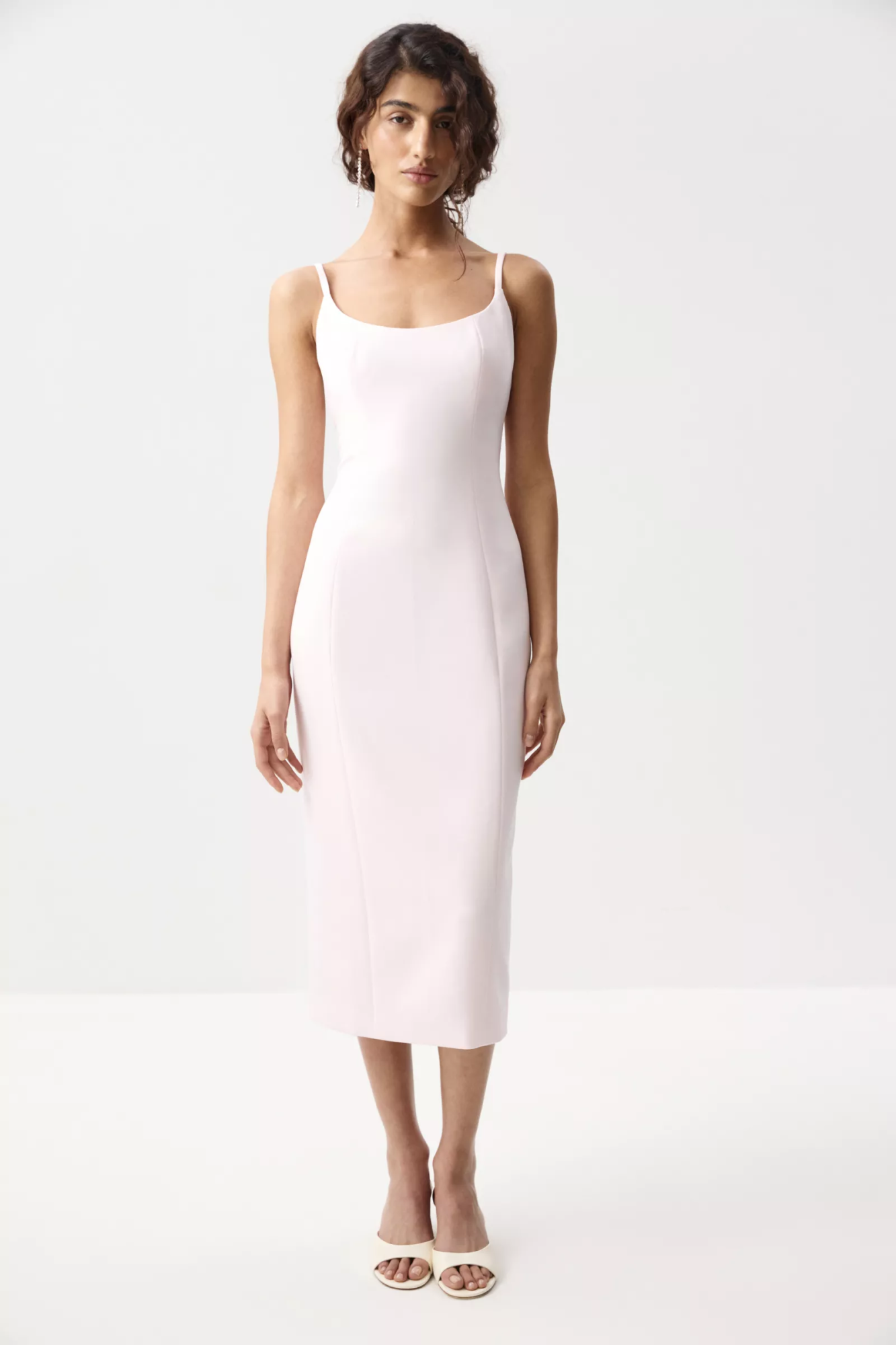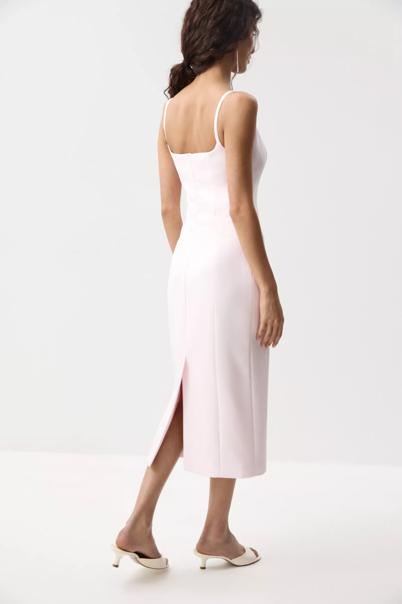 Платье макси из костюмной ткани на бретелях. Вертикальные рельеф образуют вытянутый силуэт, а глубокая горловина и тонкие бретели акцентируют внимание на декольте. Платье на подкладке с застежкой на тесьму молнию в среднем шве спинки. По спинке шлица, для удобства ходьбы.