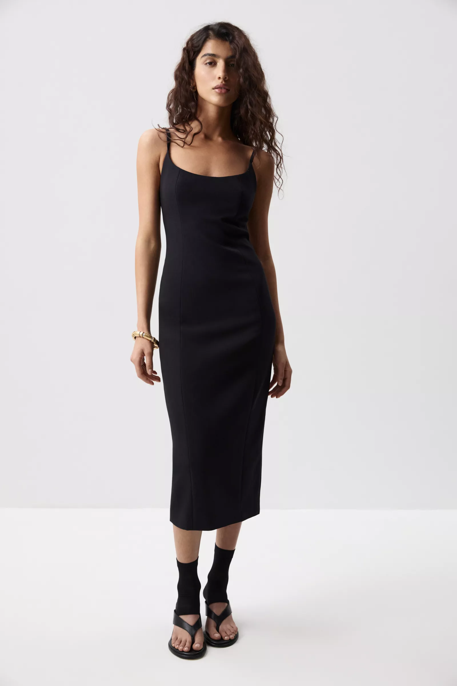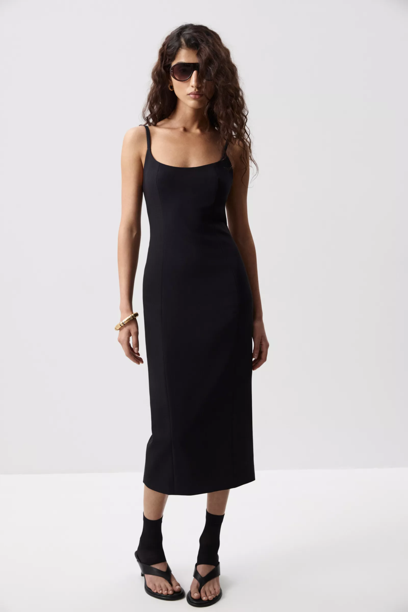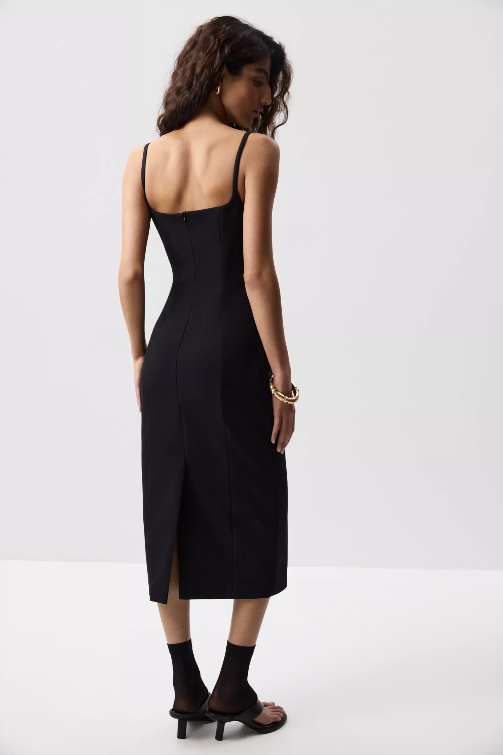 Платье макси из костюмной ткани на бретелях. Вертикальные рельеф образуют вытянутый силуэт, а глубокая горловина и тонкие бретели акцентируют внимание на декольте. Платье на подкладке с застежкой на тесьму молнию в среднем шве спинки. По спинке шлица, для удобства ходьбы.