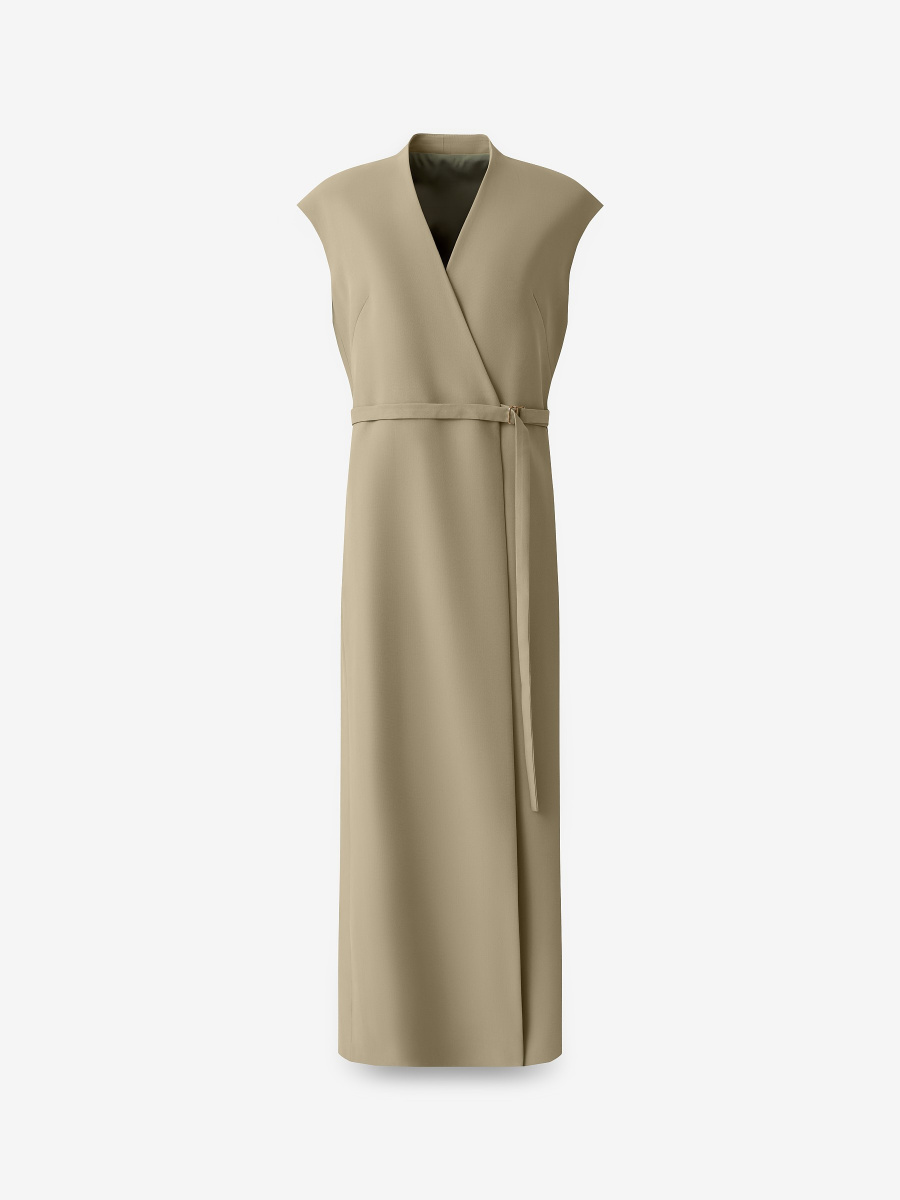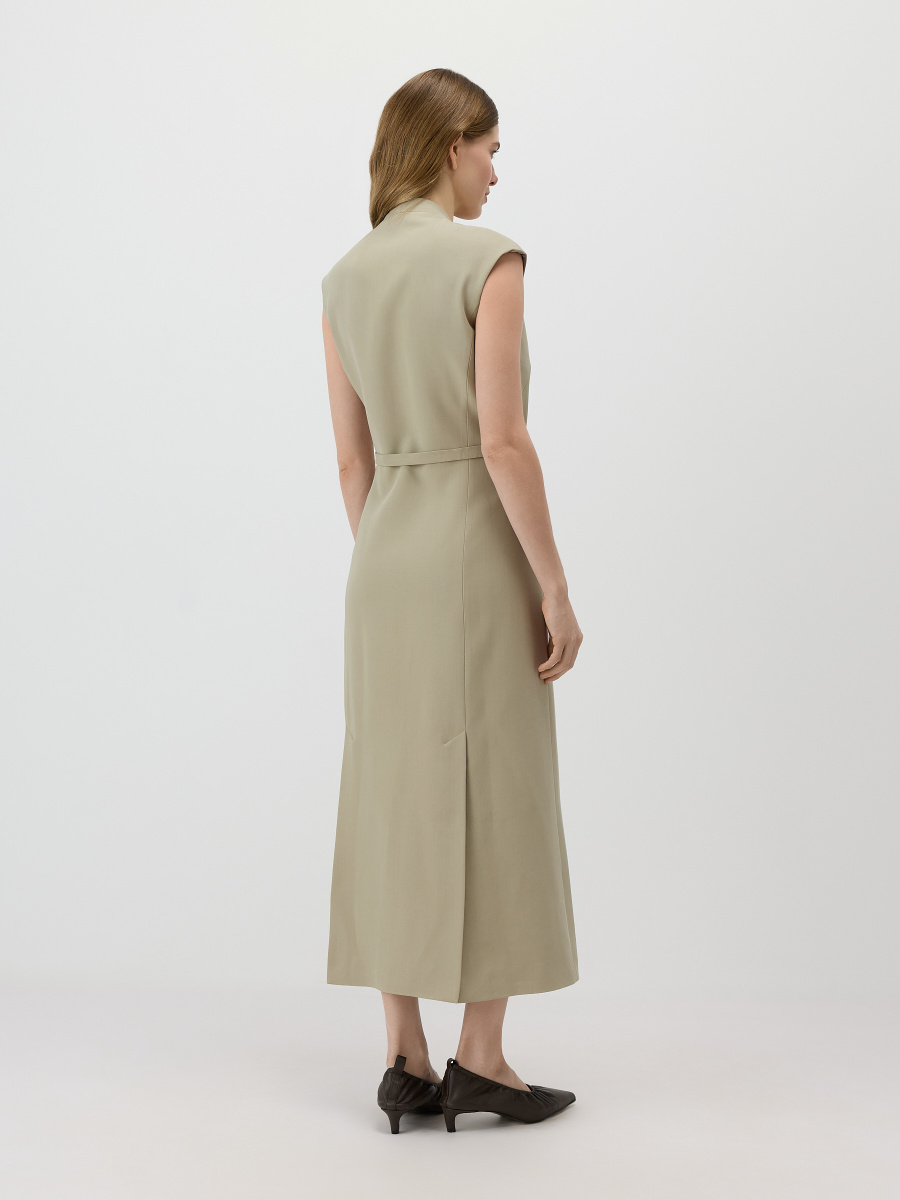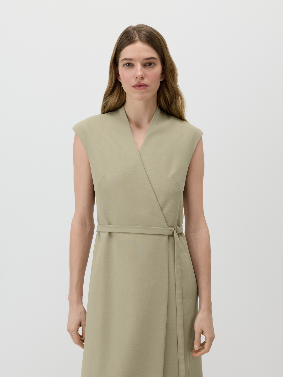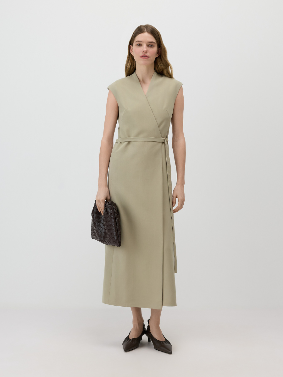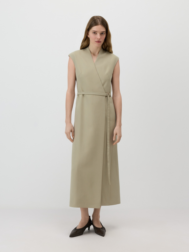 Полуприлегающее платье мидакси из 100% лиоцелла, или «древесного шелка» — натурального немнущегося материала, который пропускает воздух и обладает антибактериальными свойствами. Архитектура сочетает женственность и строгость: акцентный V-образный вырез, графичное плечо на мягких подплечниках, пояс-застежка для моделирования посадки. Модель дополнена боковыми карманами, двойной шлицей и шелковистой подкладкой.