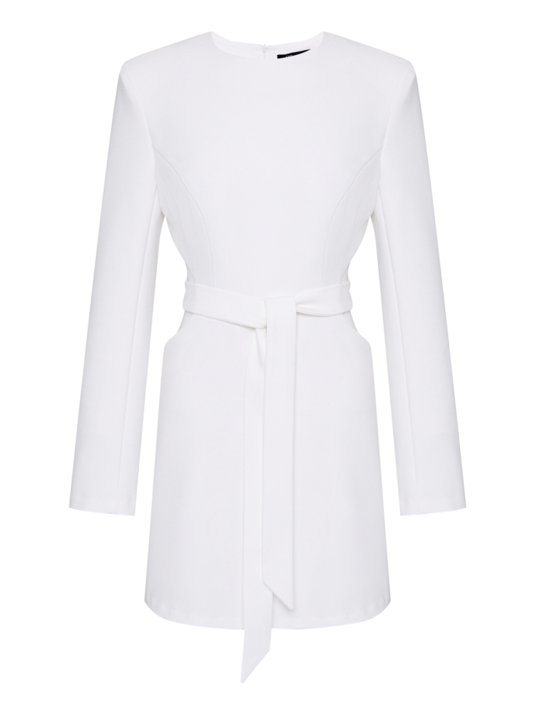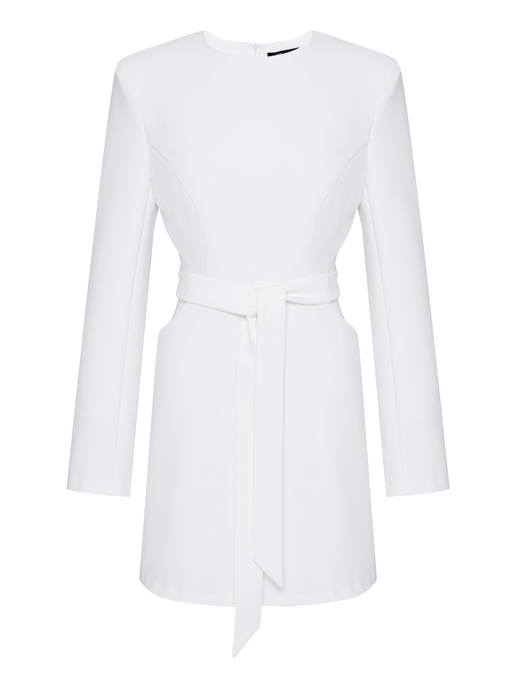 Мини-платье молочного цвета с вырезом на талии выполнено из комфортной ткани. Это модная и универсальная модель, которая будет уместна и в офисе, и на вечеринке. Для официальных мероприятий сочетайте платье с жакетом, а для вечернего выхода дополните его акцентными украшениями и клатчем из металлизированной кожи.