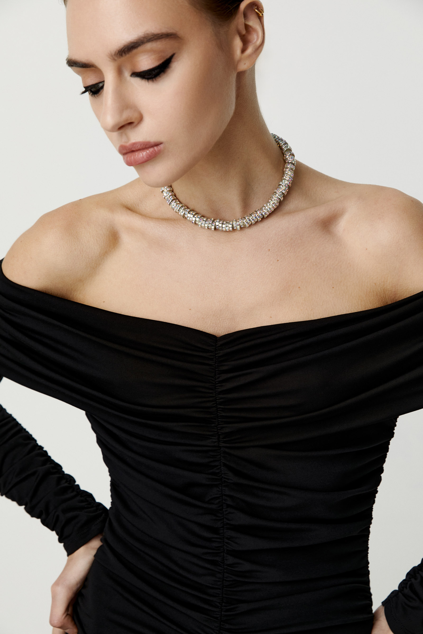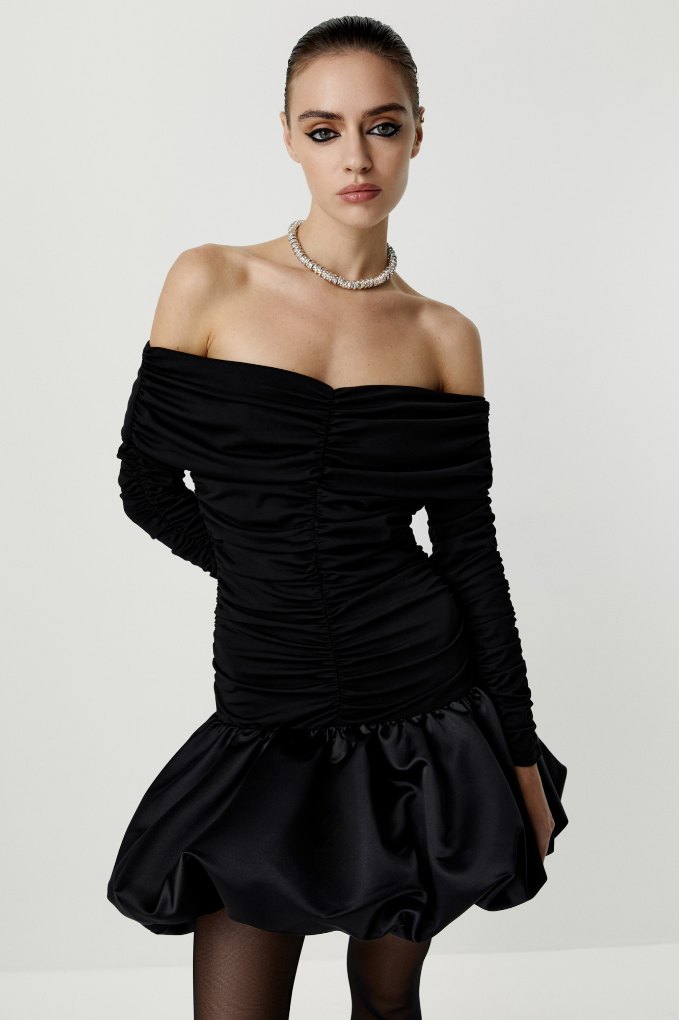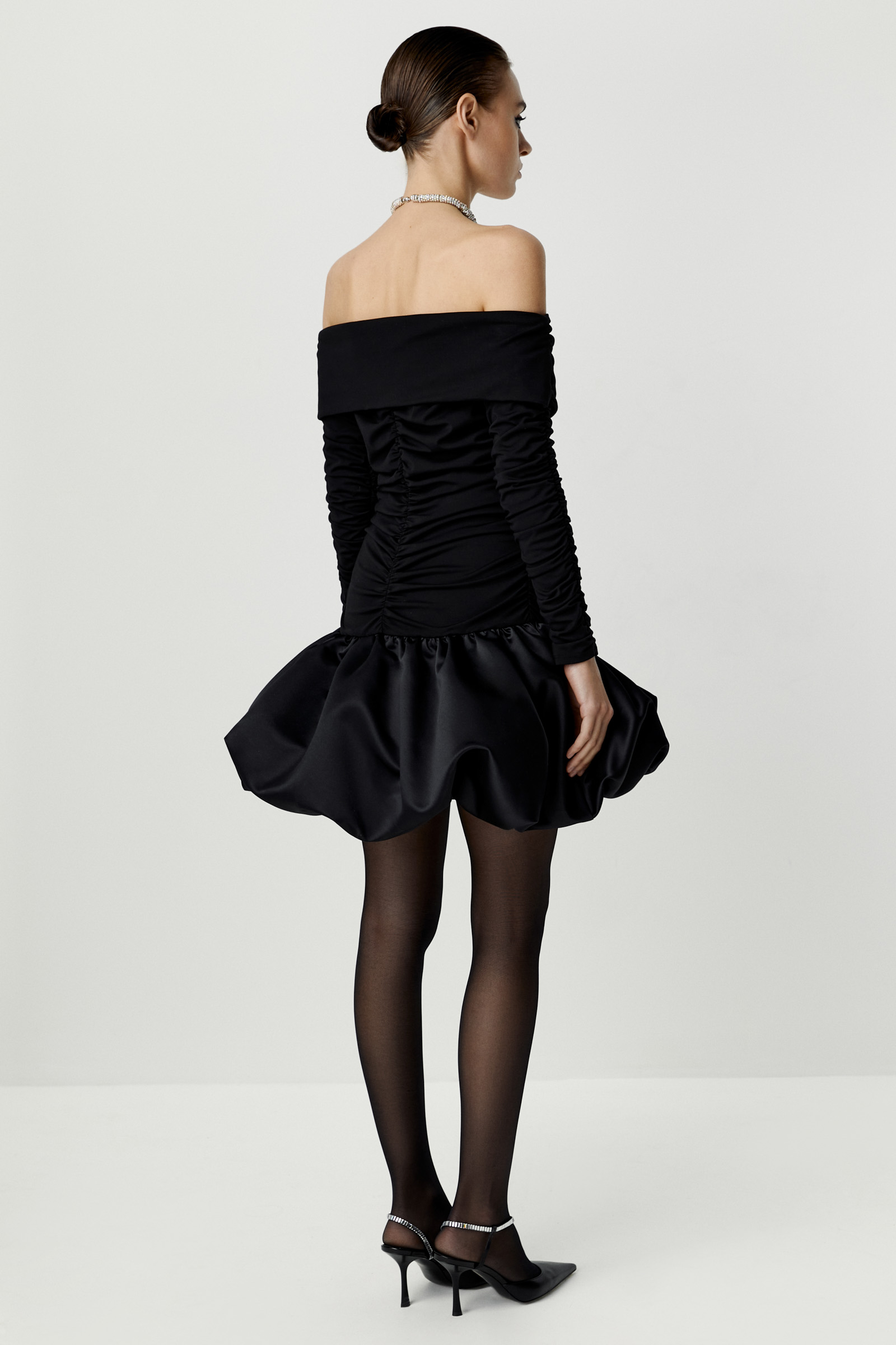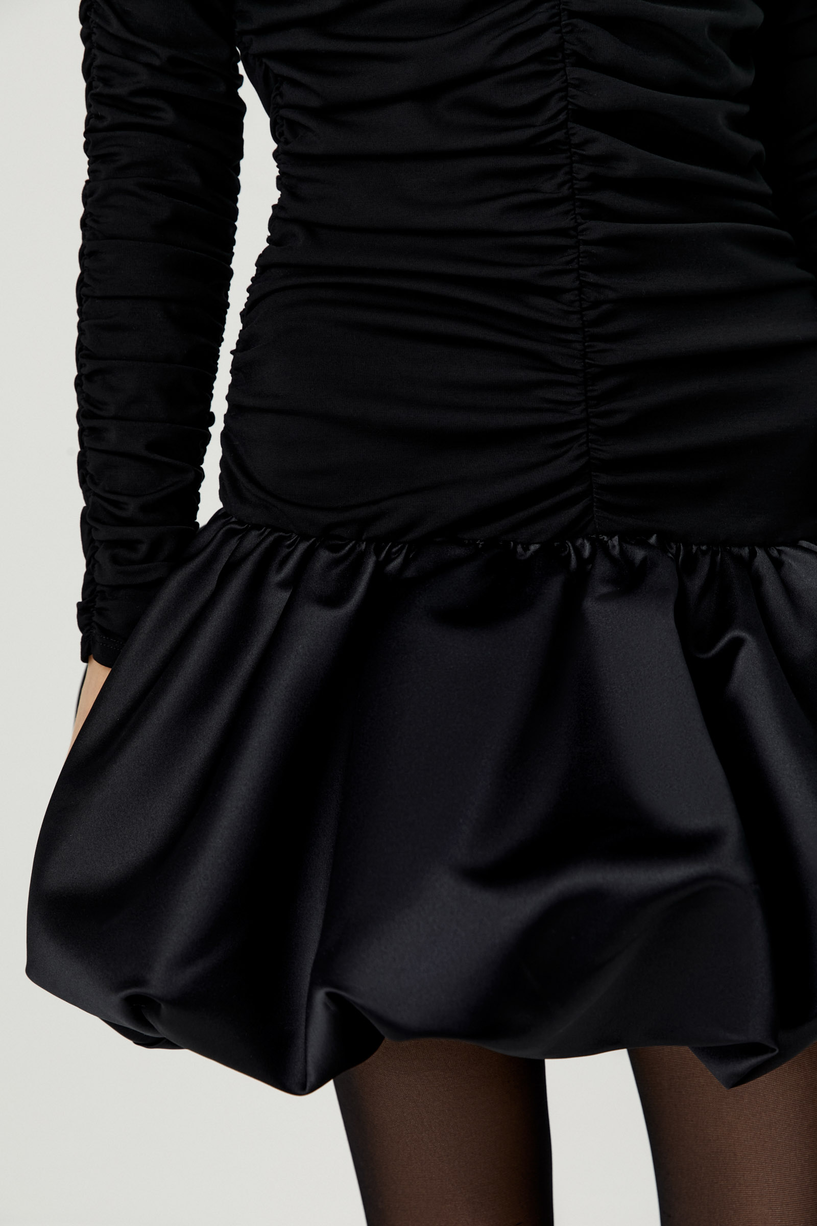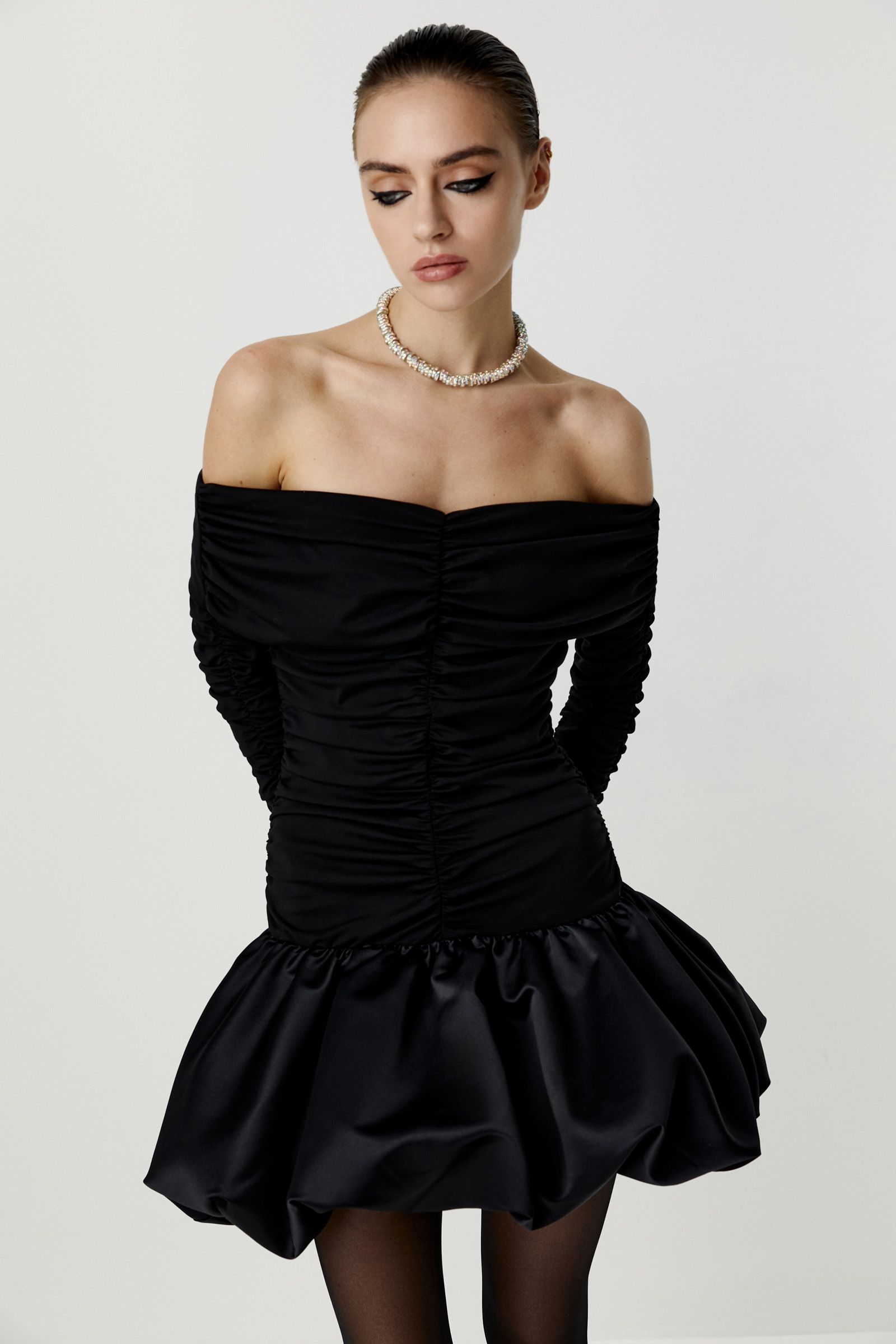 Коктейльное платье с драпировкой по всей длине и рукавам в длине мини. Модель выполнена облегающей и эффектно формирует силуэт песочные часы. Особой нарядности добавляет акцентная линия плеч и пышная заниженная юбка. Верх выполнен из легкого, тонкого матового трикотажа на основе вискозы — такой материал прекрасно дышит и отлично держит форму. Объемная юбка отшита из более формообразующей ткани с мягкой сеткой внутри.